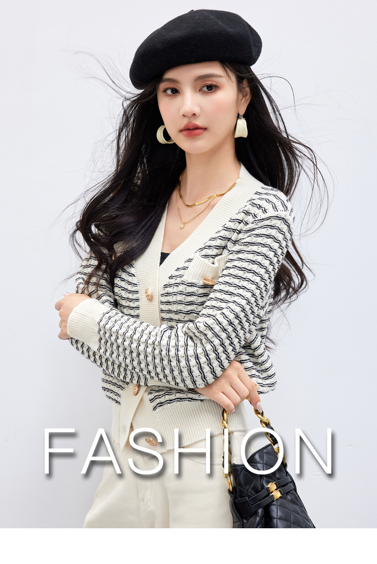Xiaoxiang 니트 카디건 최고의 여성 2024 년 겨울 새로운 중공업 대비 컬러 스트라이프 리브 텍스처 센스 V 넥 스웨터스토어 가기