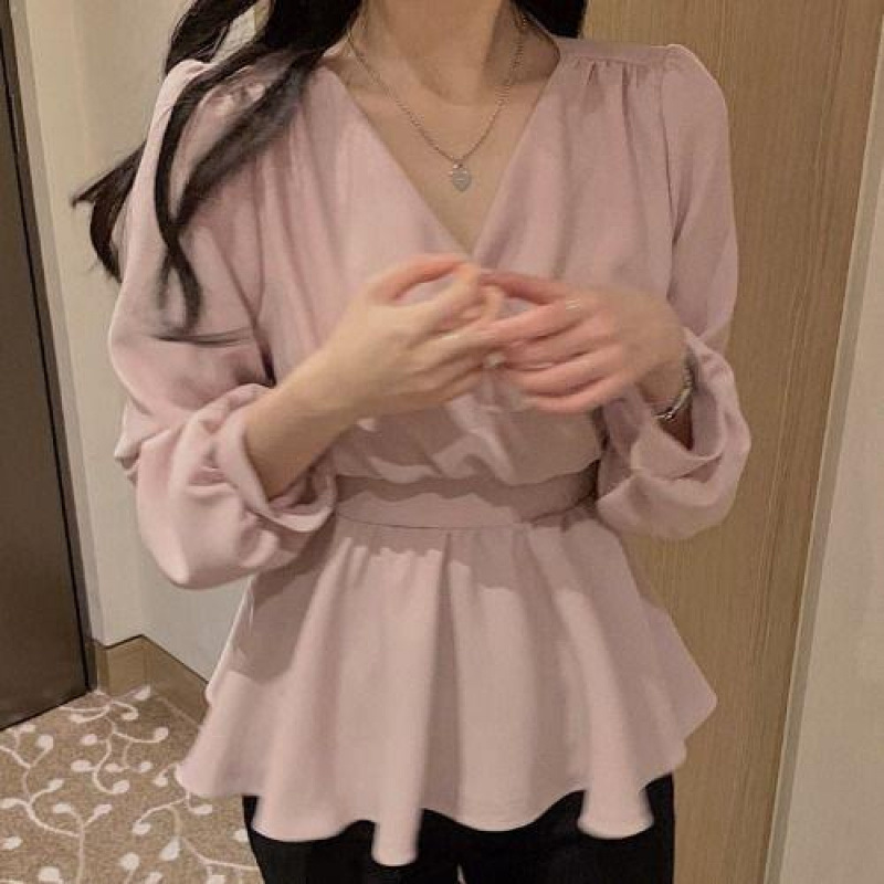 2025 봄과 가을 새로운 쉬폰 셔츠 우아한 칼라 슈퍼 요정 달콤한 우아한 타이트 허리 레이스 업 긴 소매 셔츠 최고 여성 의류스토어 가기
