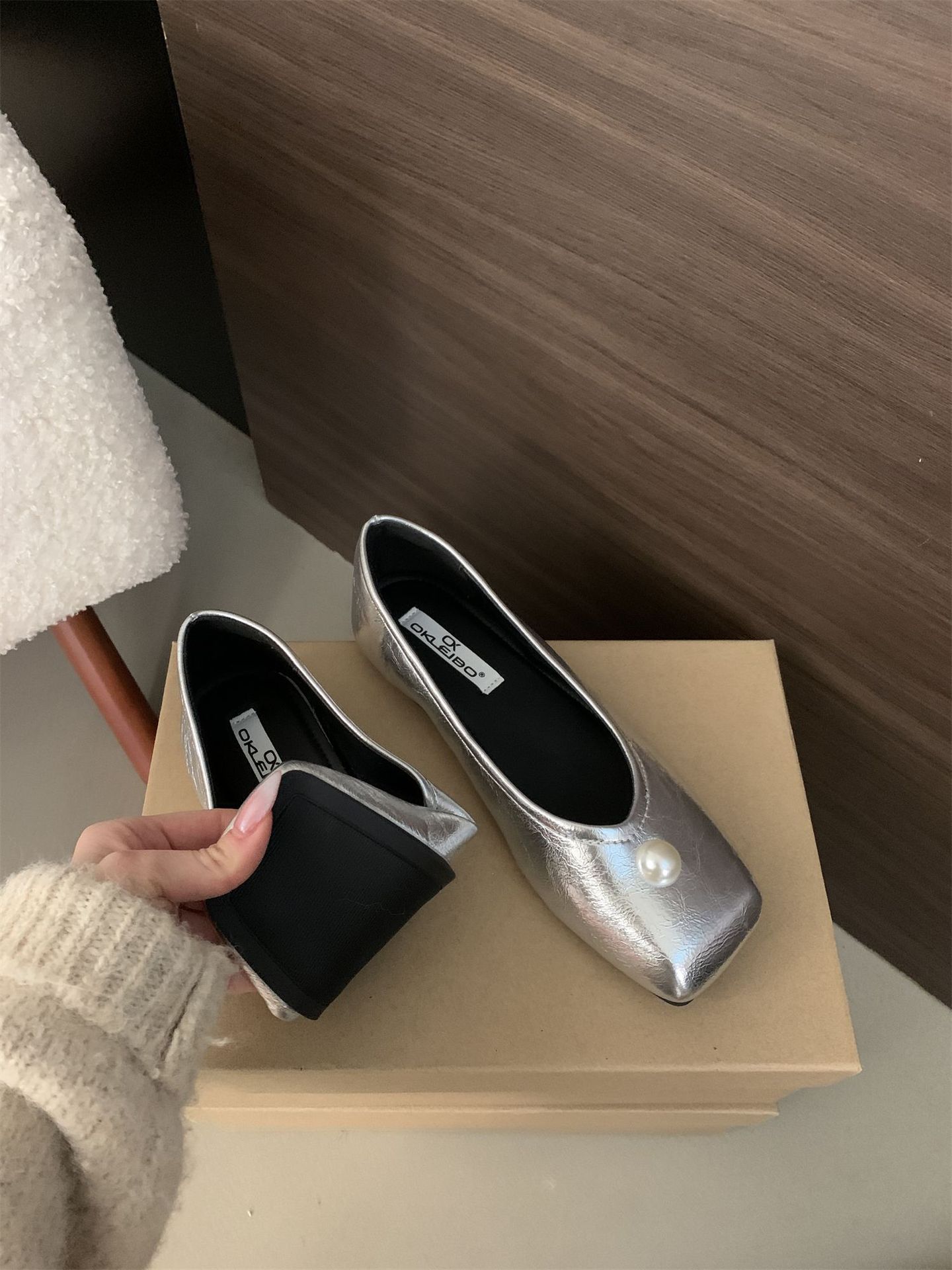 평평한 진주 광장 머리 실버 신발 여성 2025 봄 새 우유 신발 슬립 온 작업 신발스토어 가기