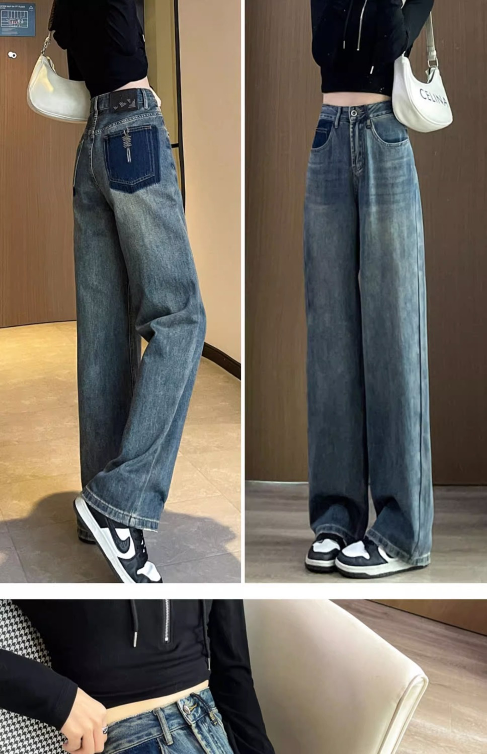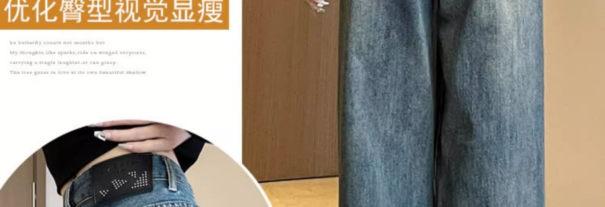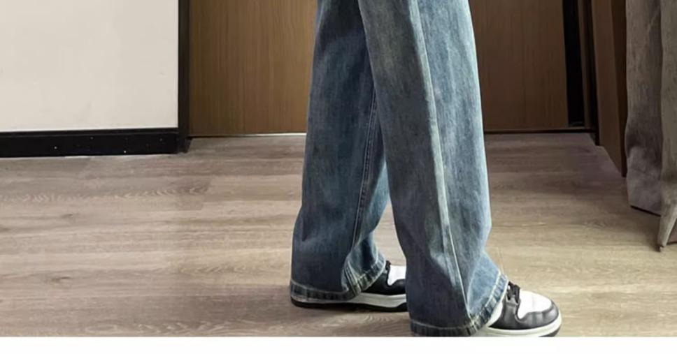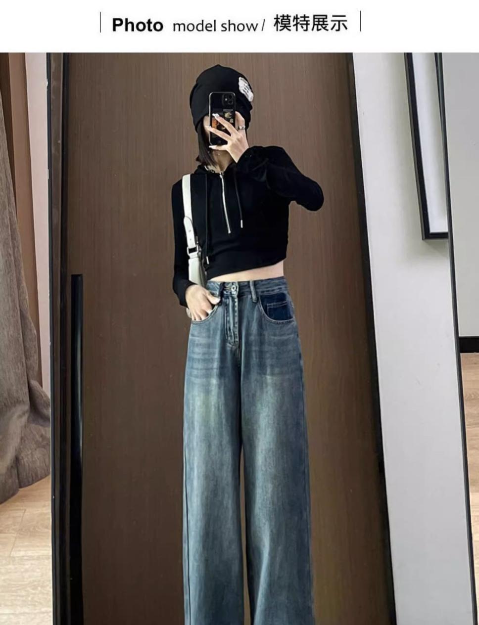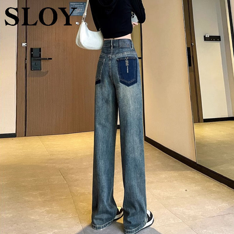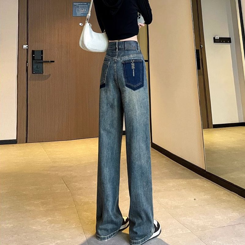 스트레이트 레그 청바지 여성의 봄과 가을 새로운 디자인 컬러 대비 높은 허리 슬리밍 레트로 딥 플로어 와이드 레그 팬츠스토어 가기