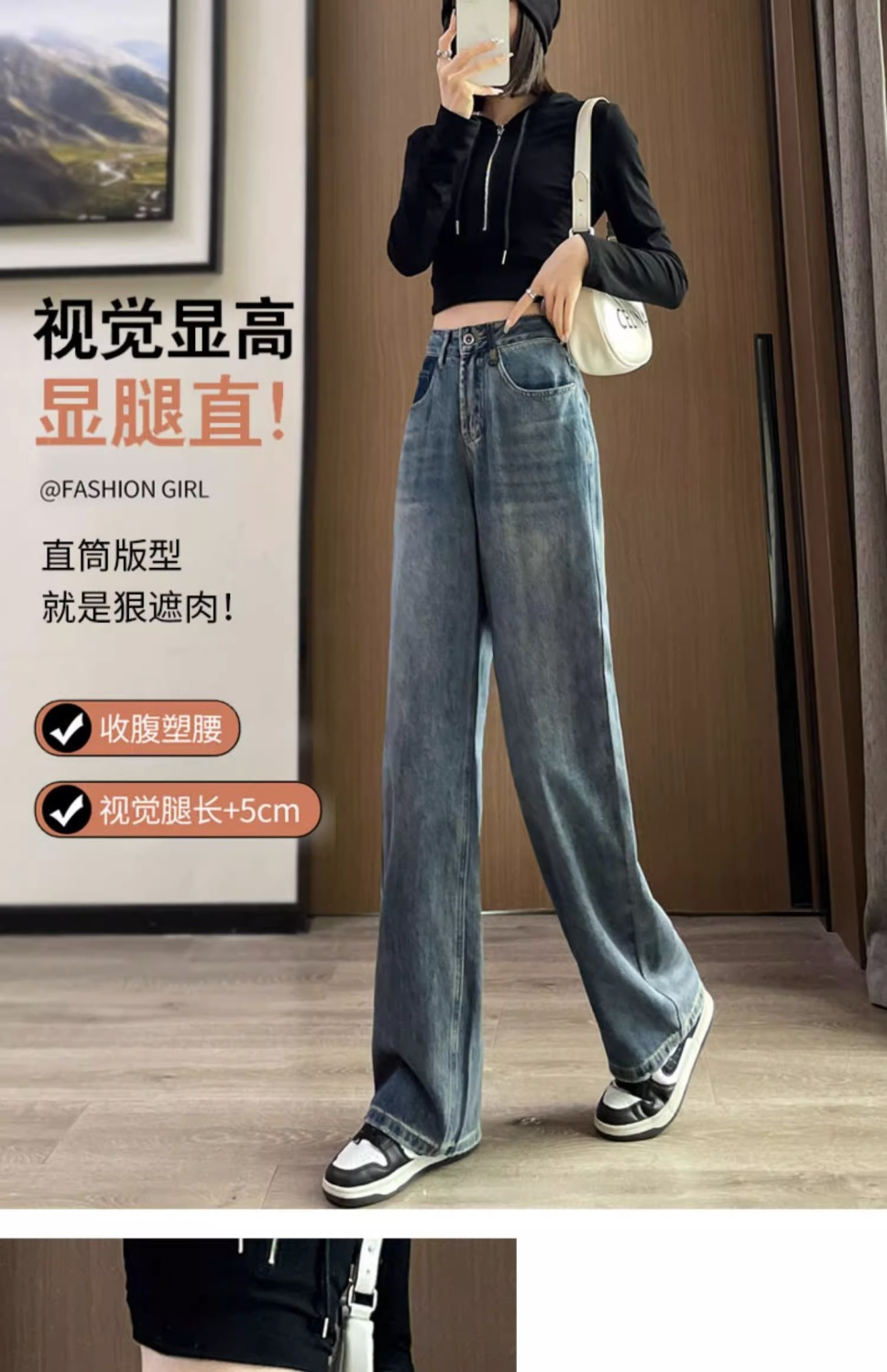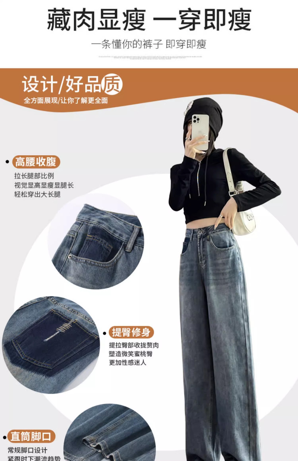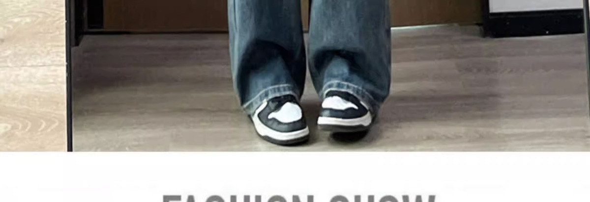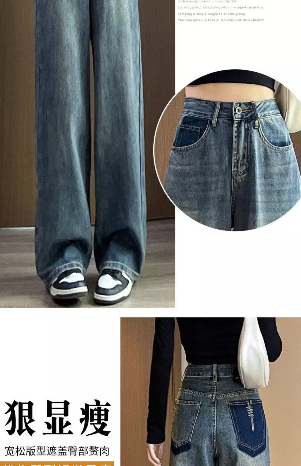 스트레이트 레그 청바지 여성의 봄과 가을 새로운 디자인 컬러 대비 높은 허리 슬리밍 레트로 딥 플로어 와이드 레그 팬츠스토어 가기