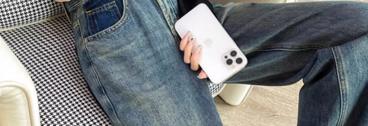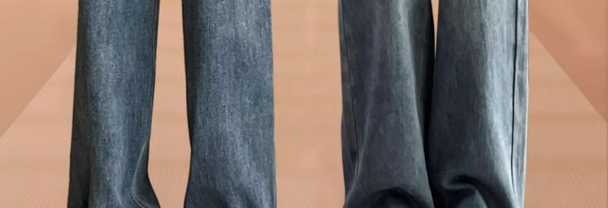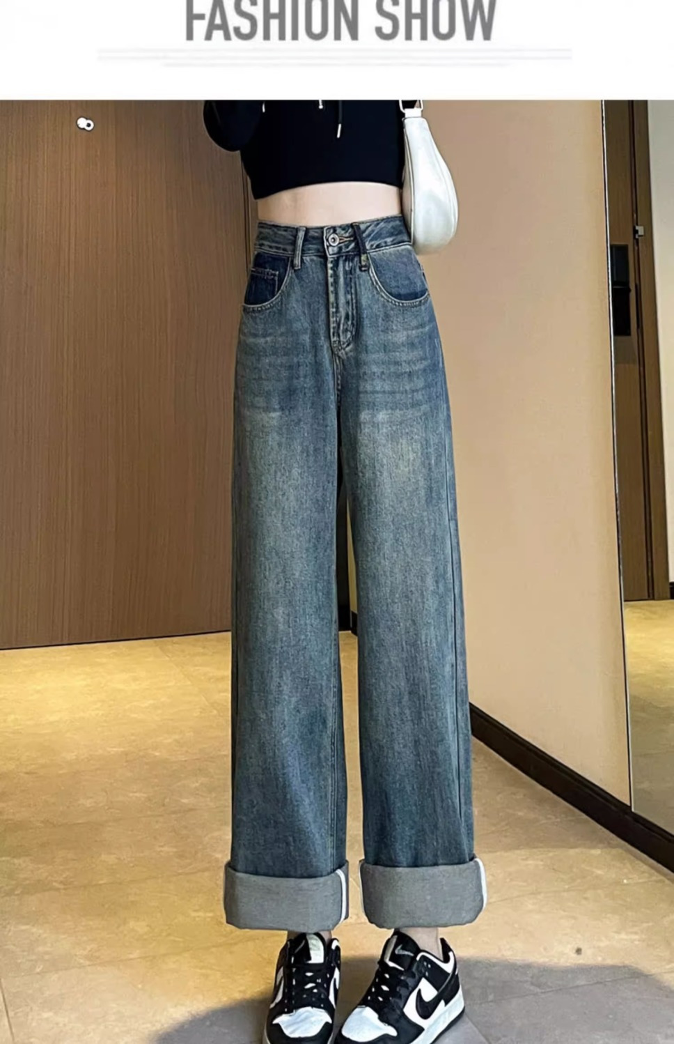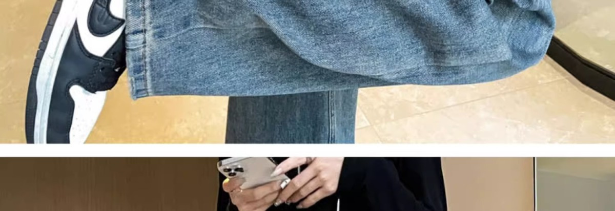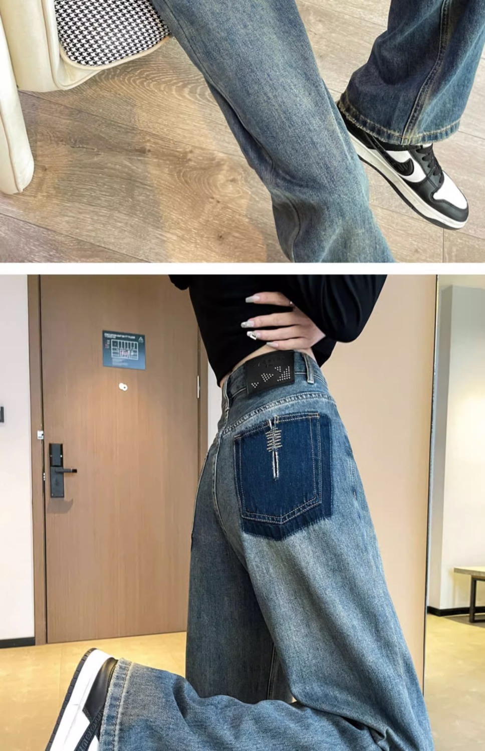 스트레이트 레그 청바지 여성의 봄과 가을 새로운 디자인 컬러 대비 높은 허리 슬리밍 레트로 딥 플로어 와이드 레그 팬츠스토어 가기