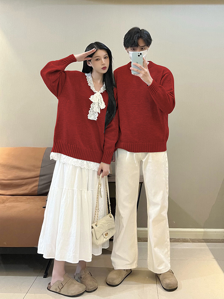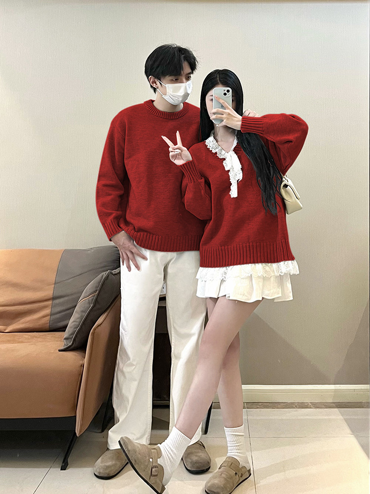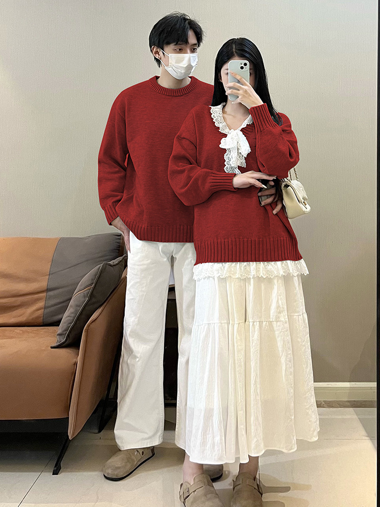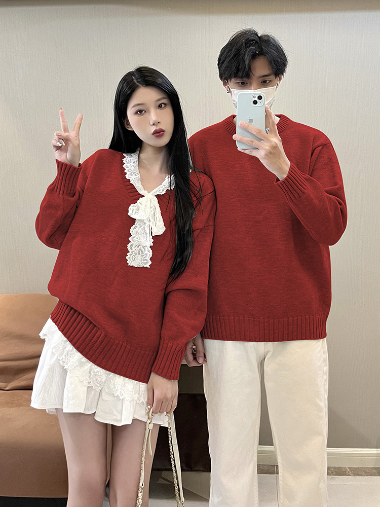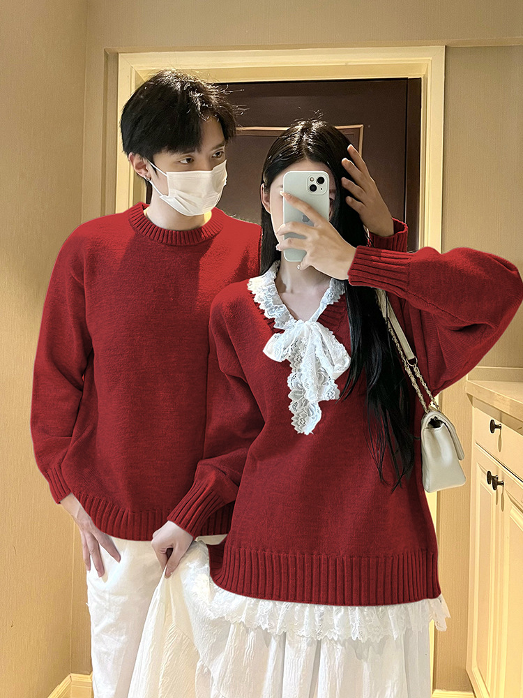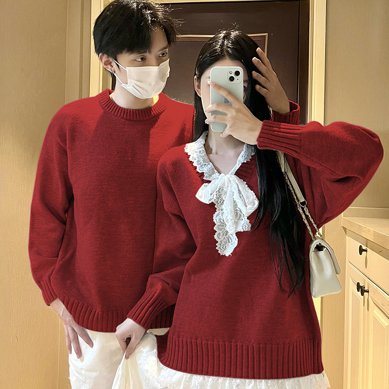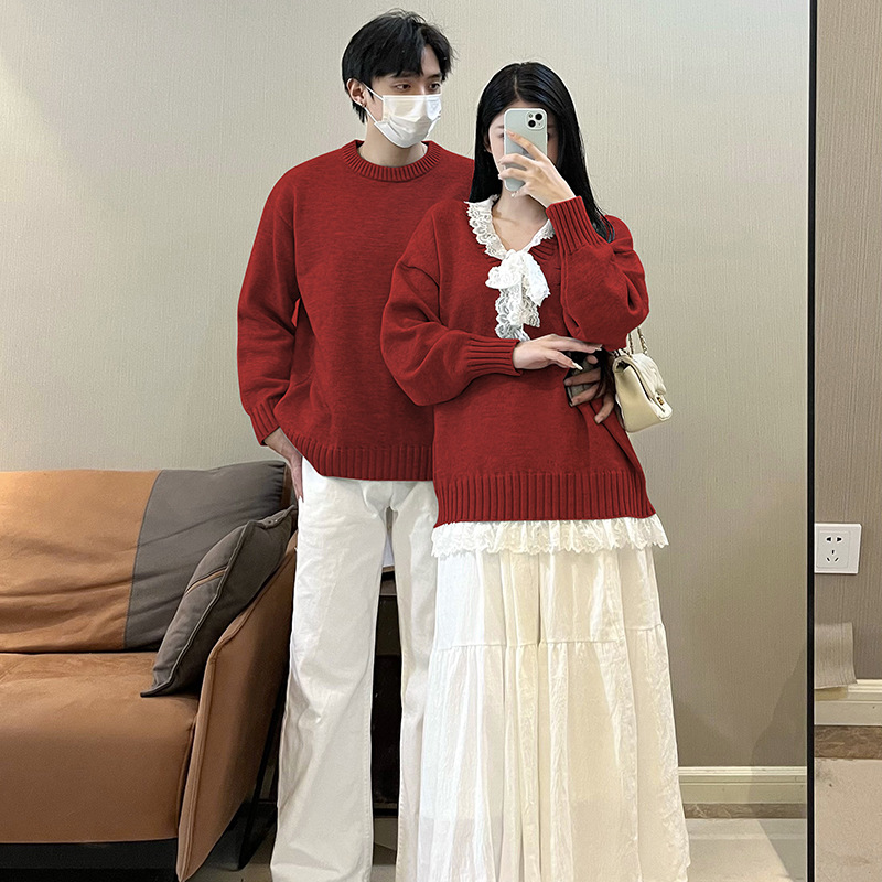 2025 년 새해 게으른 바람 레이스 커플 원피스 빨간 양모 니트 셔츠 긴 소매 자켓 남녀 국경 머리스토어 가기