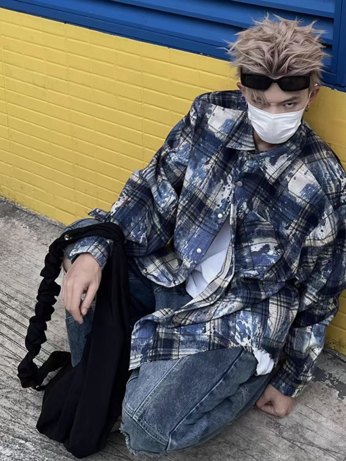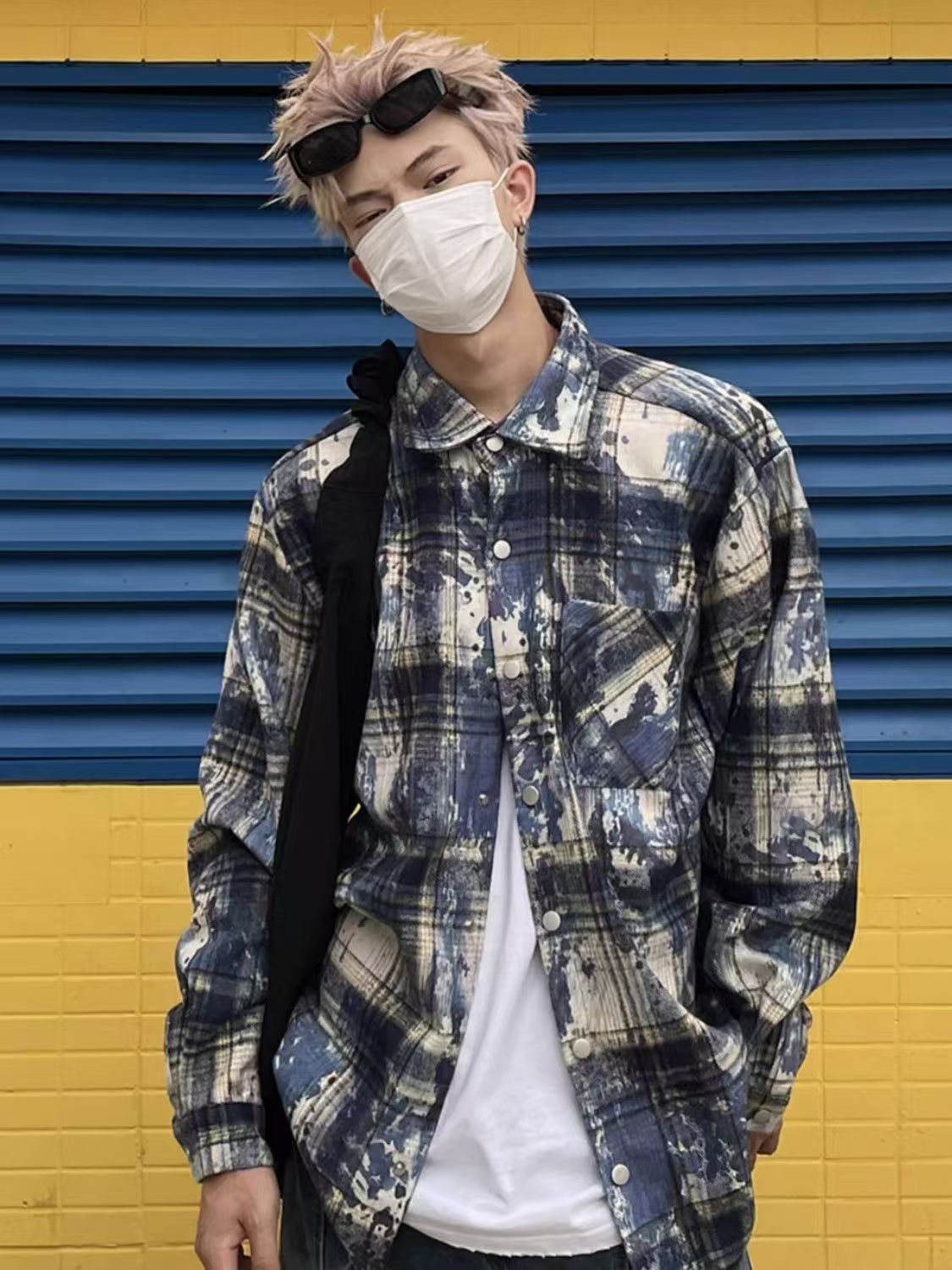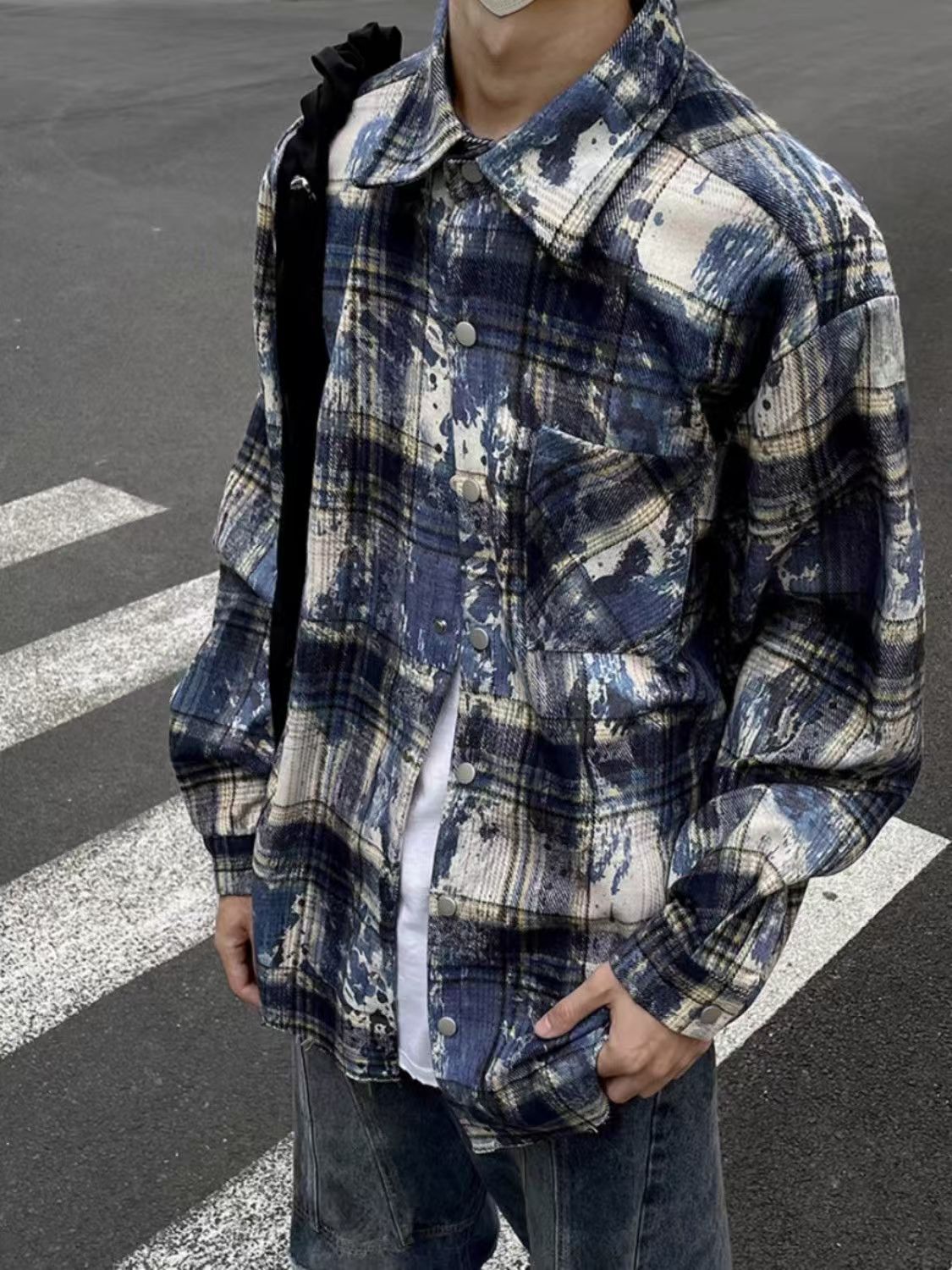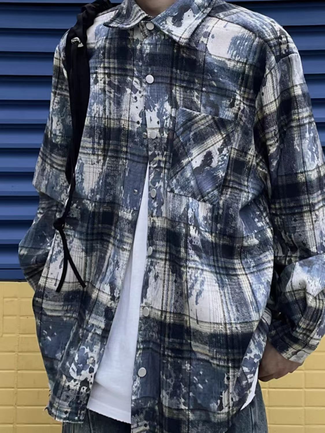 미국식 레트로 잉크 넥타이 염색 격자 무늬 셔츠 남성 봄과 가을 하이 스트리트 더피 핸섬 느슨한 캐주얼 셔츠 코트 탑