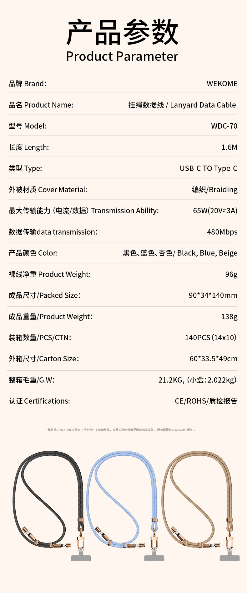 WEKOME 휴대 전화 끈 데이터 케이블 안드로이드 65W 애플 PD 빠른 충전 꼰 목 슬렁 충전 케이블