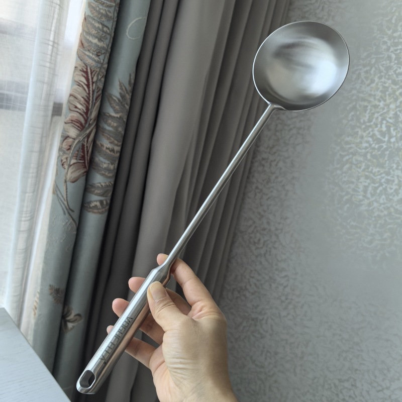 不锈钢精工炒勺,182克。总长39.8厘米,勺头宽9.3厘米