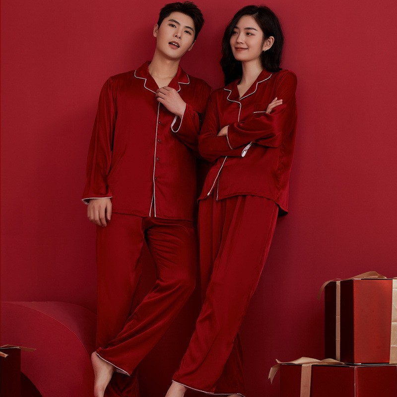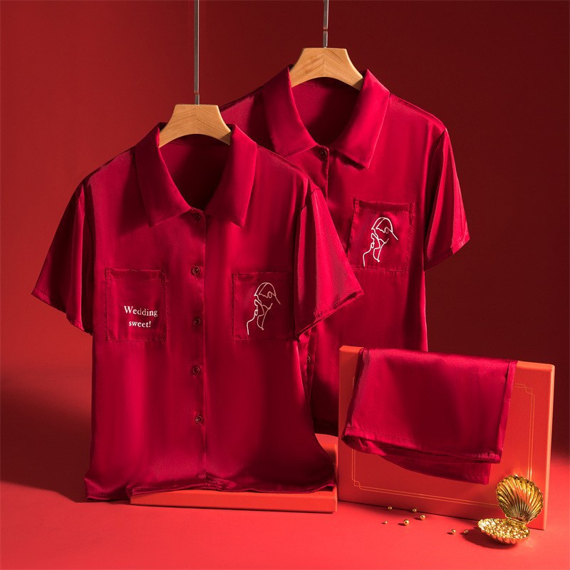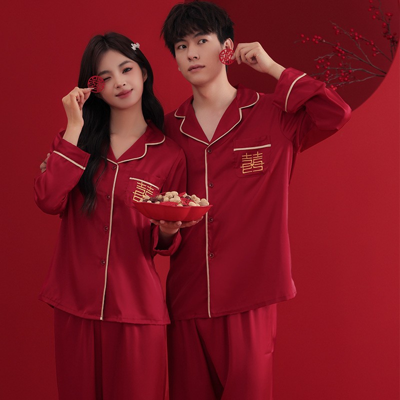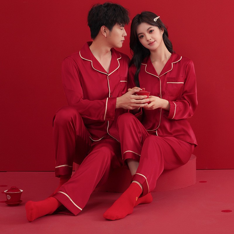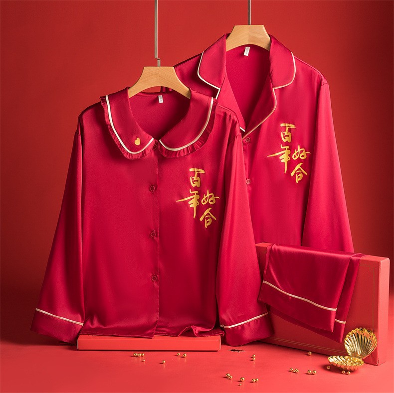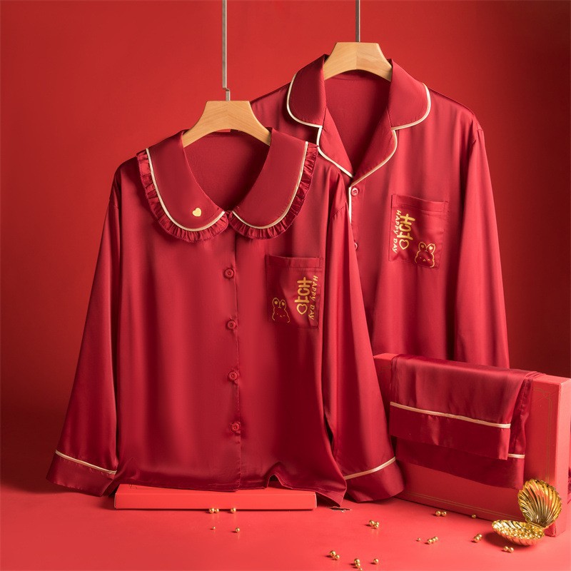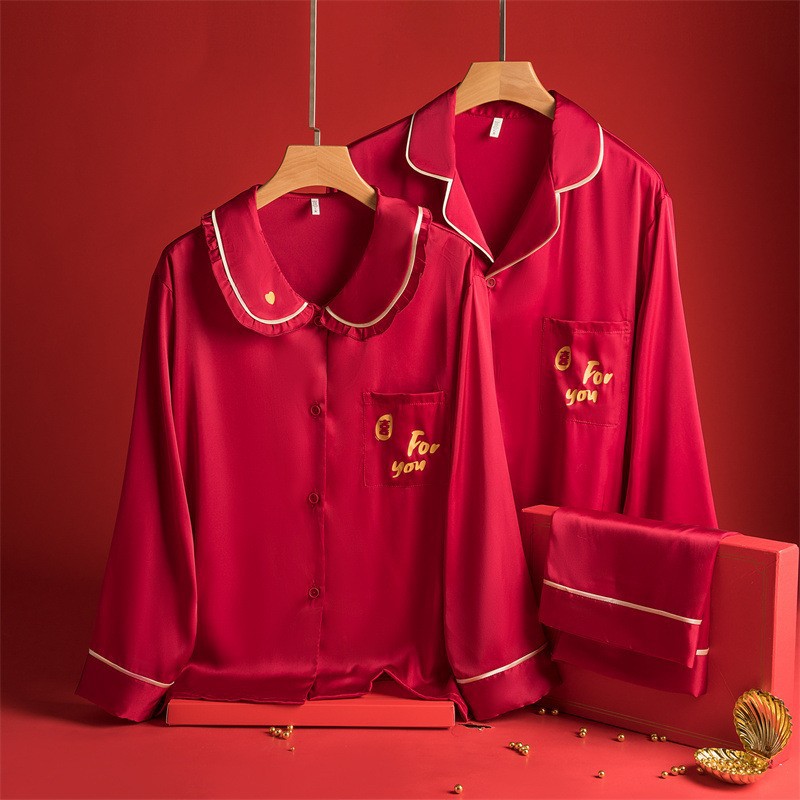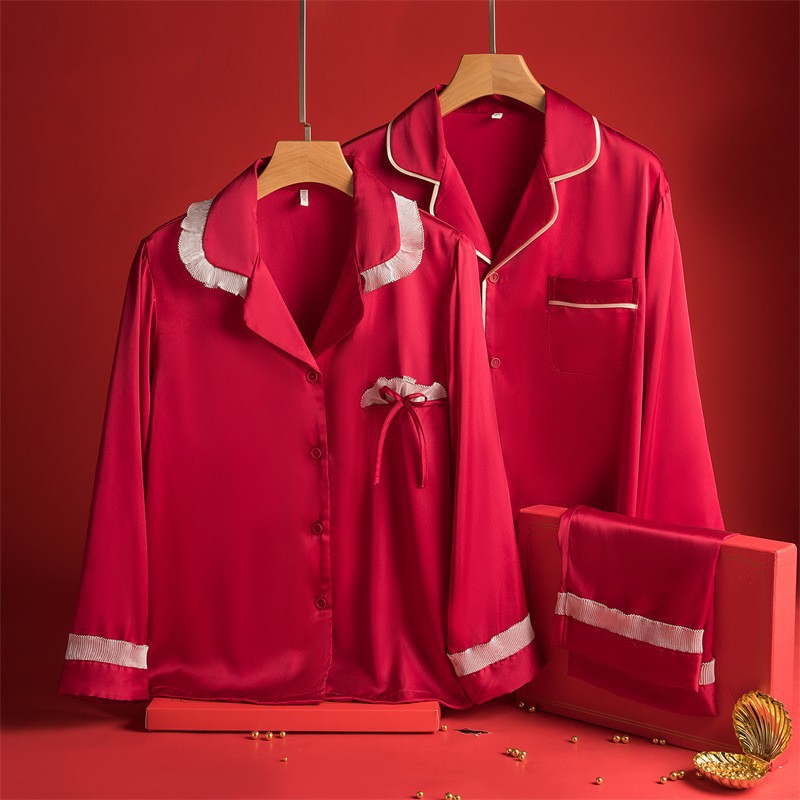 웨딩 커플 잠옷 여성의 봄과 가을 아이스 실크 긴팔 플러스 사이즈 단색 세트 여름 빨간 집 옷스토어 가기
