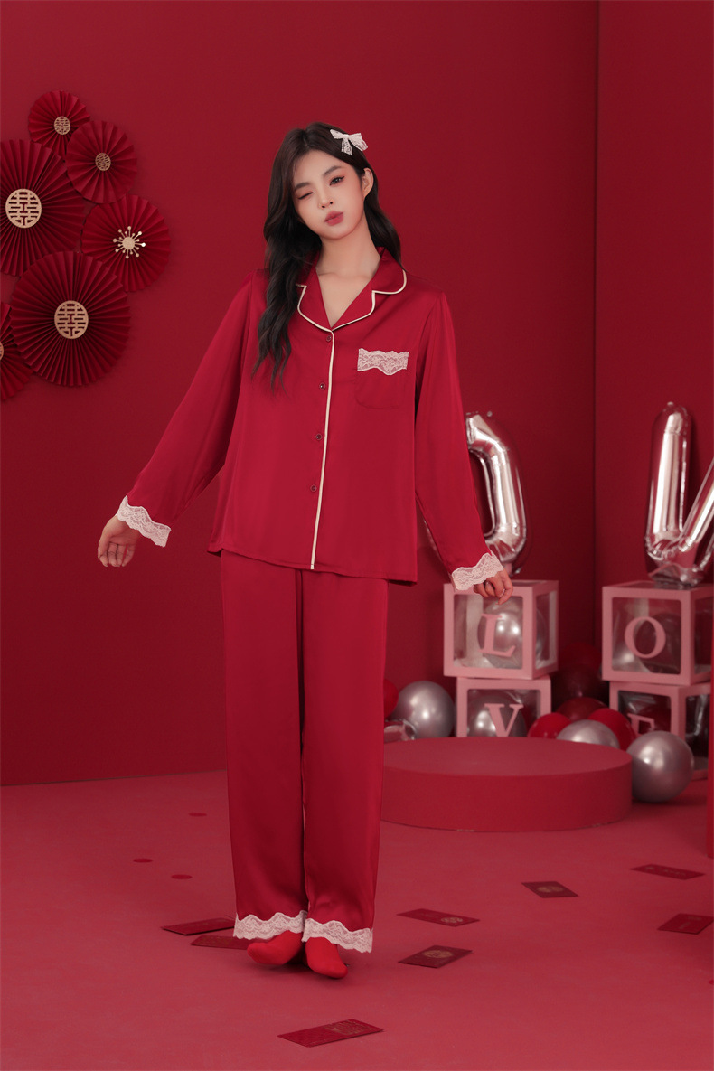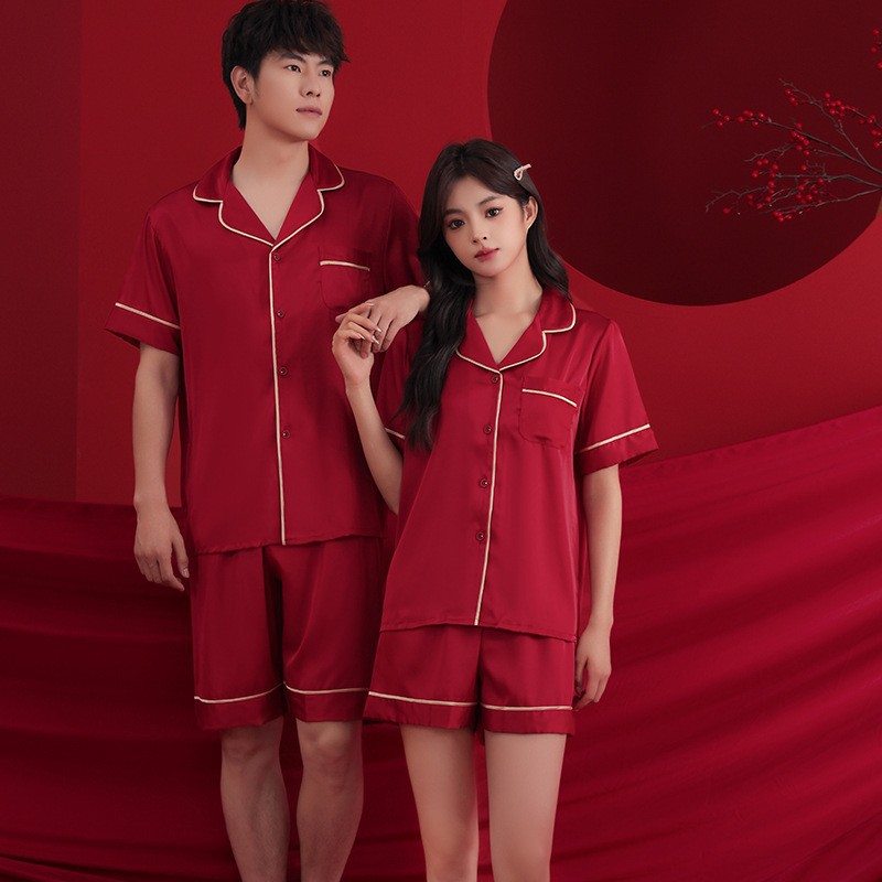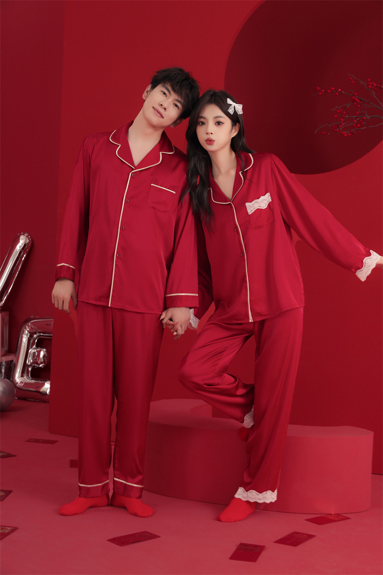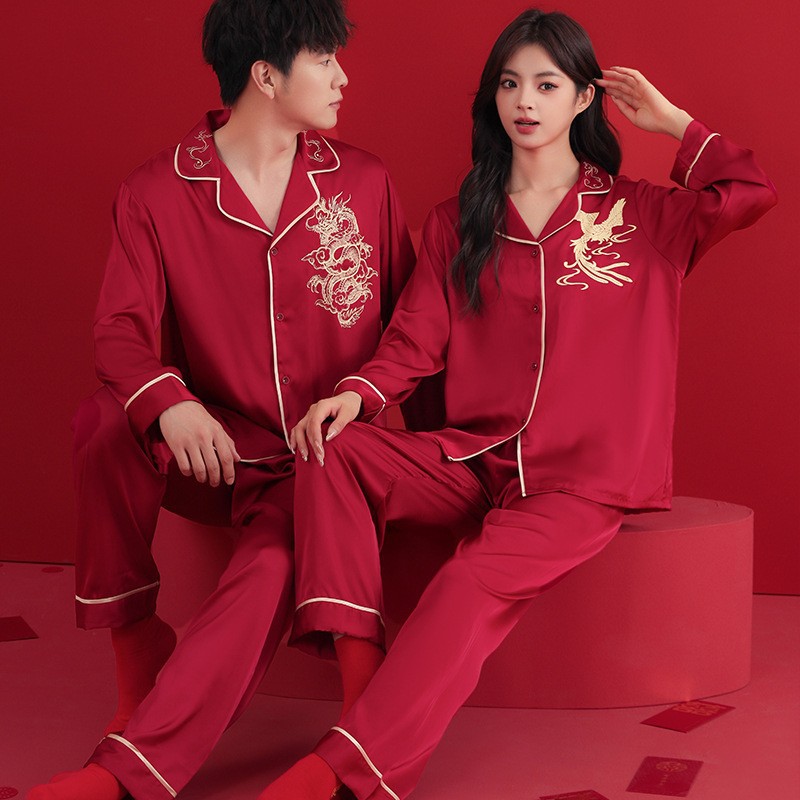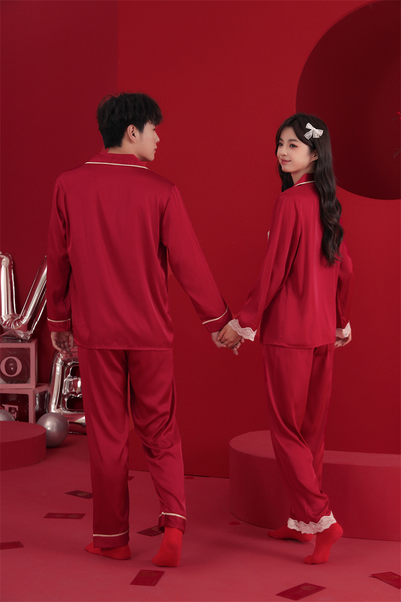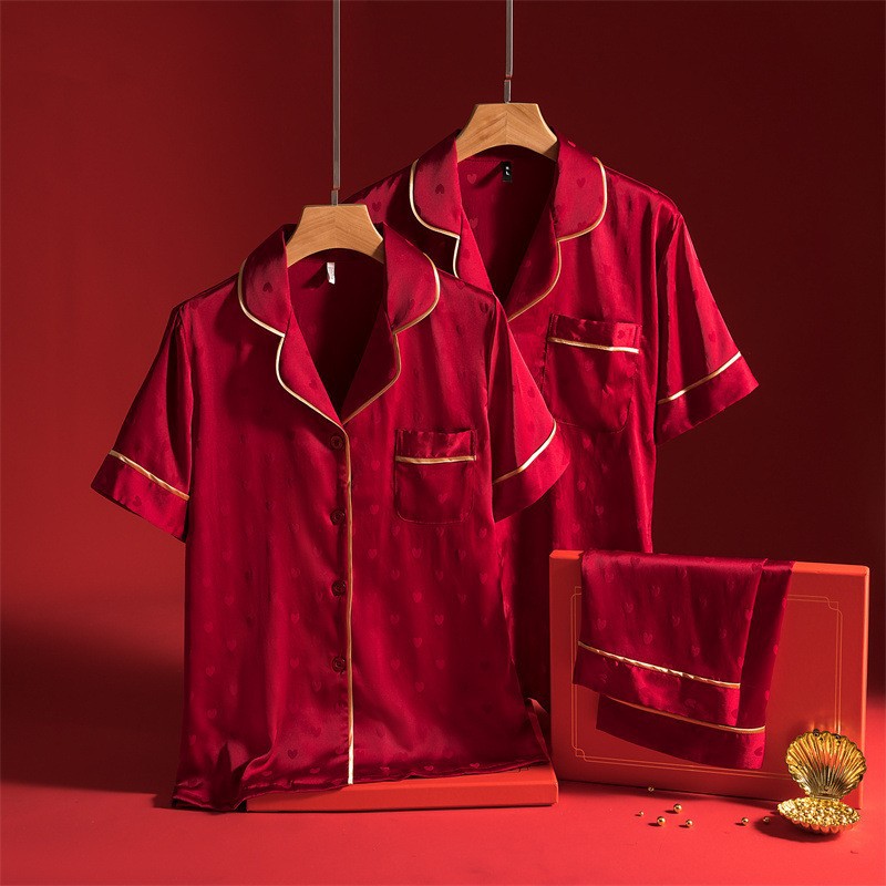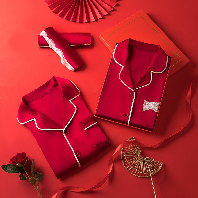 웨딩 커플 잠옷 여성의 봄과 가을 아이스 실크 긴팔 플러스 사이즈 단색 세트 여름 빨간 집 옷스토어 가기