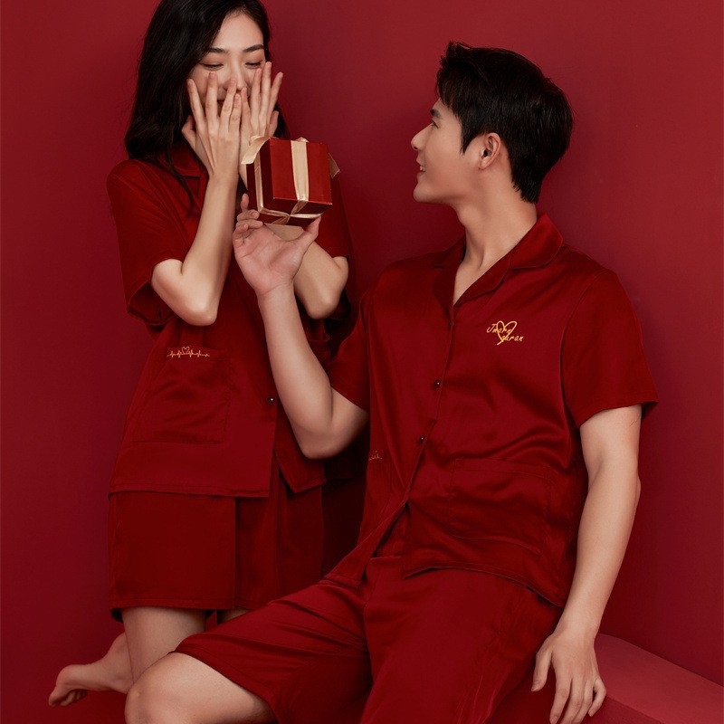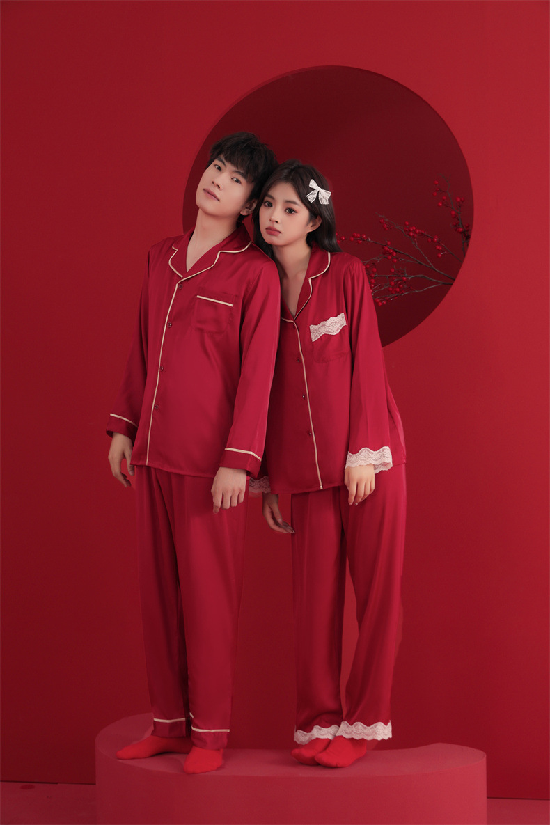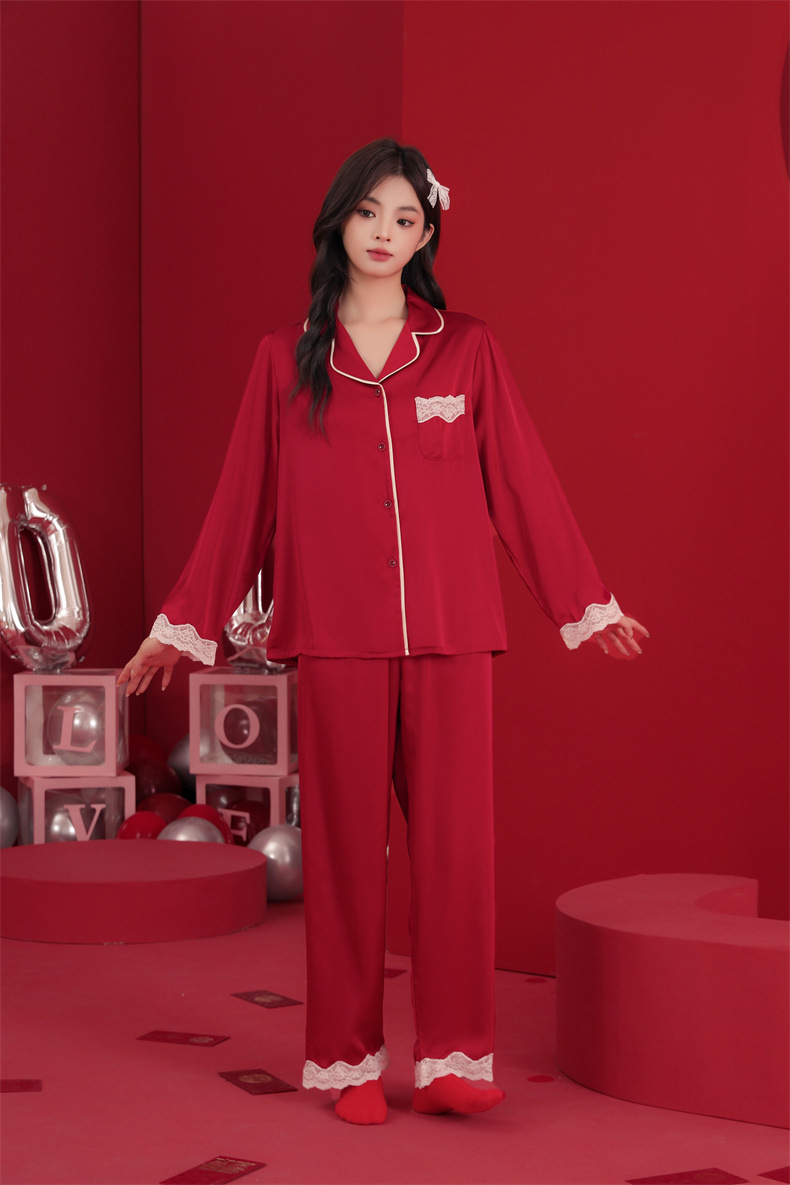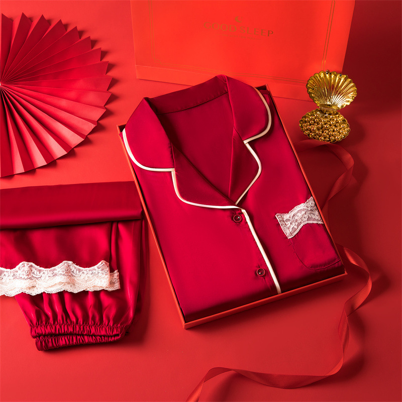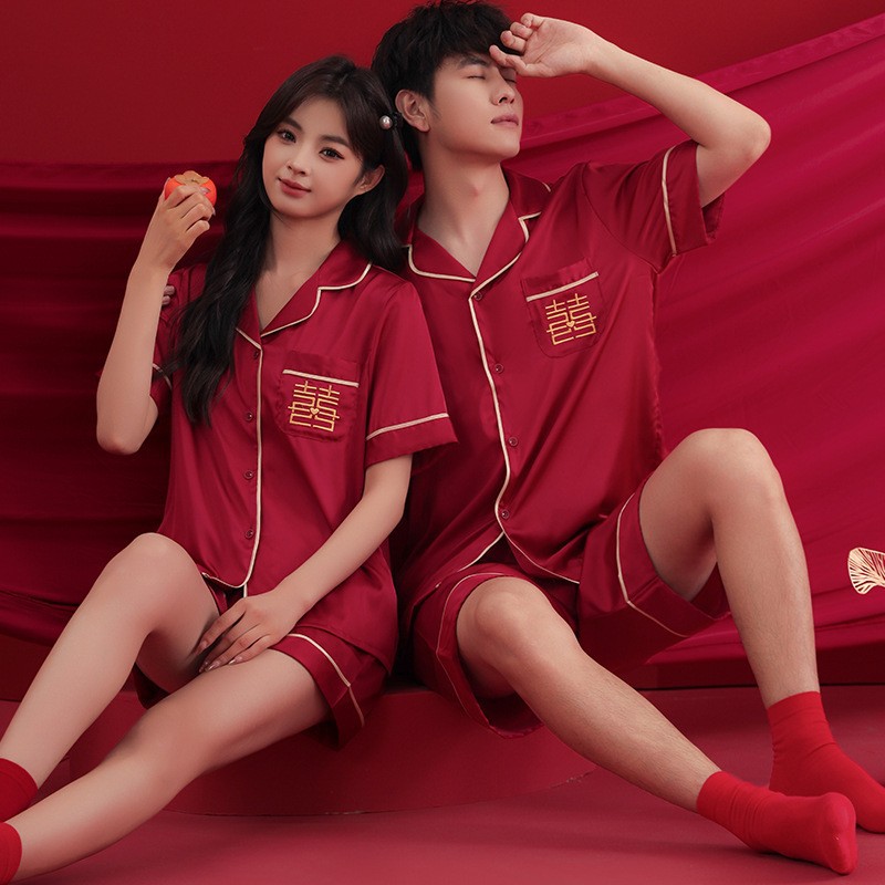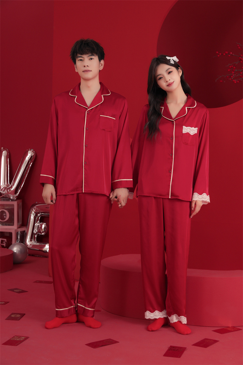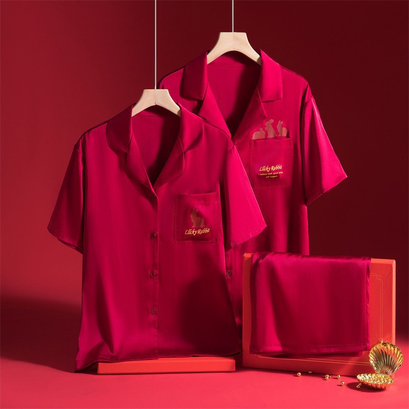 웨딩 커플 잠옷 여성의 봄과 가을 아이스 실크 긴팔 플러스 사이즈 단색 세트 여름 빨간 집 옷스토어 가기