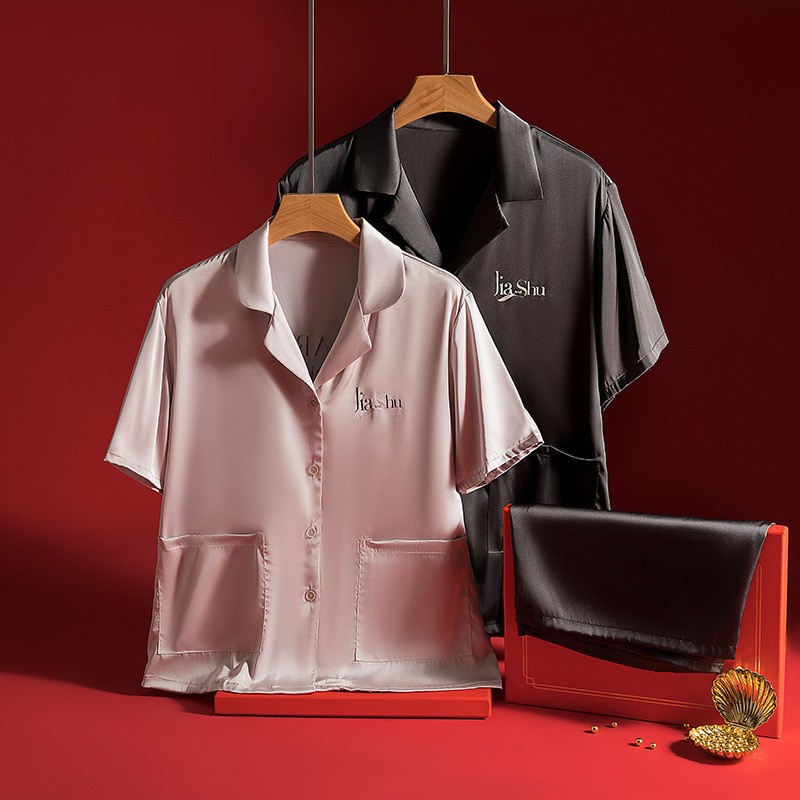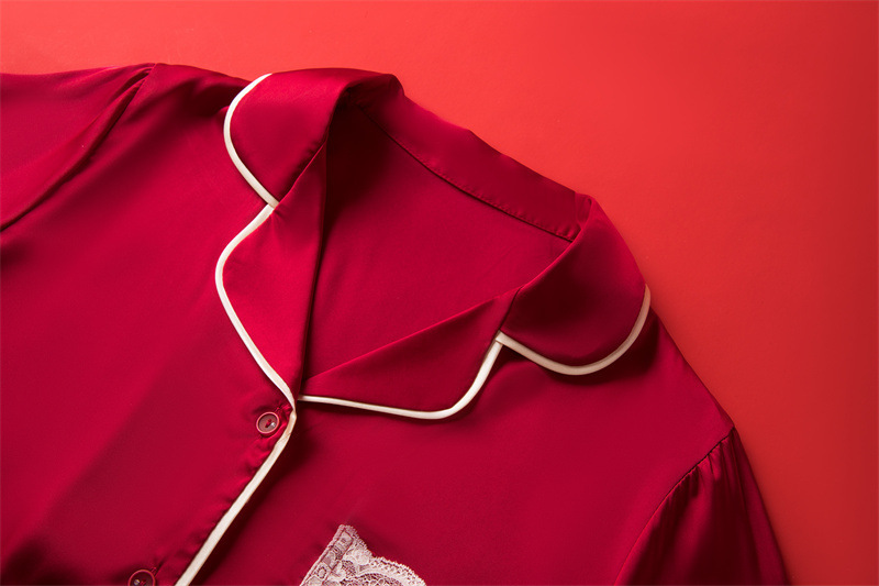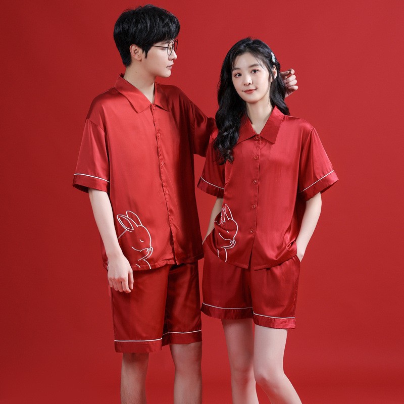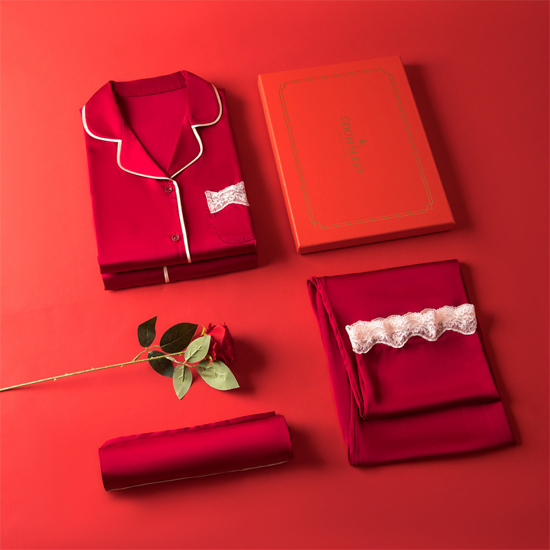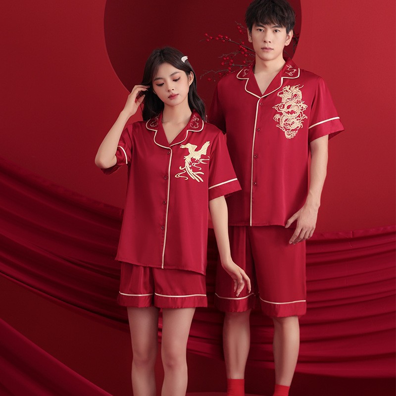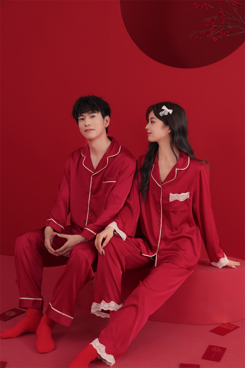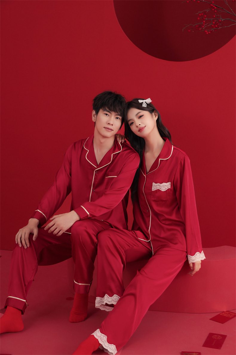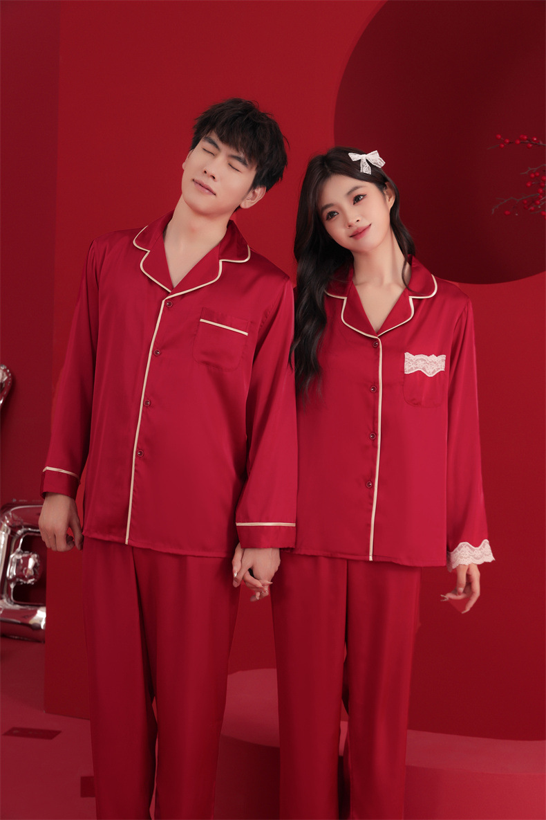 웨딩 커플 잠옷 여성의 봄과 가을 아이스 실크 긴팔 플러스 사이즈 단색 세트 여름 빨간 집 옷스토어 가기