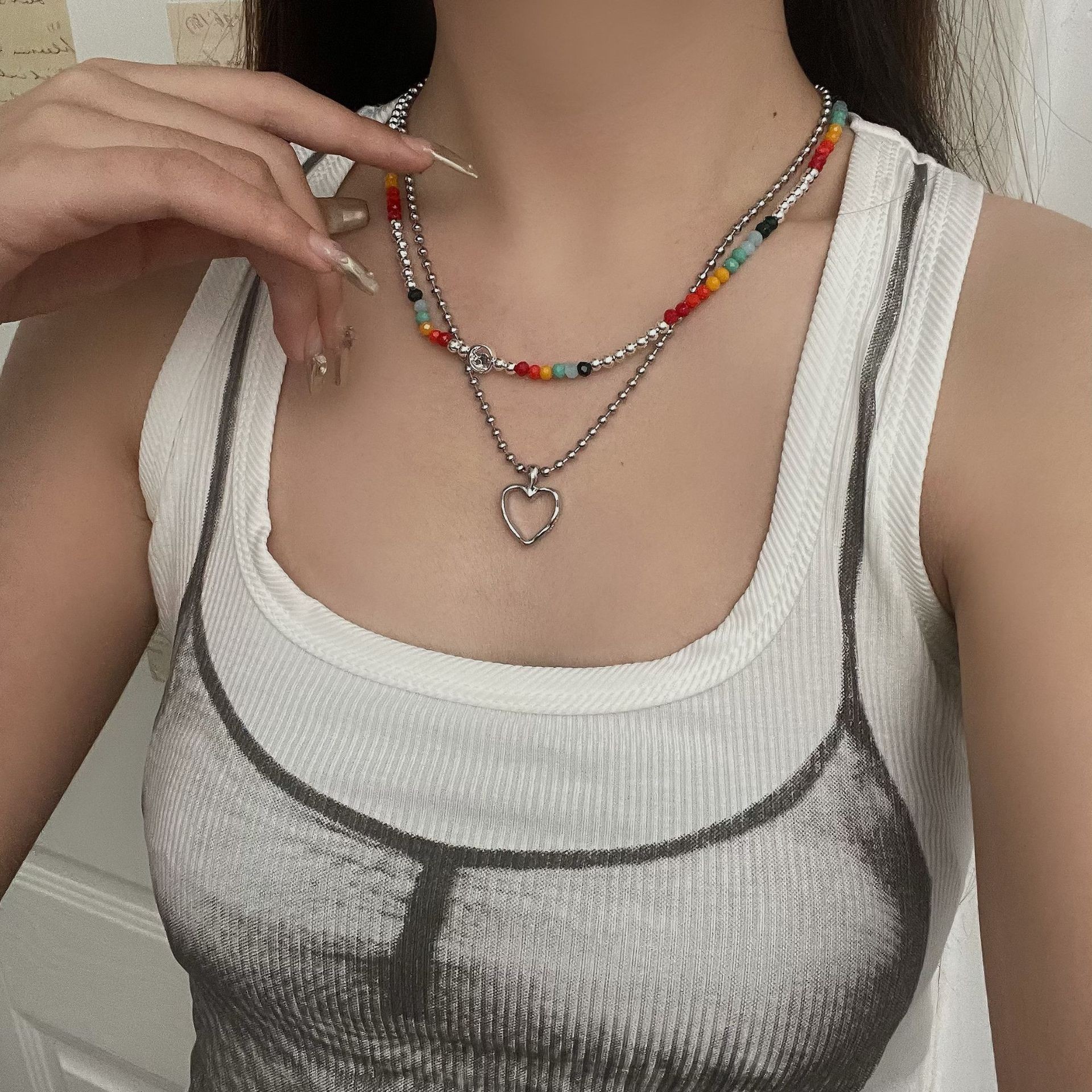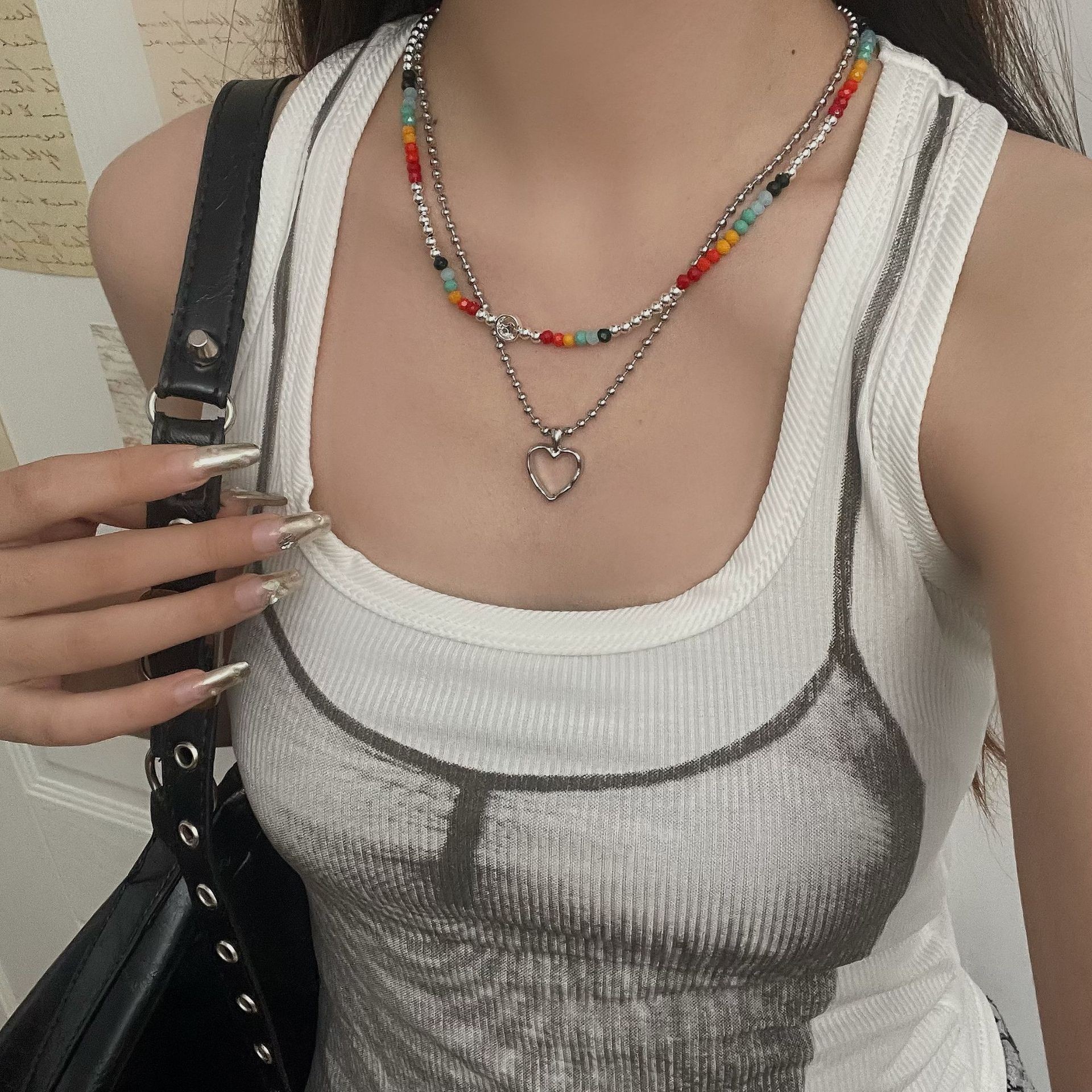 도파민 컬러 비즈 스마일리 사랑 더블 레이어 폴드 목걸이 착용 여성 패션 맞춤형 힙합 모직 체인 액세서리 트렌디스토어 가기