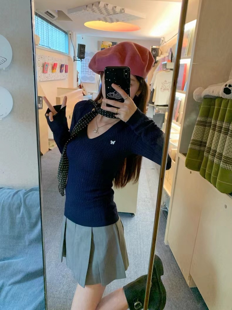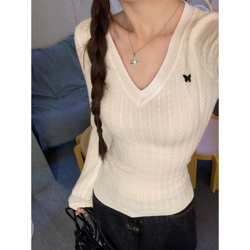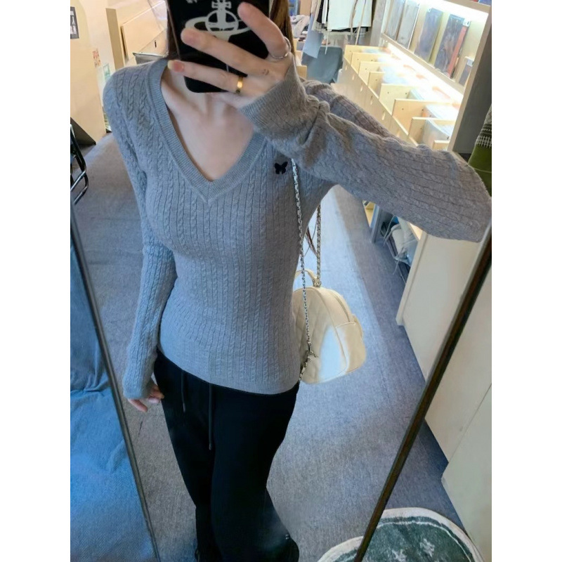 나비 자수 V 넥 긴팔 스웨터 여성의 겨울 슬림 핏 트위스트 내부 스웨터 그레이 타이트베이스 탑스토어 가기