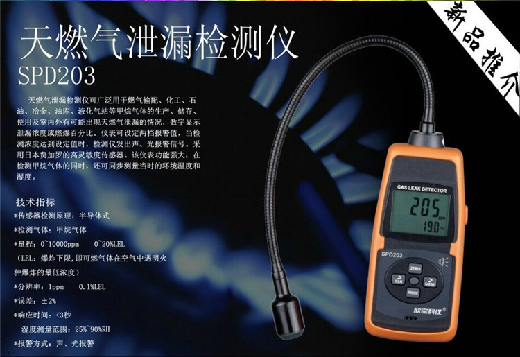 天燃气泄漏检测仪可广泛用于燃气输配、化工、石油、冶金、油库、液化气站等甲烷气体的生产、储存、使用及室内外有可能出现天燃气泄漏的情况,数字显示泄漏浓度或燃爆百分比。仪表可设定两档报警值,当检测浓度达到设定值时,检测仪发出声、光报警信号。采用日本费加罗的高灵敏度传感器。该仪表功能强大,在检测甲烷气体的同时,还可同步测量当时的环境温度和湿度。