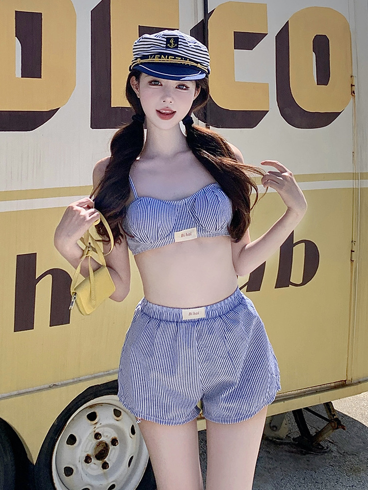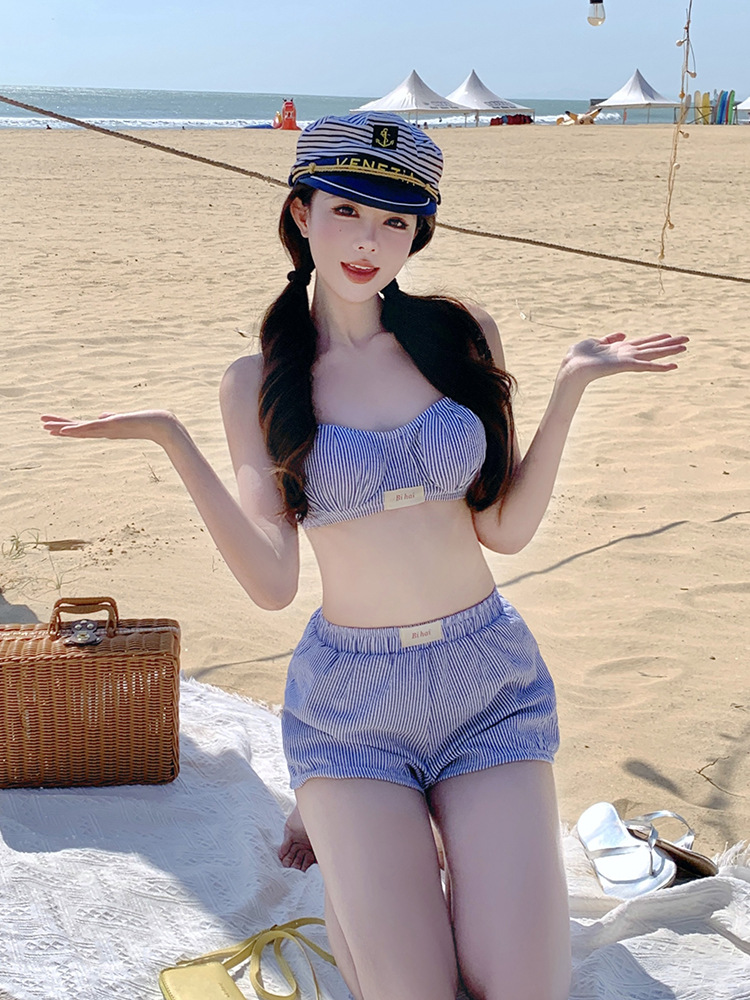 새로운 패션 파란색과 흰색 줄무늬 하이 엔드 센스 달콤한 해군 스타일 분할 수영복 높은 허리 반바지 비키니 3 피스 세트