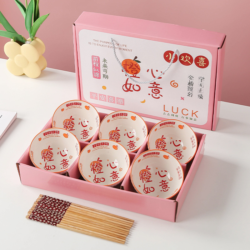 • 오렌지 하트 루이 그릇 6개 젓가락 6개 (핑크색 선물 상자)