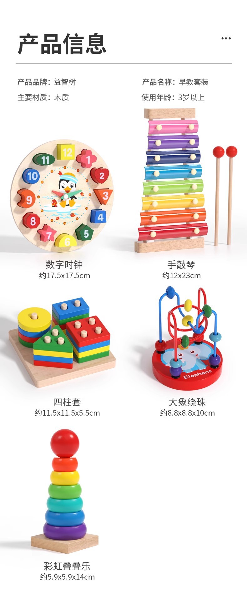 • 5종 세트 (피아노 두드리기 + 시계 + 무지개탑 + 애벌레 + 코끼리구슬) 0.7kg