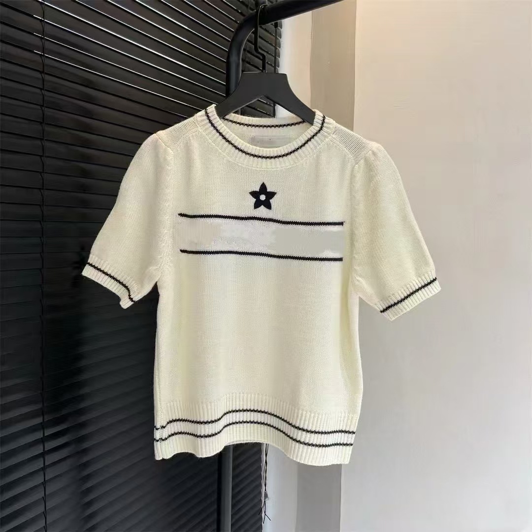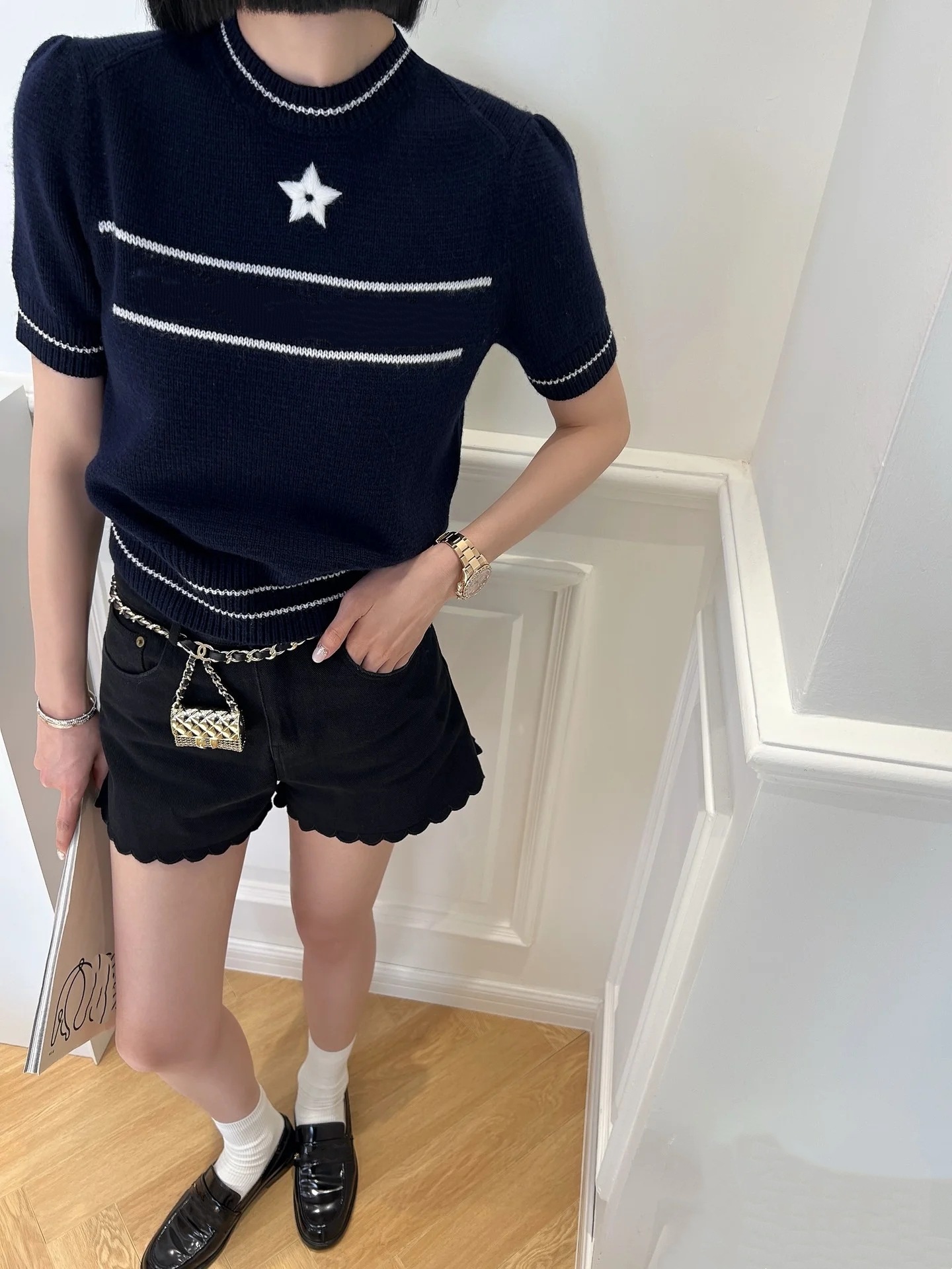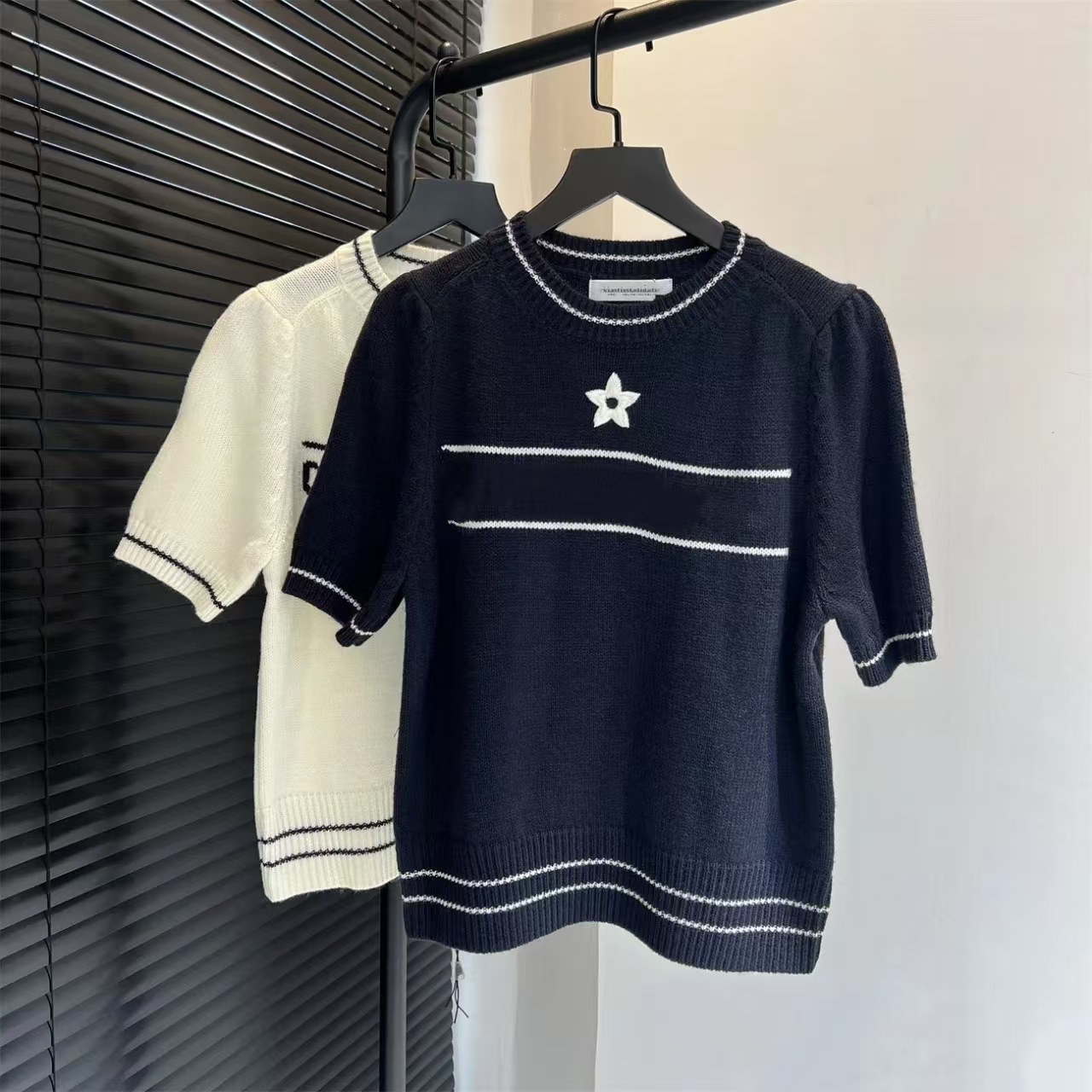 하이 세트 수정 에디션 클래식 5 점 별 문자 자수 대조 컬러 올 매치 패션 라운드 넥 니트 쇼트 슬리브 여성용 스웨터