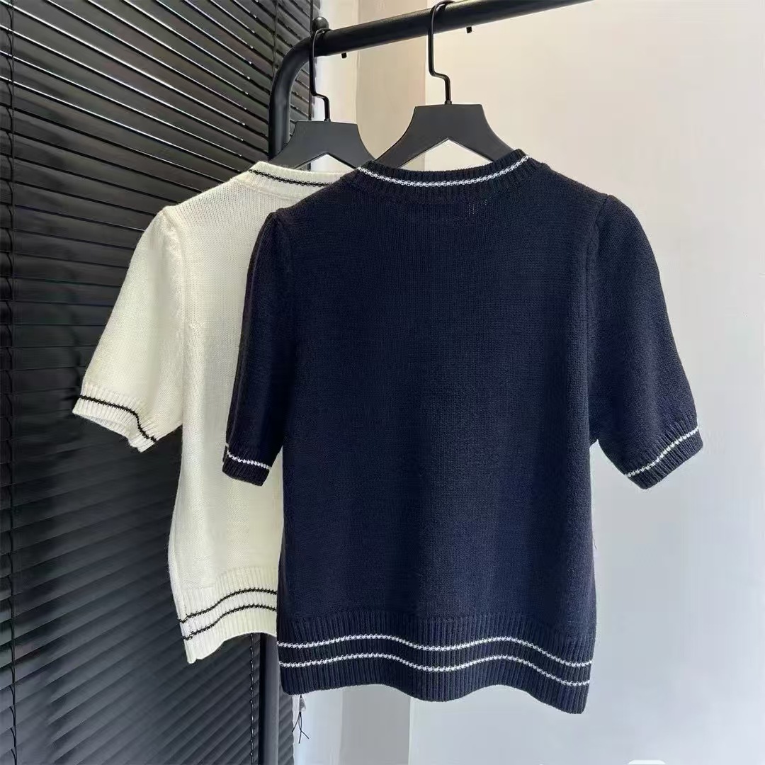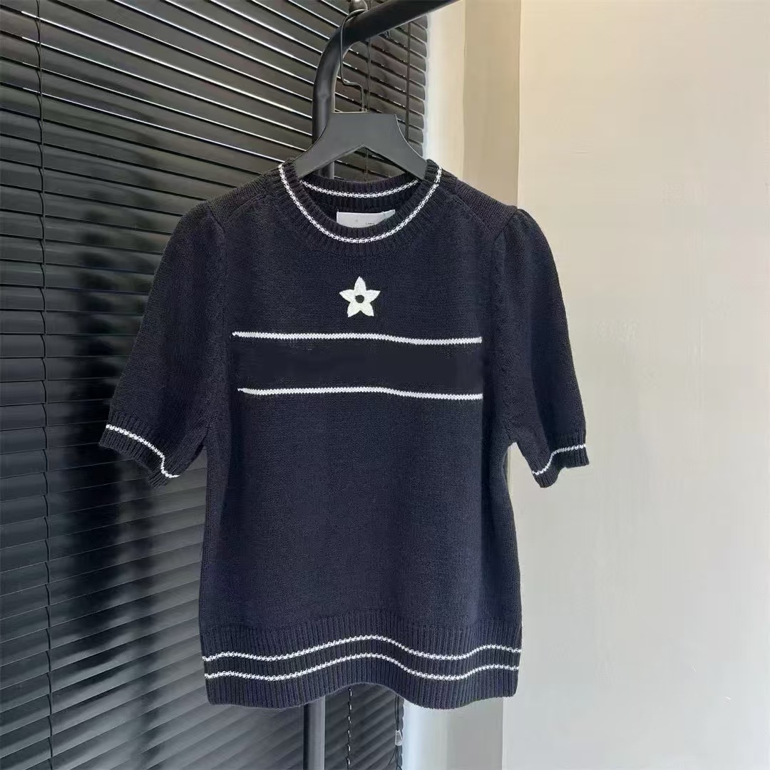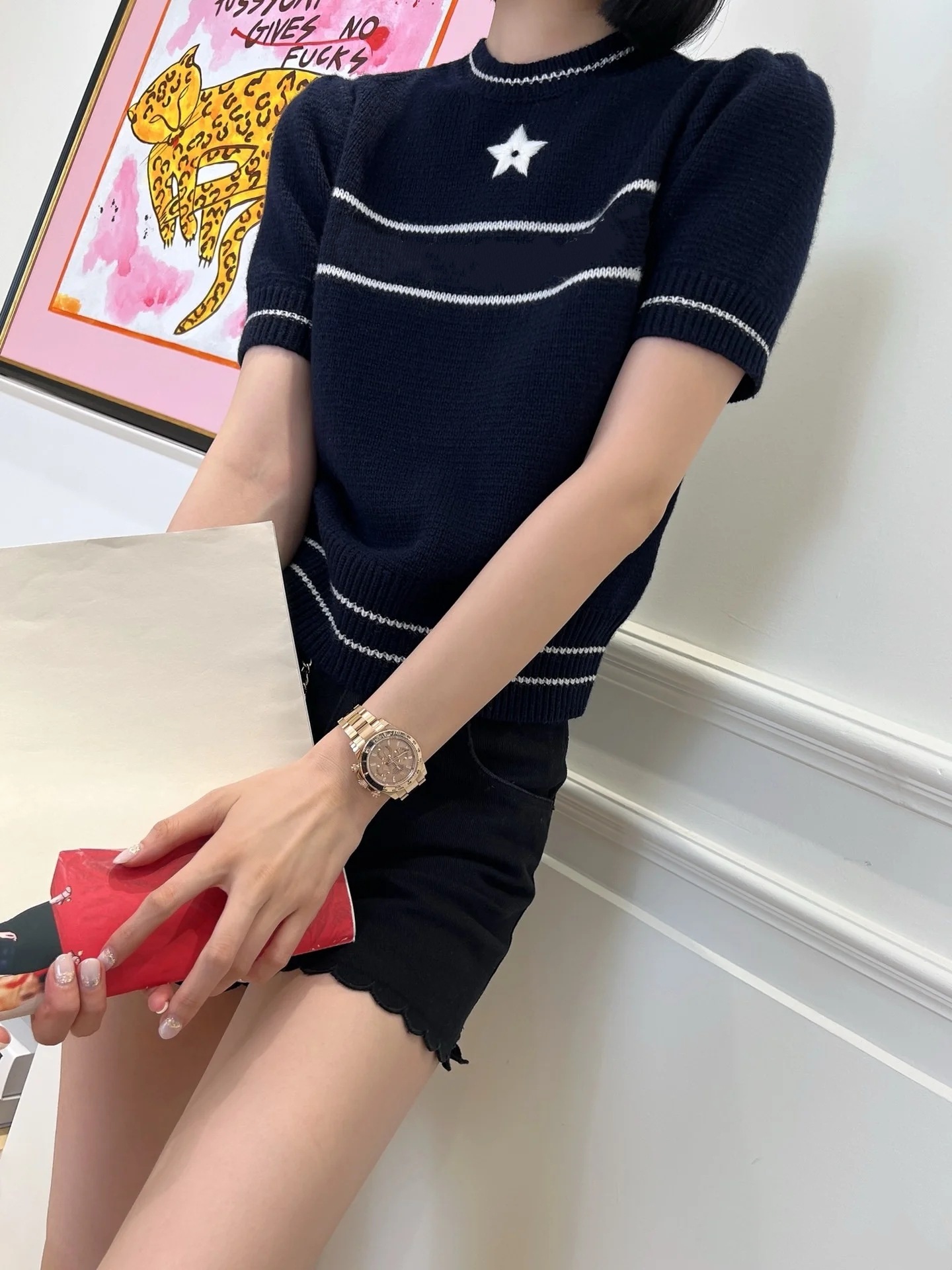 하이 세트 수정 에디션 클래식 5 점 별 문자 자수 대조 컬러 올 매치 패션 라운드 넥 니트 쇼트 슬리브 여성용 스웨터
