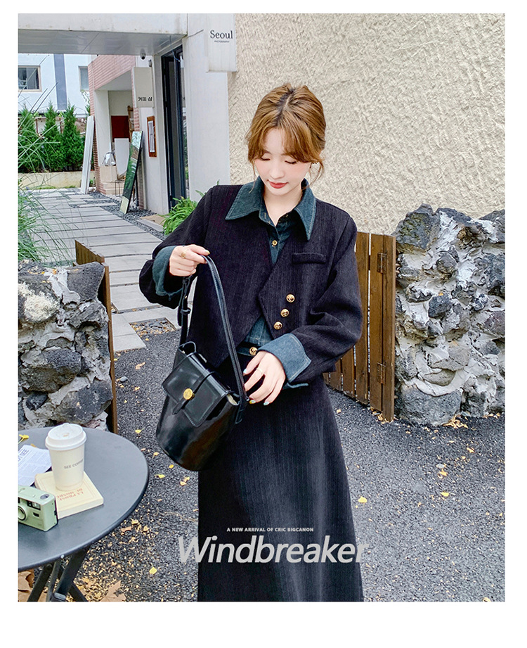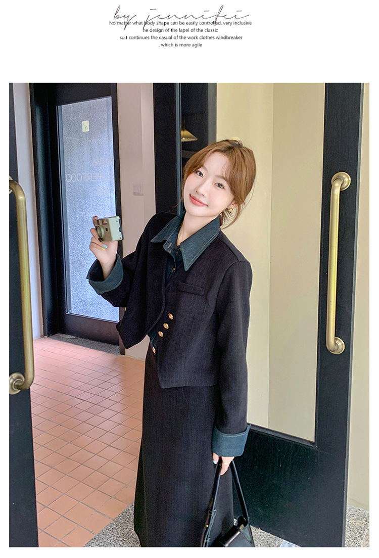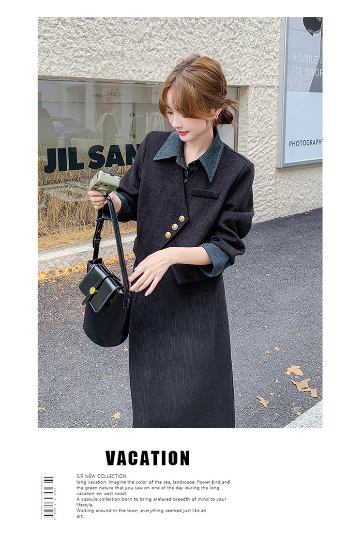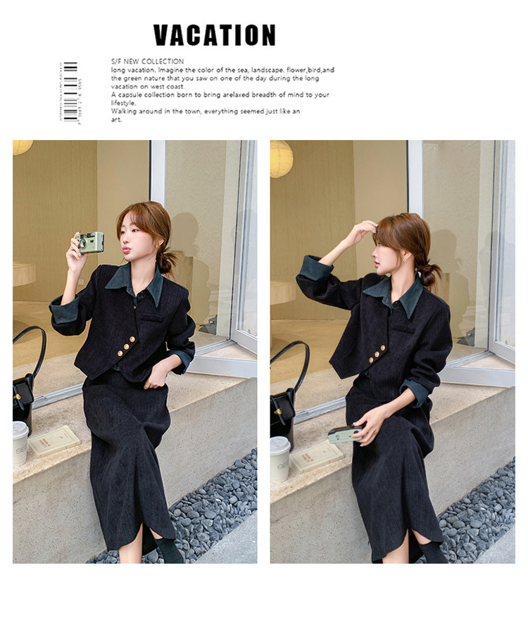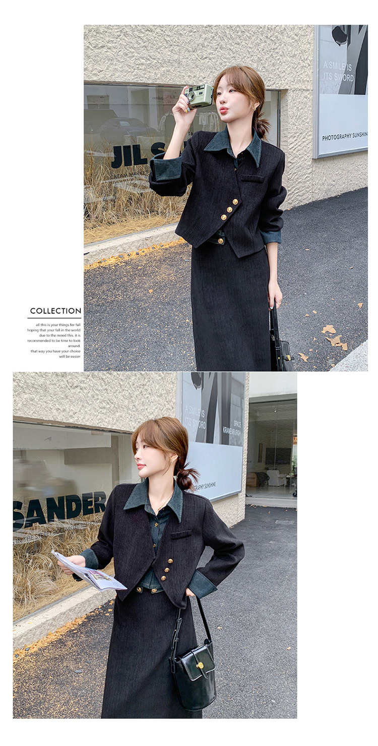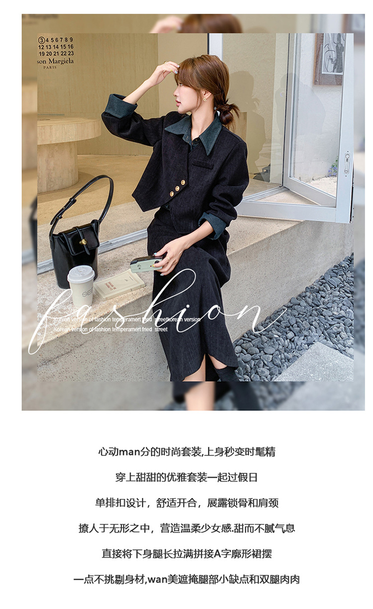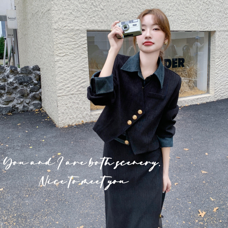 강력한 분위기의 코듀로이 투피스 여성복 2025 가을 신상 디자인 스티치 레트로 재킷과 성숙한 느낌의 스커트스토어 가기