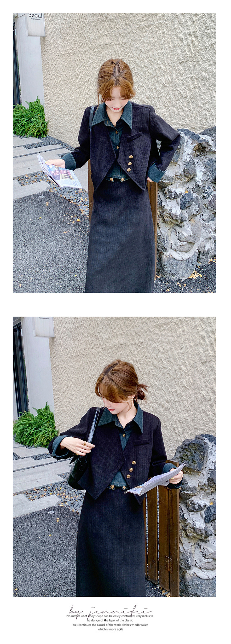 강력한 분위기의 코듀로이 투피스 여성복 2025 가을 신상 디자인 스티치 레트로 재킷과 성숙한 느낌의 스커트