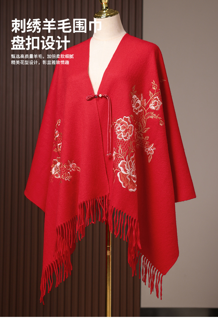 부타 자수 모란 꽃 버클 큰 붉은 원피스 양모 목도리 가을과 겨울 양모 스카프 숙녀 22Q046