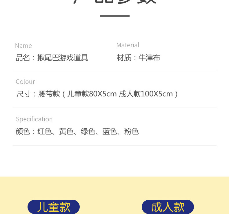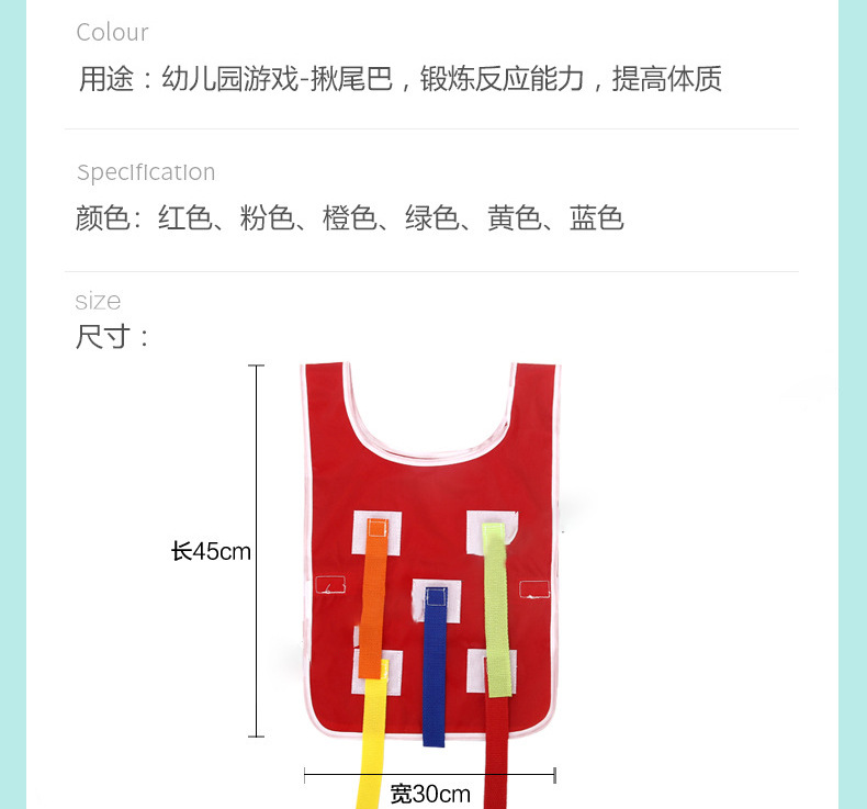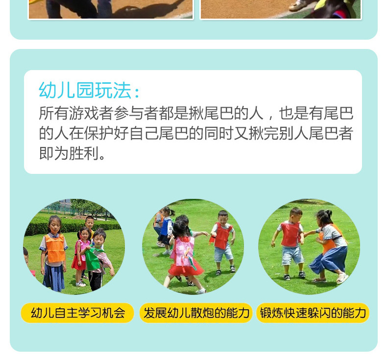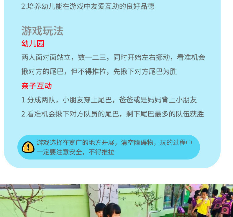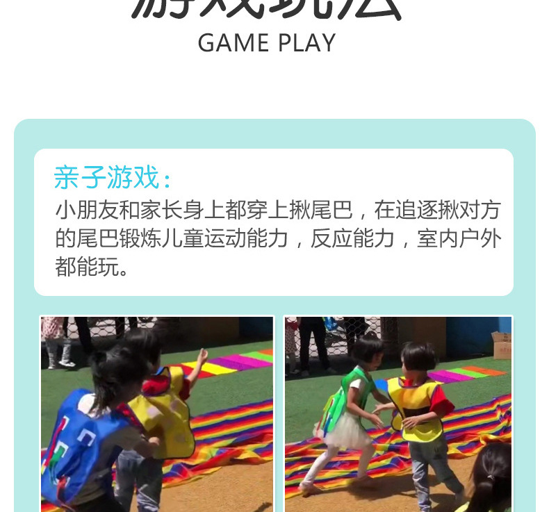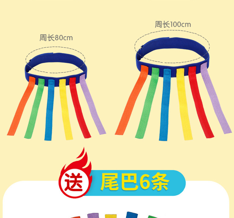 升级带铁环可调节揪尾巴玩具是一种很好的游戏互动道具,幼儿园学生使用可以锻炼孩子的反应奔跑能力、互动协作能力,也可以作为家长与孩子的亲子互动工具;作为公司团建拓展礼品道具,抓尾巴道具可以活跃现场气氛,释放工作压力,增加团队活跃度、凝聚力。