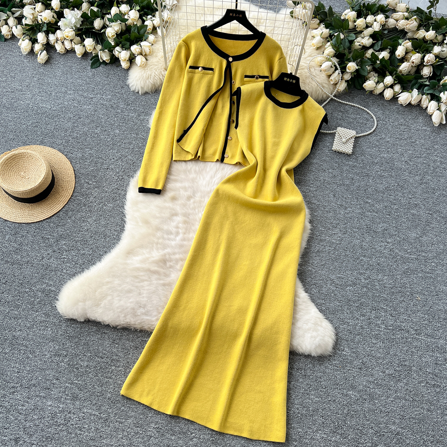 샤오 샹 스타일 투피스 세트 여성 가을 및 겨울 하이 엔드 올 매치 크루 넥 니트 카디건 재킷 민소매 조끼 원피스