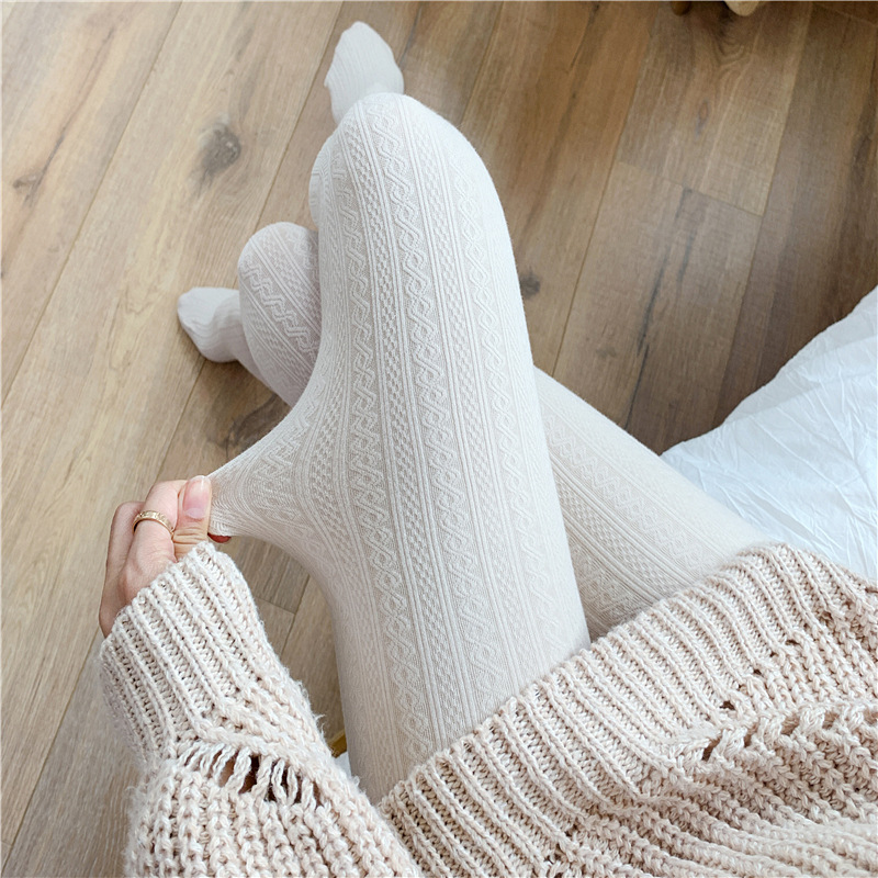 일본식 흰색 팬티 스타킹 여성용 대마 패턴 니트 화이트 실크 스타킹 순수한 봄 가을 겨울 기모 두꺼운 따뜻한 레깅스