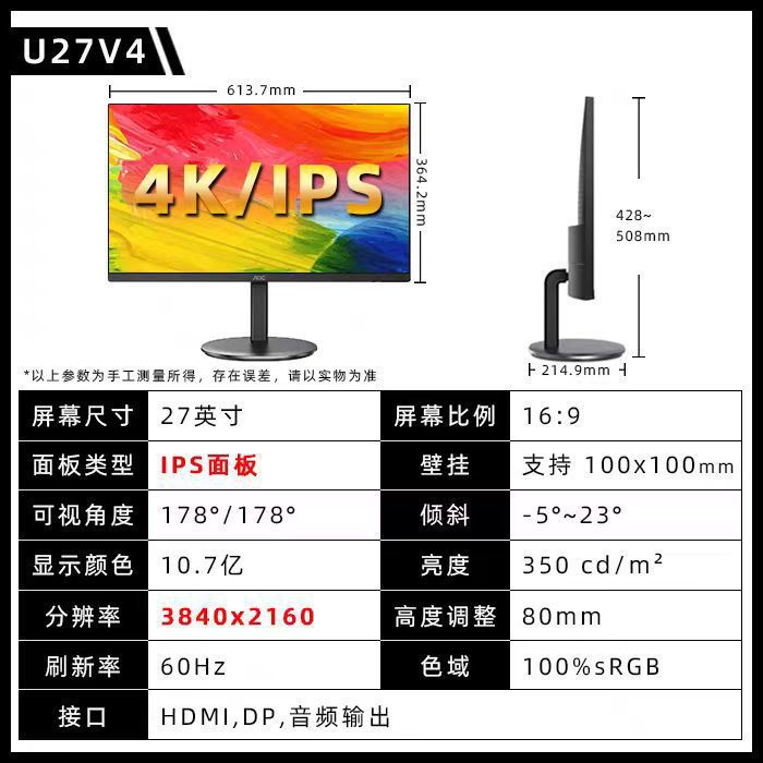 AOC U27V4 27 "4K 모니터 디자인 울트라 클리어 IPS 넓은 시야각 126% sRGB 낮은 푸른 빛
