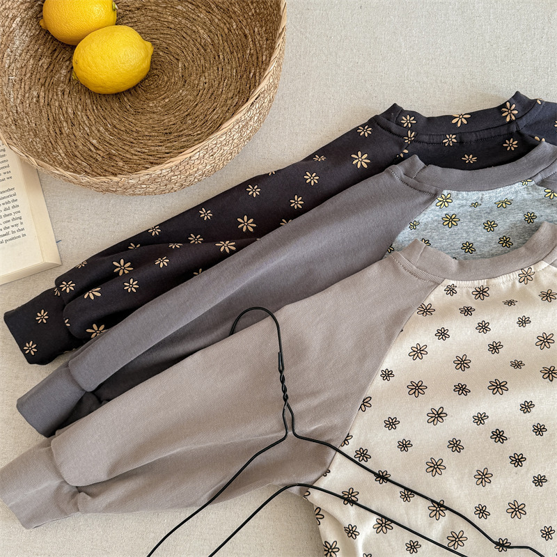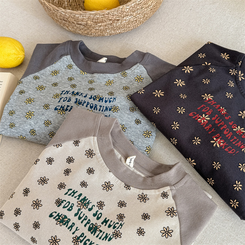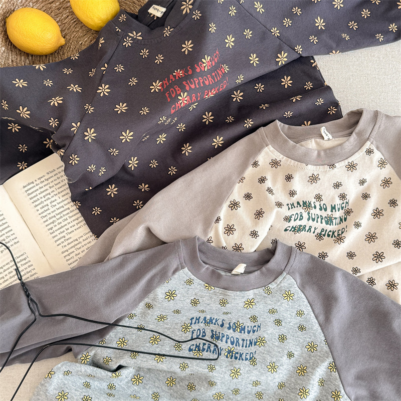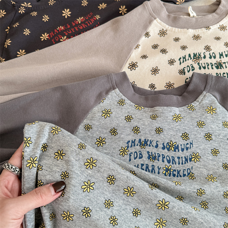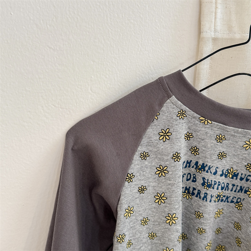 25 봄 어린이 긴팔 티셔츠 소녀 한국 컬러 블록 라글란 슬리브 꽃 편지 인쇄 라운드 넥 탑베이스 셔츠