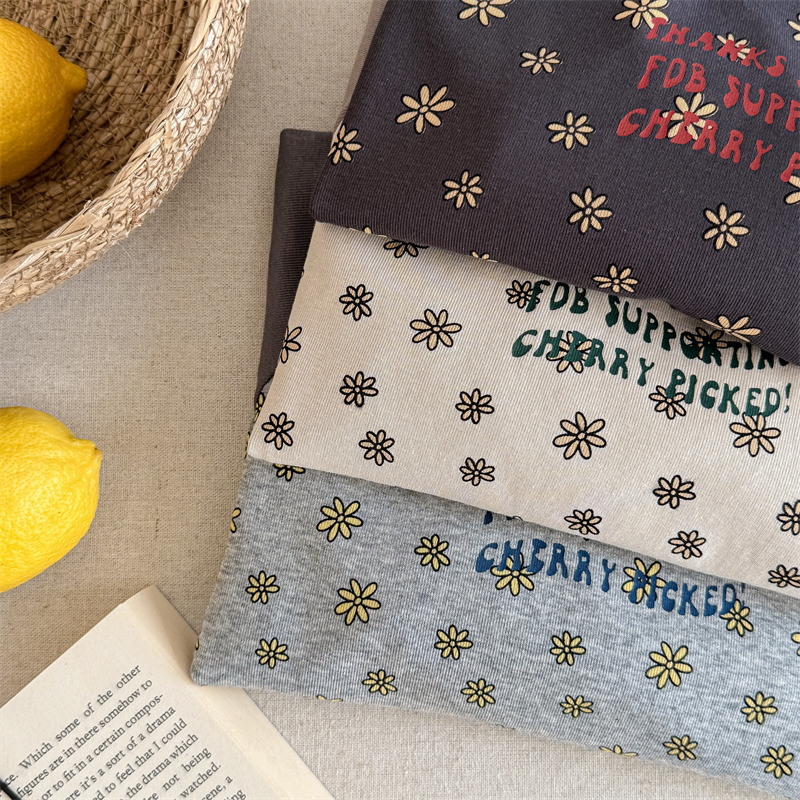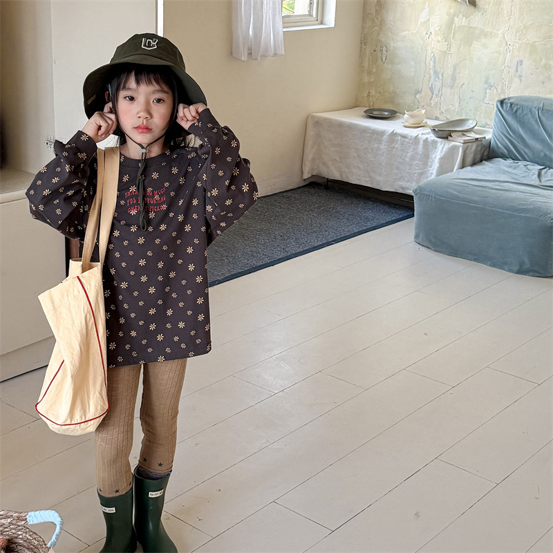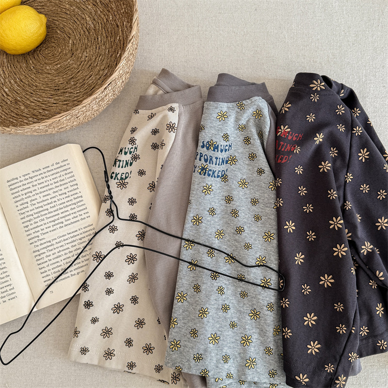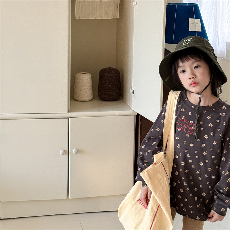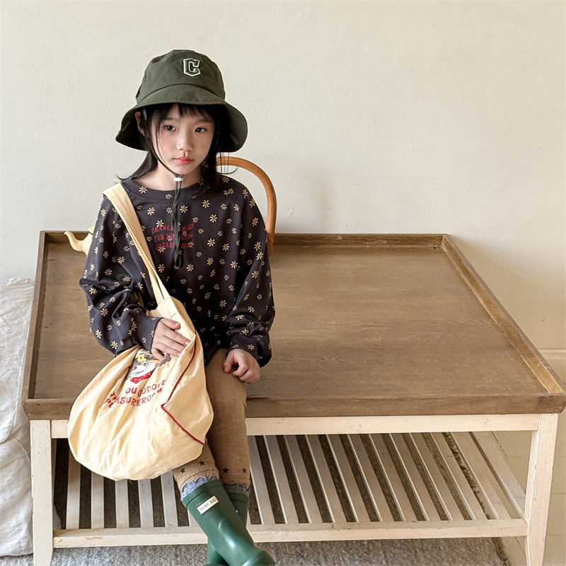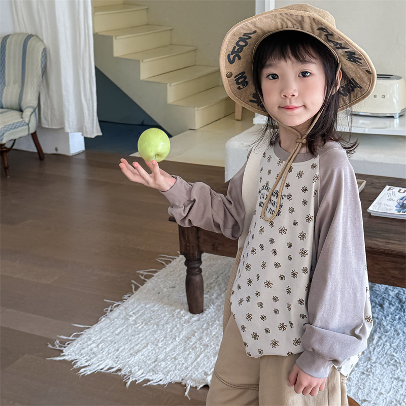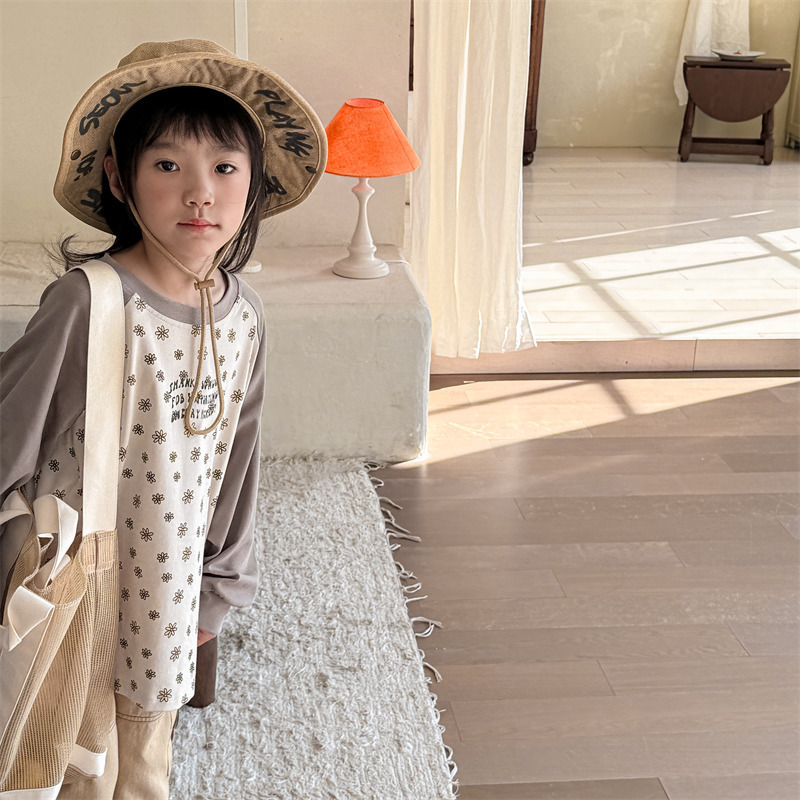 25 봄 어린이 긴팔 티셔츠 소녀 한국 컬러 블록 라글란 슬리브 꽃 편지 인쇄 라운드 넥 탑베이스 셔츠스토어 가기