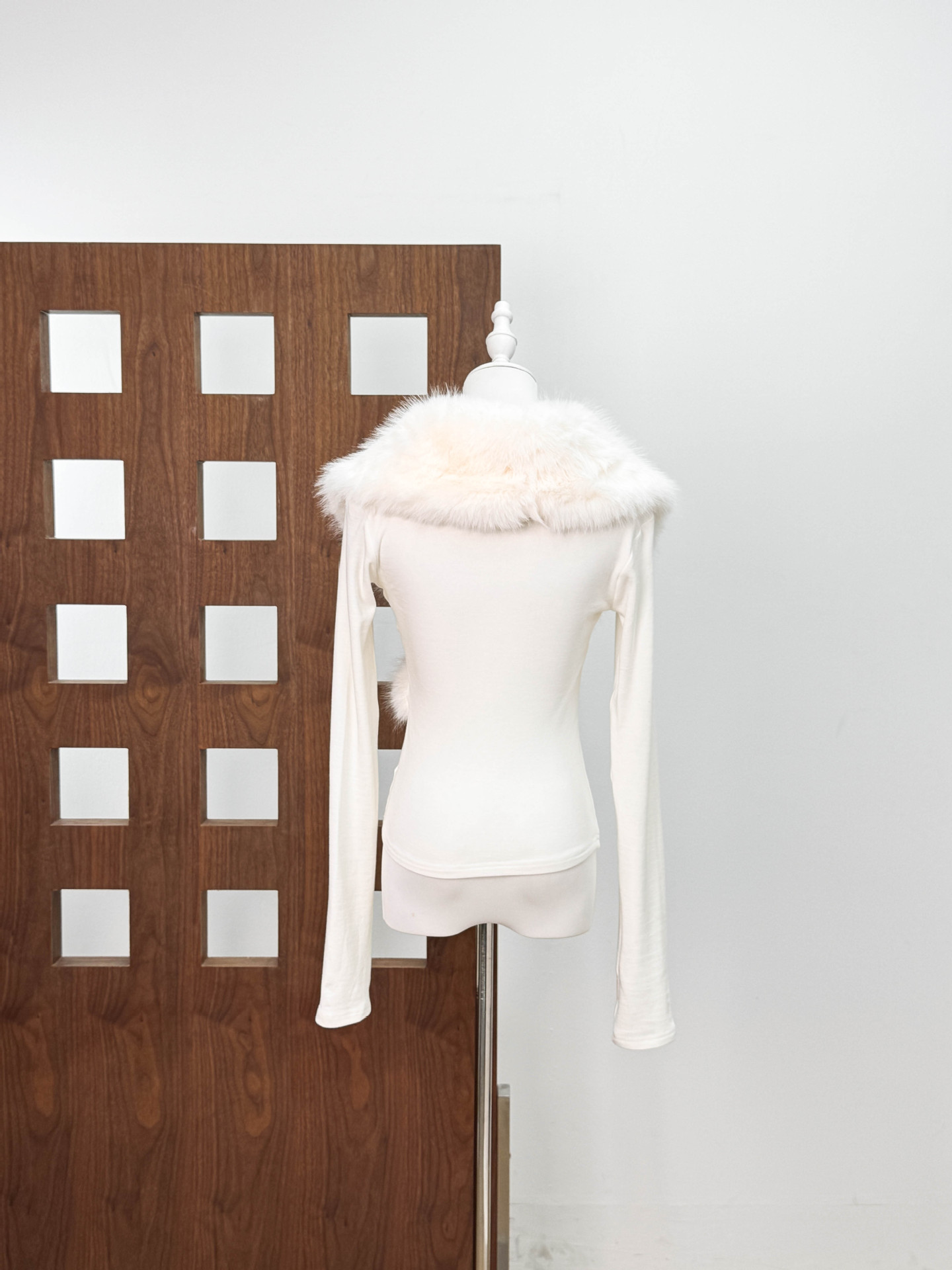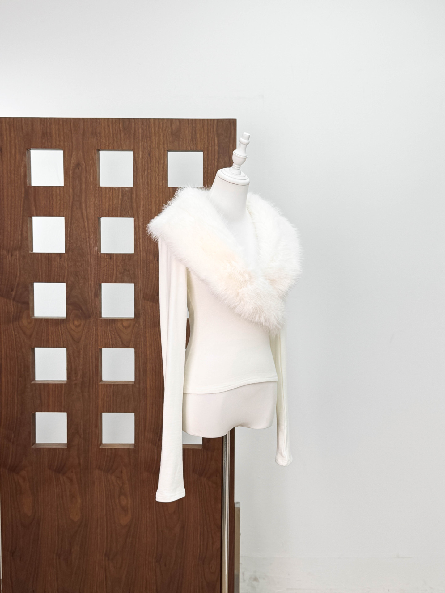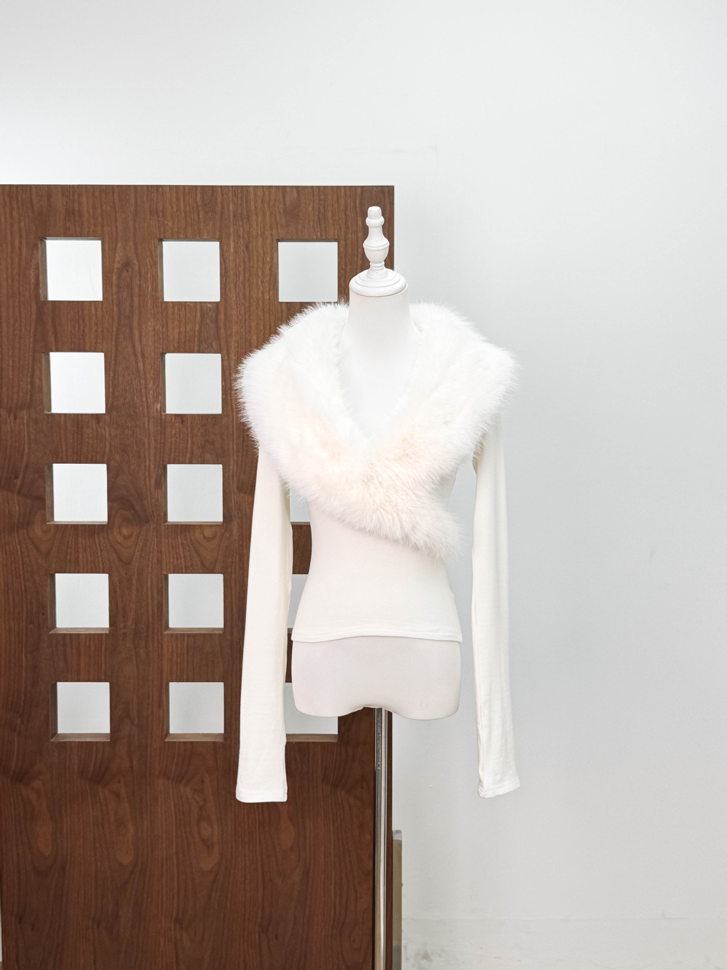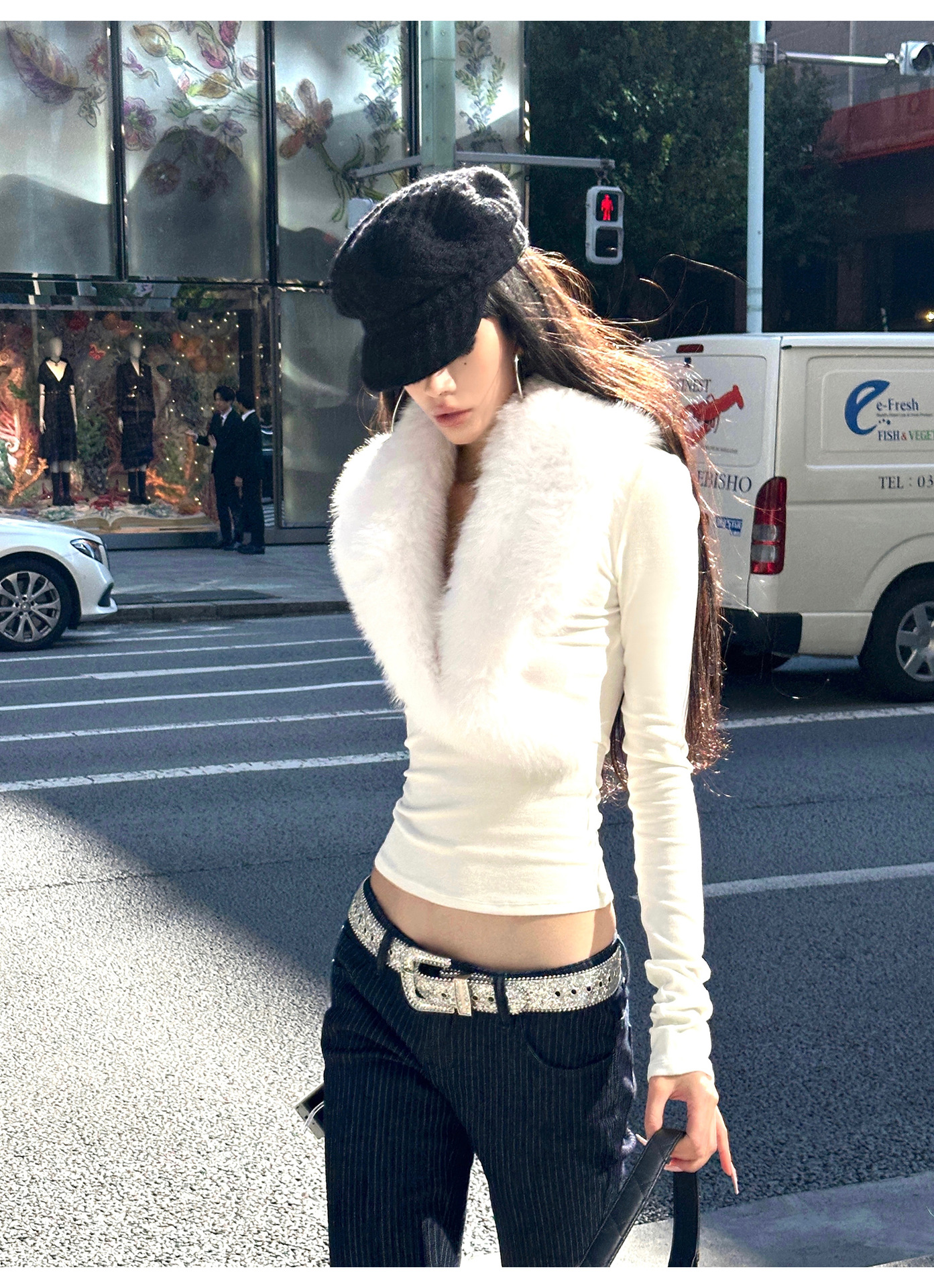 밀레니엄 스파이스 걸스 스타일 화이트 모피 칼라 티셔츠 여성용 슬림 핏 우아한 틈새 디자인 긴팔 친환경 모피 니트 탑스토어 가기