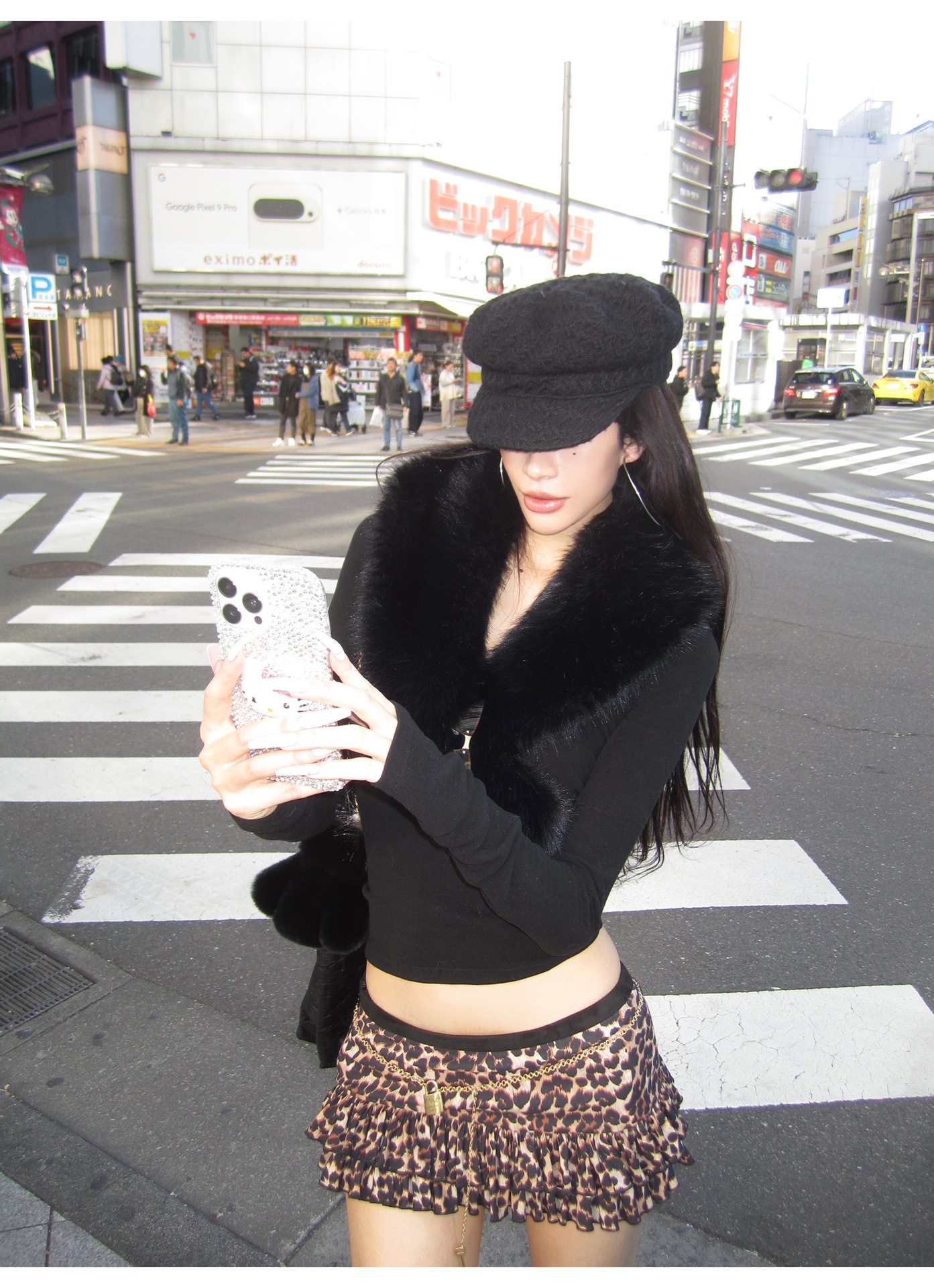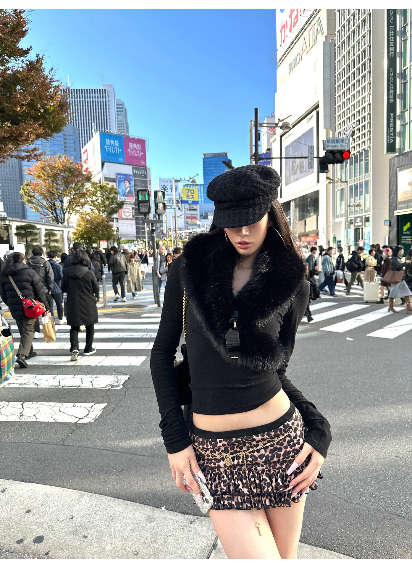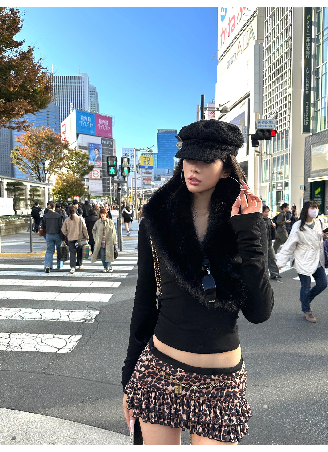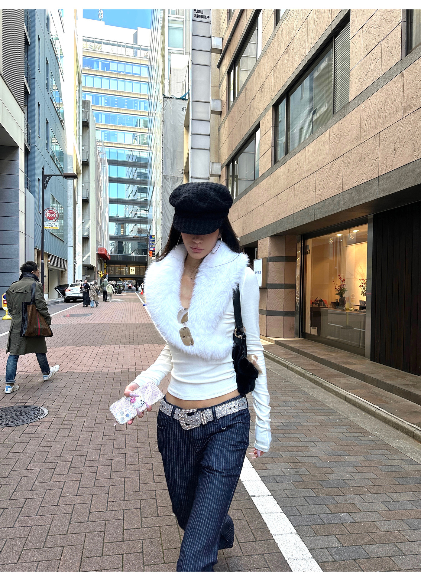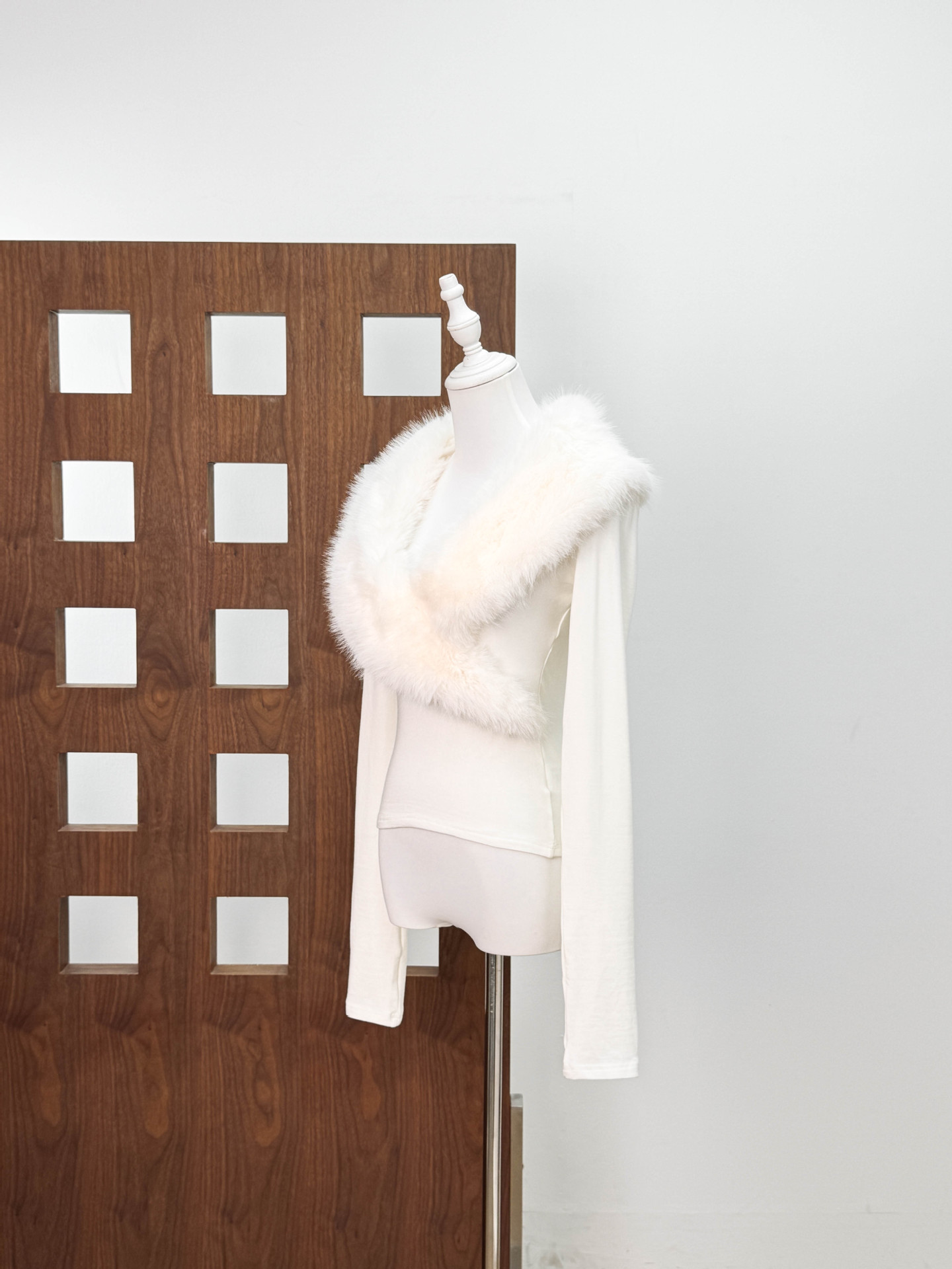 밀레니엄 스파이스 걸스 스타일 화이트 모피 칼라 티셔츠 여성용 슬림 핏 우아한 틈새 디자인 긴팔 친환경 모피 니트 탑스토어 가기