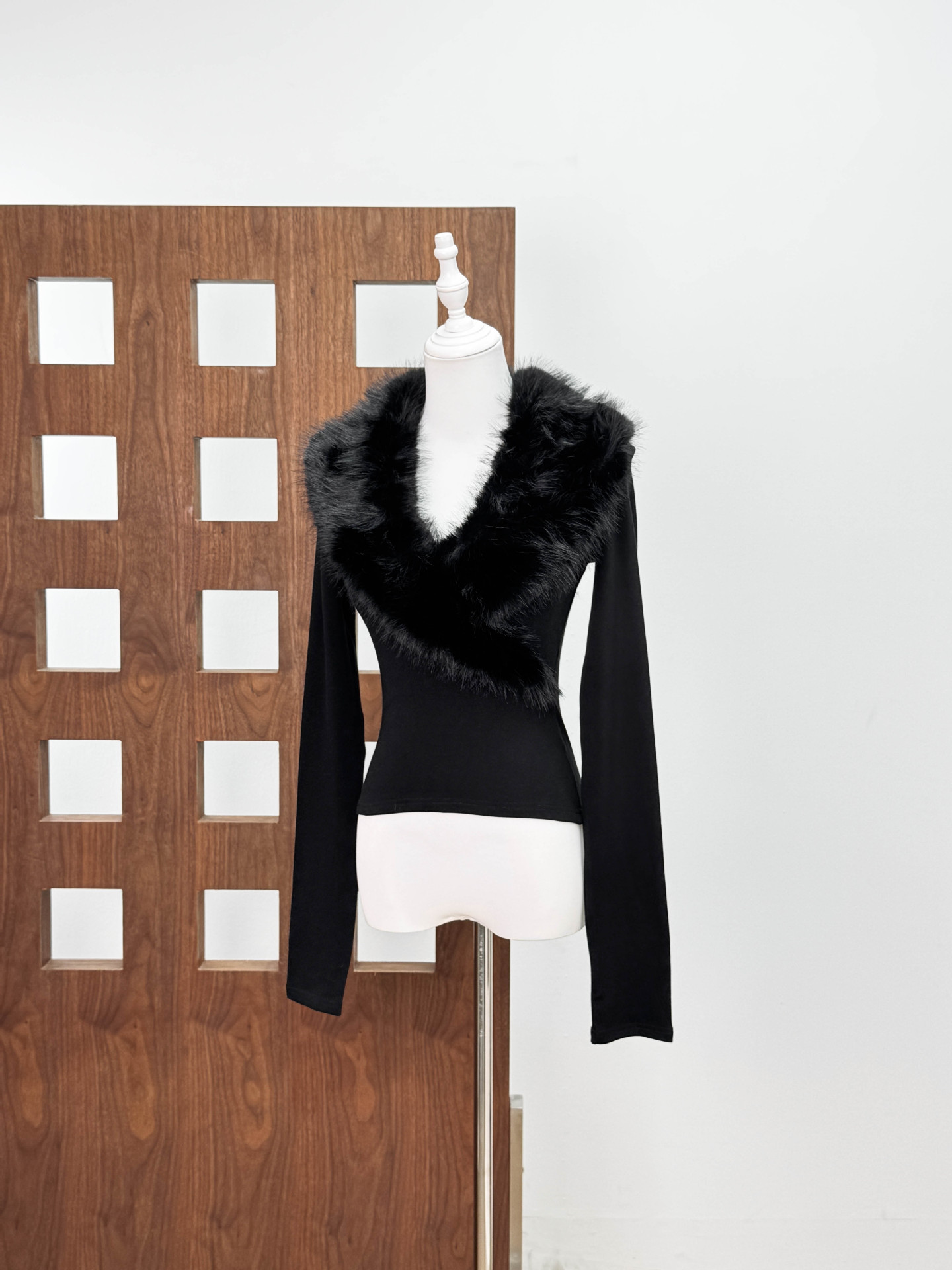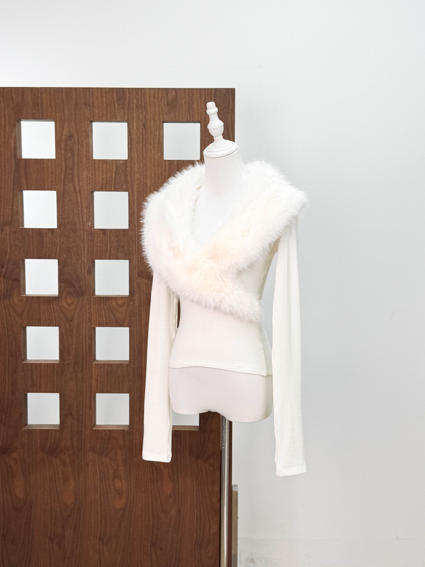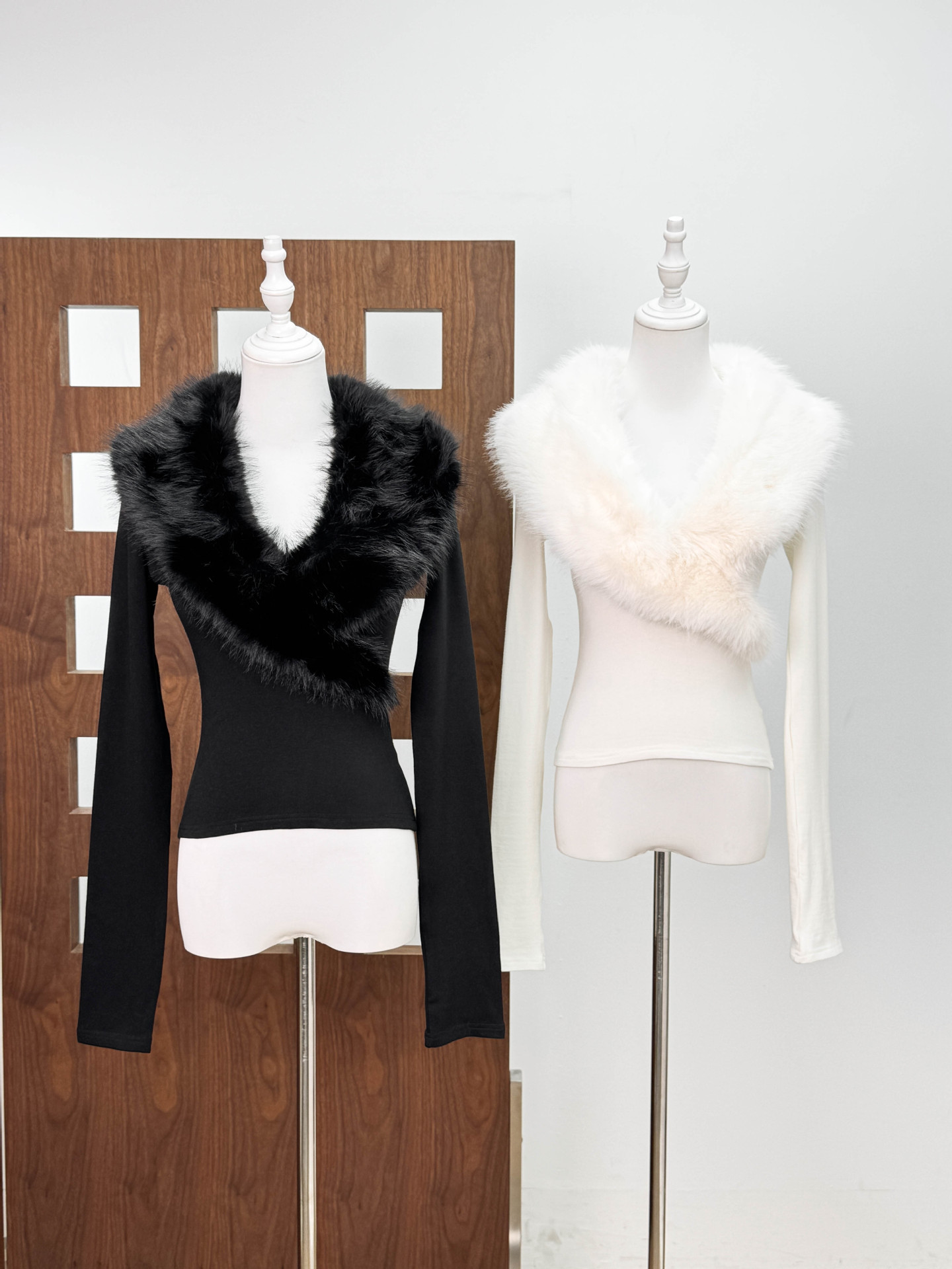 밀레니엄 스파이스 걸스 스타일 화이트 모피 칼라 티셔츠 여성용 슬림 핏 우아한 틈새 디자인 긴팔 친환경 모피 니트 탑