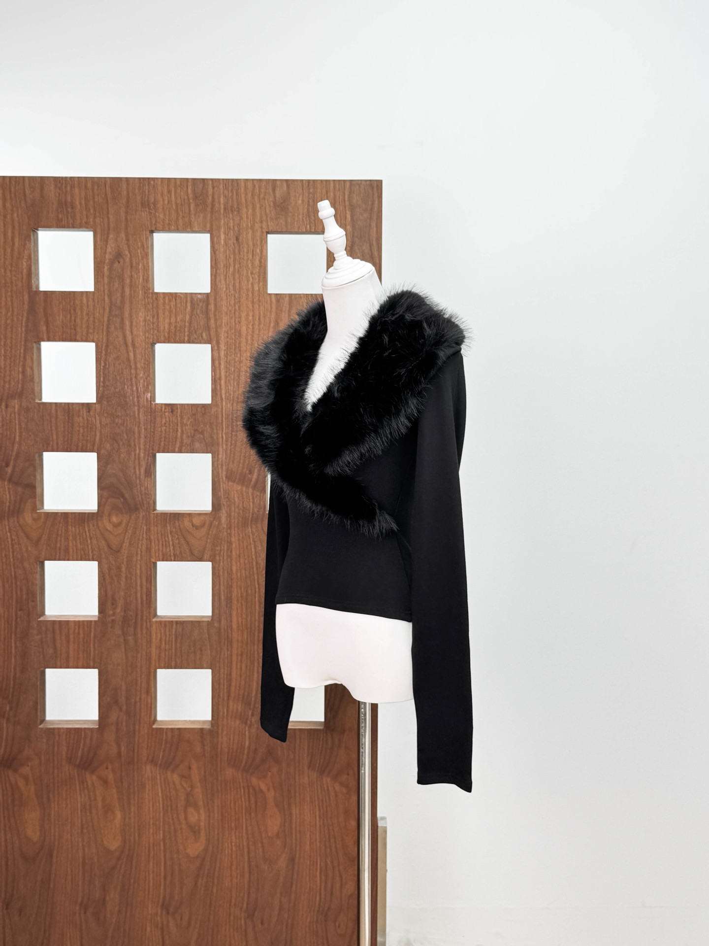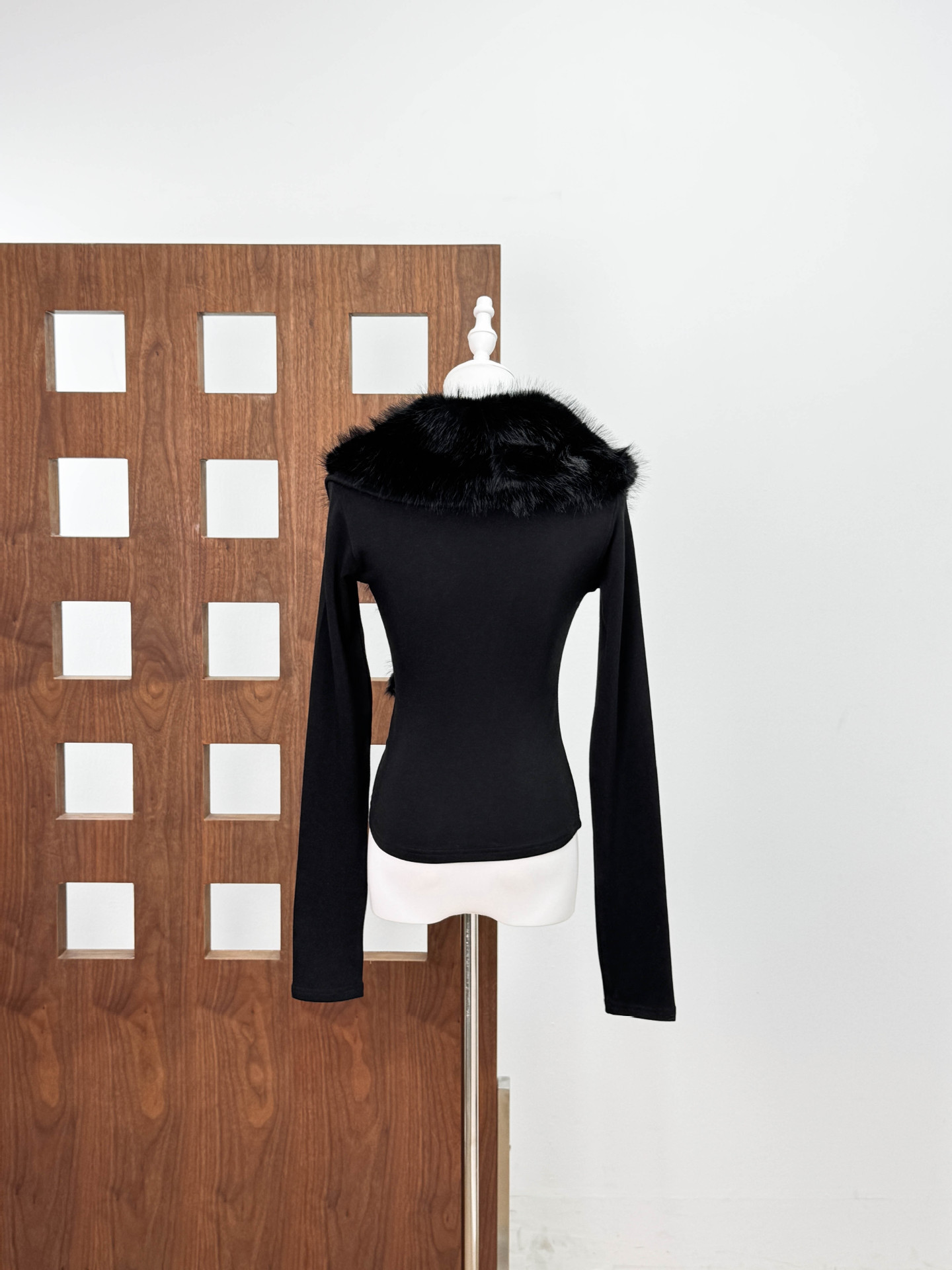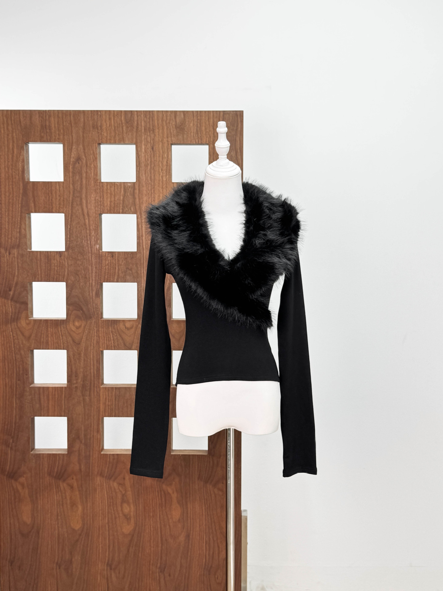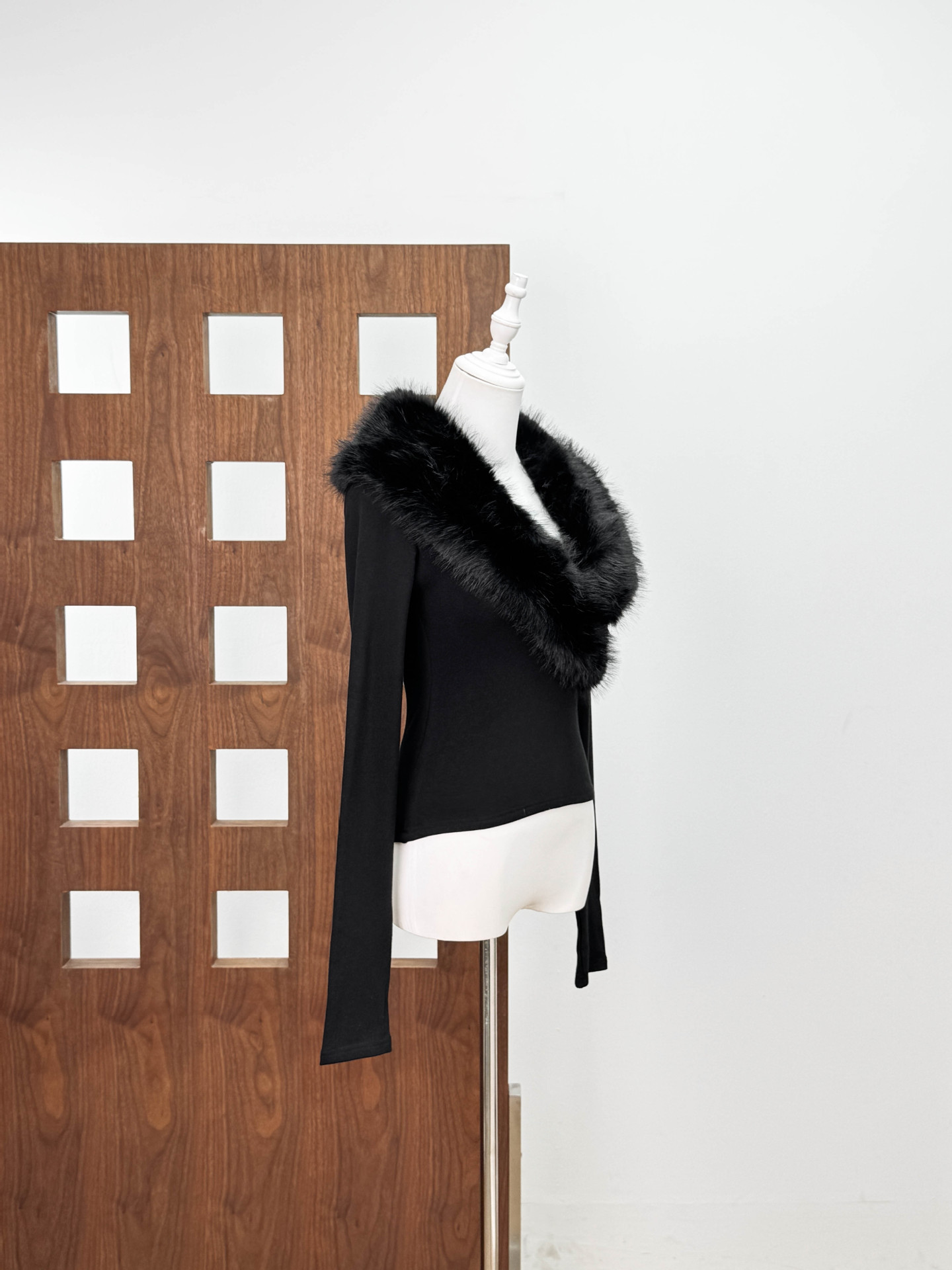 밀레니엄 스파이스 걸스 스타일 화이트 모피 칼라 티셔츠 여성용 슬림 핏 우아한 틈새 디자인 긴팔 친환경 모피 니트 탑