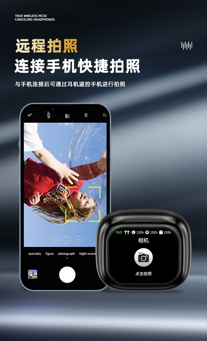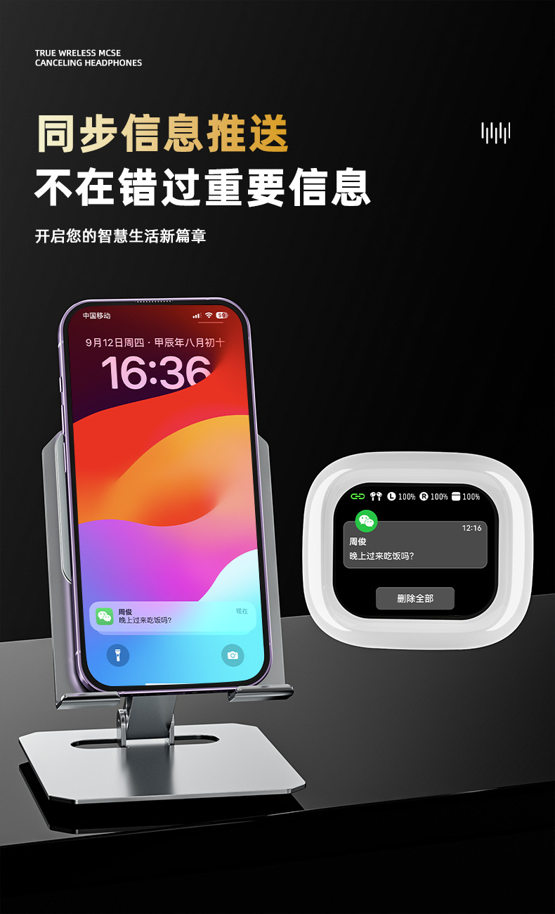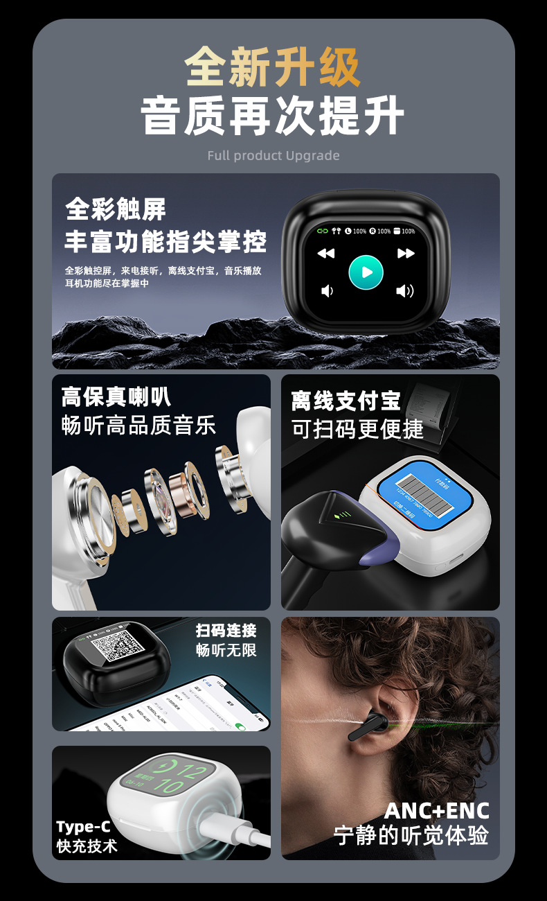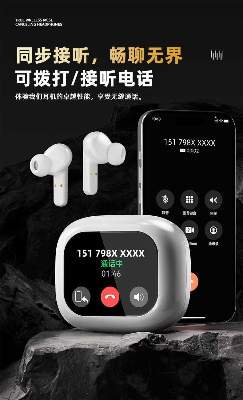 국경 직접 공급 WT-7 블루투스 헤드셋 LCD 풀 컬러 스마트 디스플레이 터치 스크린 TWS 무선 헤드셋 ANC 소음 감소