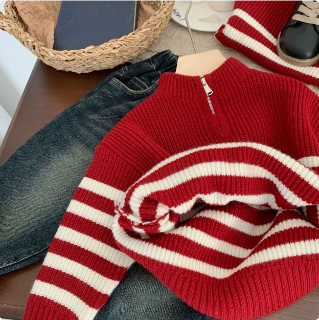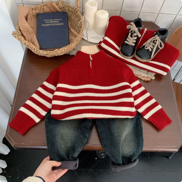 통싱위안 아동용 스웨터 2025 겨울 신상 한국 스타일 줄무늬 남아 니트웨어 축제용 옷 유행 상의