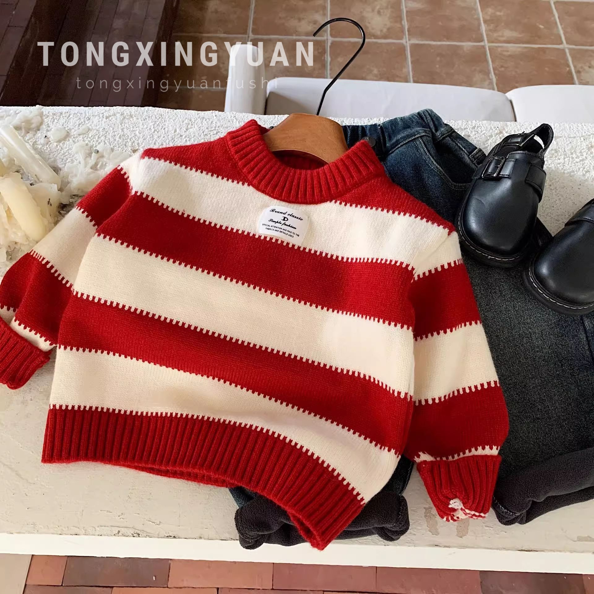 통싱위안 아동용 스웨터 2025 겨울 신상 한국 스타일 줄무늬 남아 니트웨어 축제용 옷 유행 상의스토어 가기