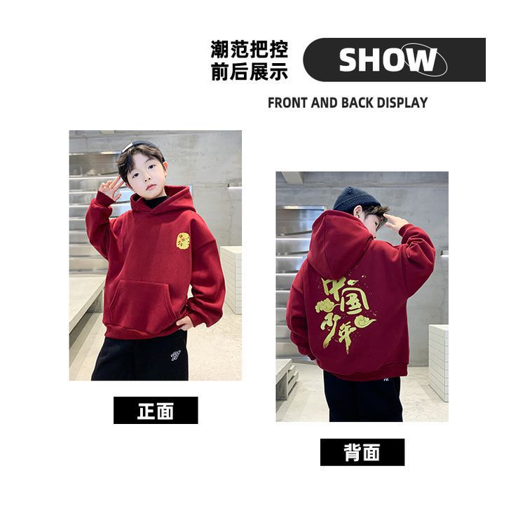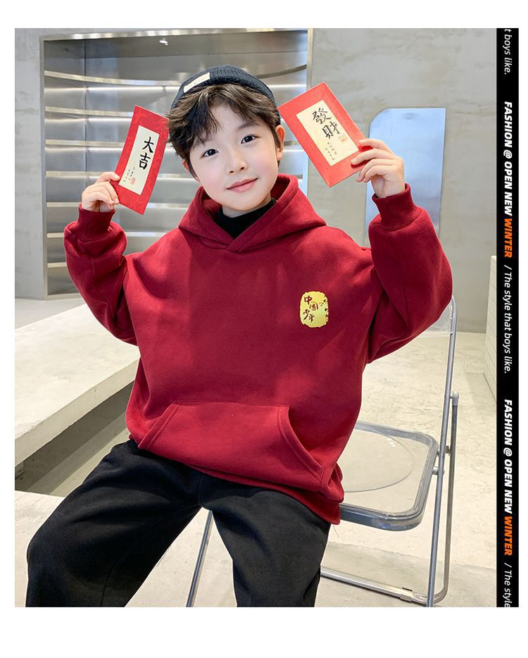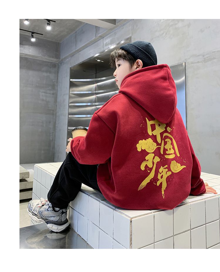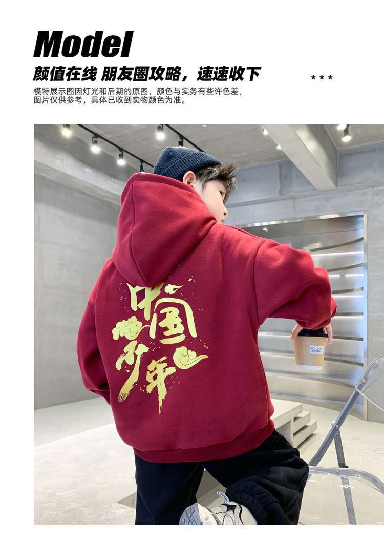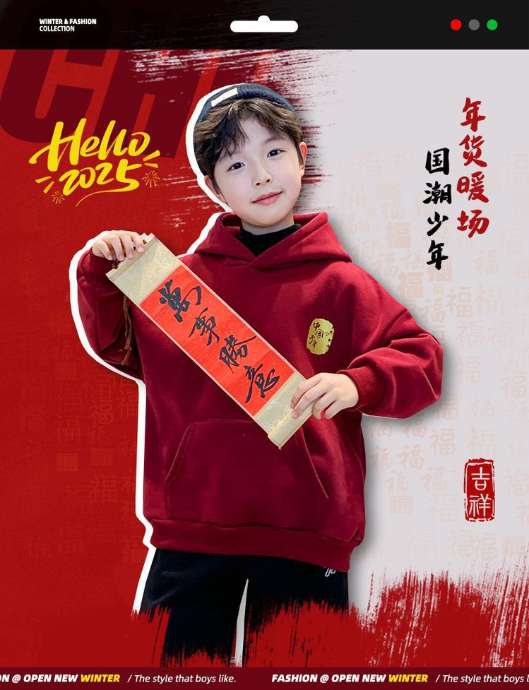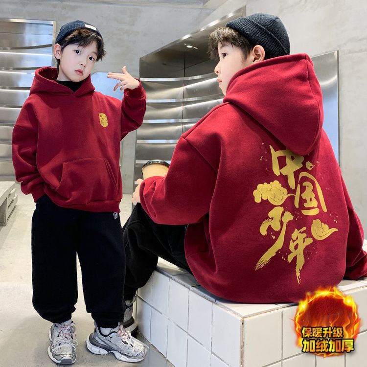 중국 스타일 소년의 겨울 기모 후드 스웨트 큰 어린이 빨간 새해 옷 머리카락을위한 두꺼운 올 매치 탑