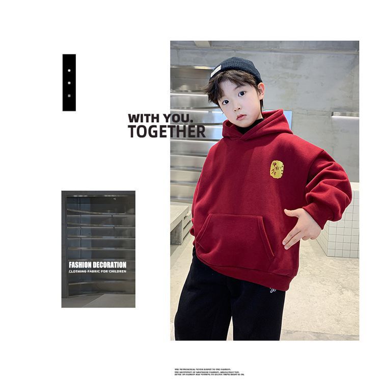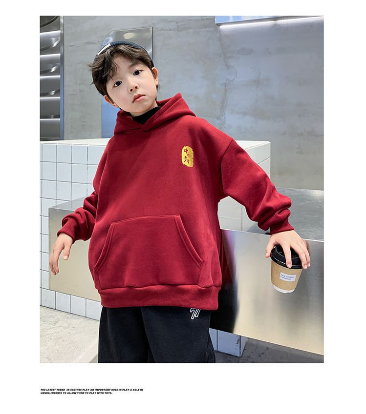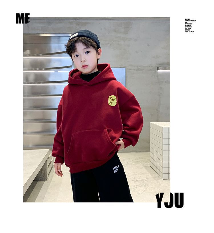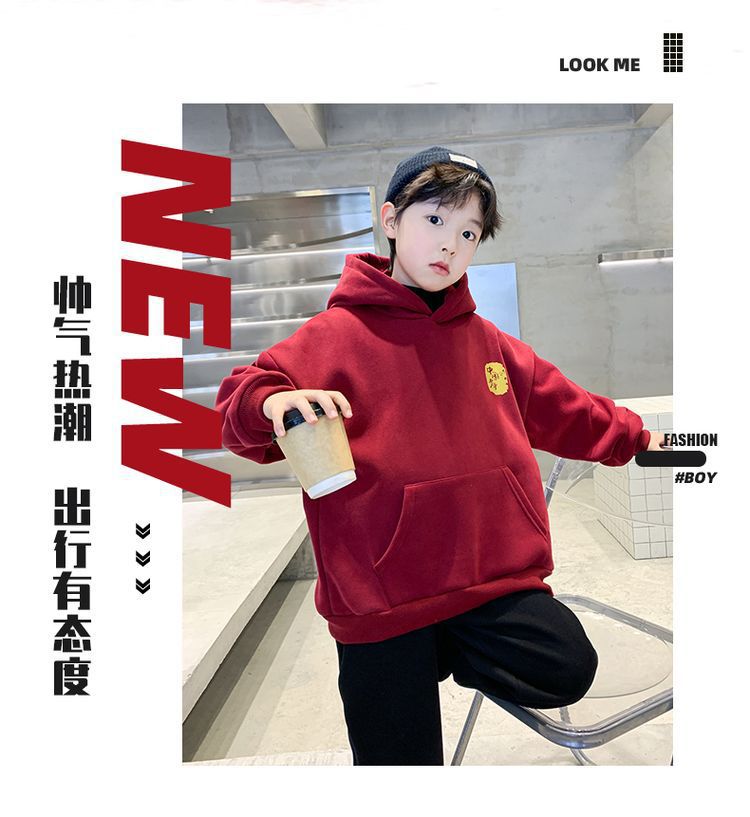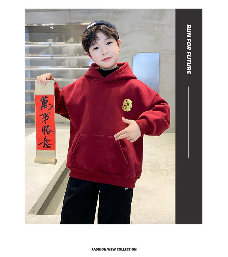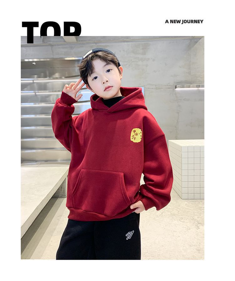 중국 스타일 소년의 겨울 기모 후드 스웨트 큰 어린이 빨간 새해 옷 머리카락을위한 두꺼운 올 매치 탑