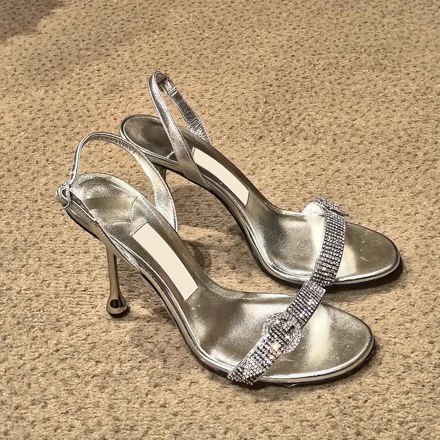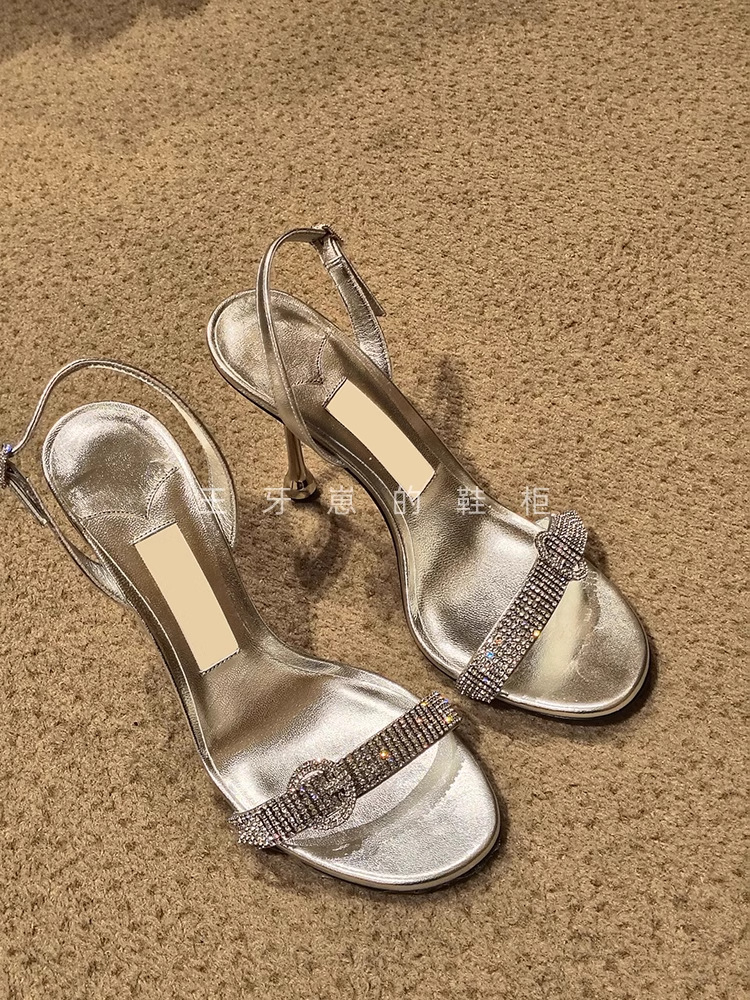2025 봄과 여름 새로운 도착 라인스톤 스트랩 샌들 여성용 스틸레토 힐 섹시 오픈 발가락 아우터 라운드 발가락 실버 하이힐스토어 가기
