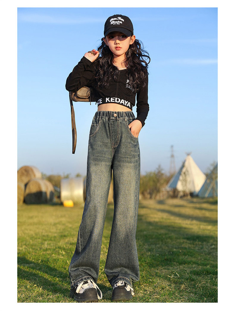 소녀 넓은 다리 청바지 봄과 가을 2025 새로운 패션 큰 어린이 스트레이트 다리 바지 세련된 소녀 봄 바지