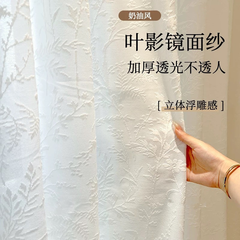 “浮光叶影窗纱提花浮雕透光不透人客厅阳台卧室法式美式白色米色纱”