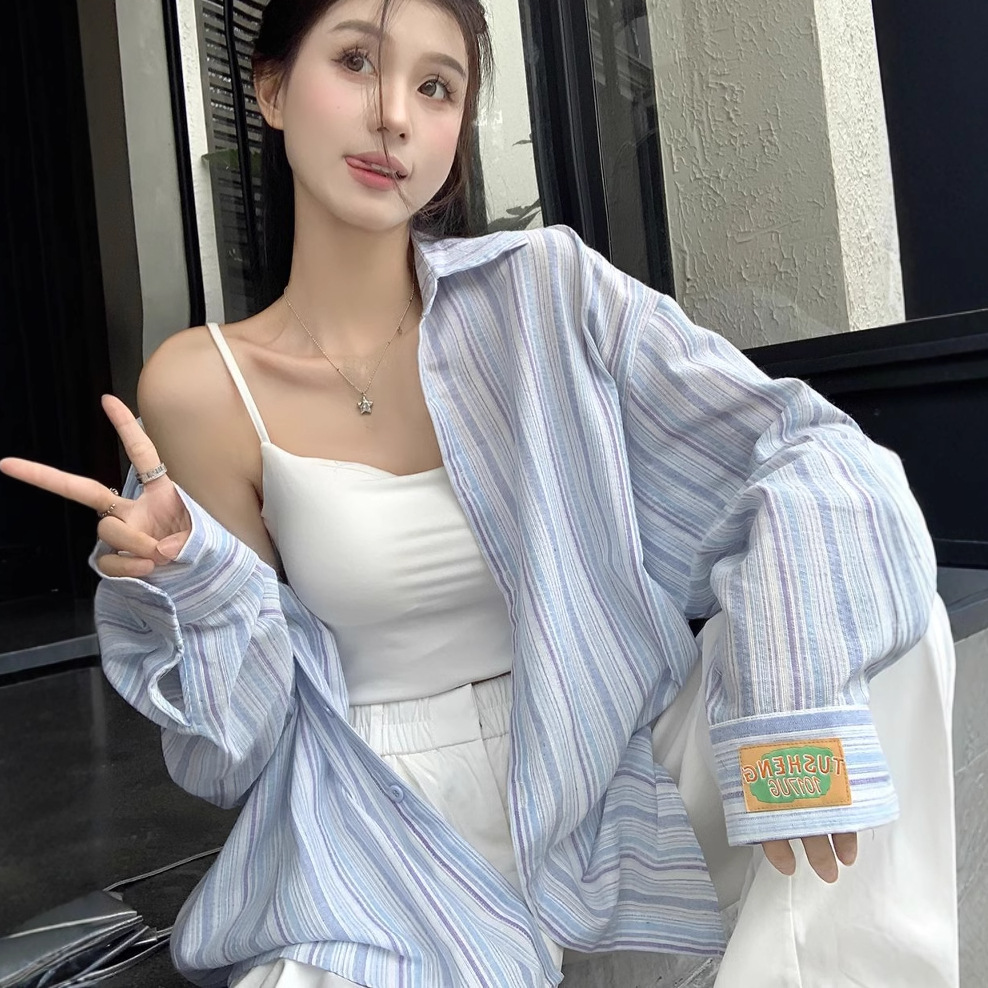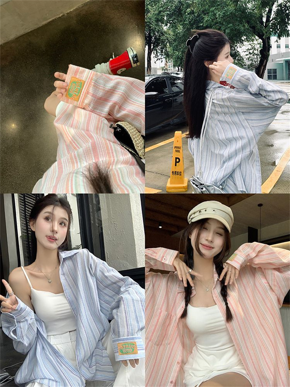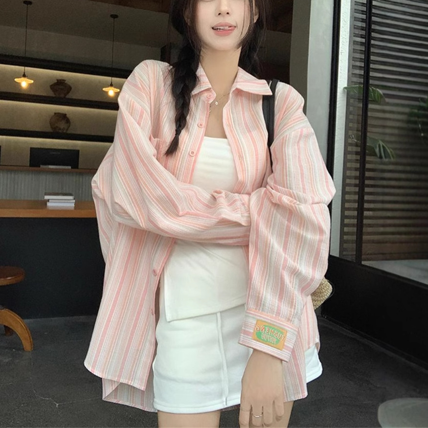 스트라이프 긴 소매 셔츠 여성의 여름 얇은 느슨한 폴로 칼라 선 스크린 셔츠 중간 길이 최고 공장 도매스토어 가기