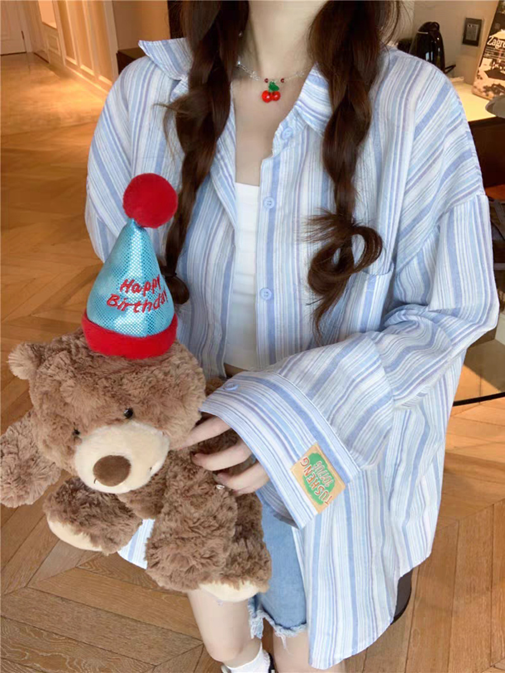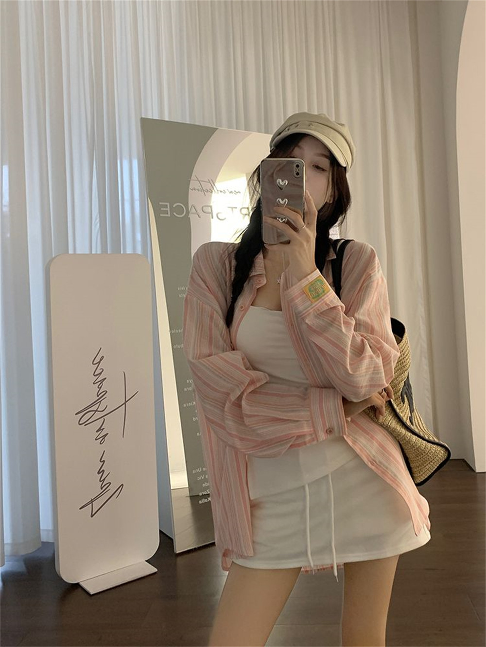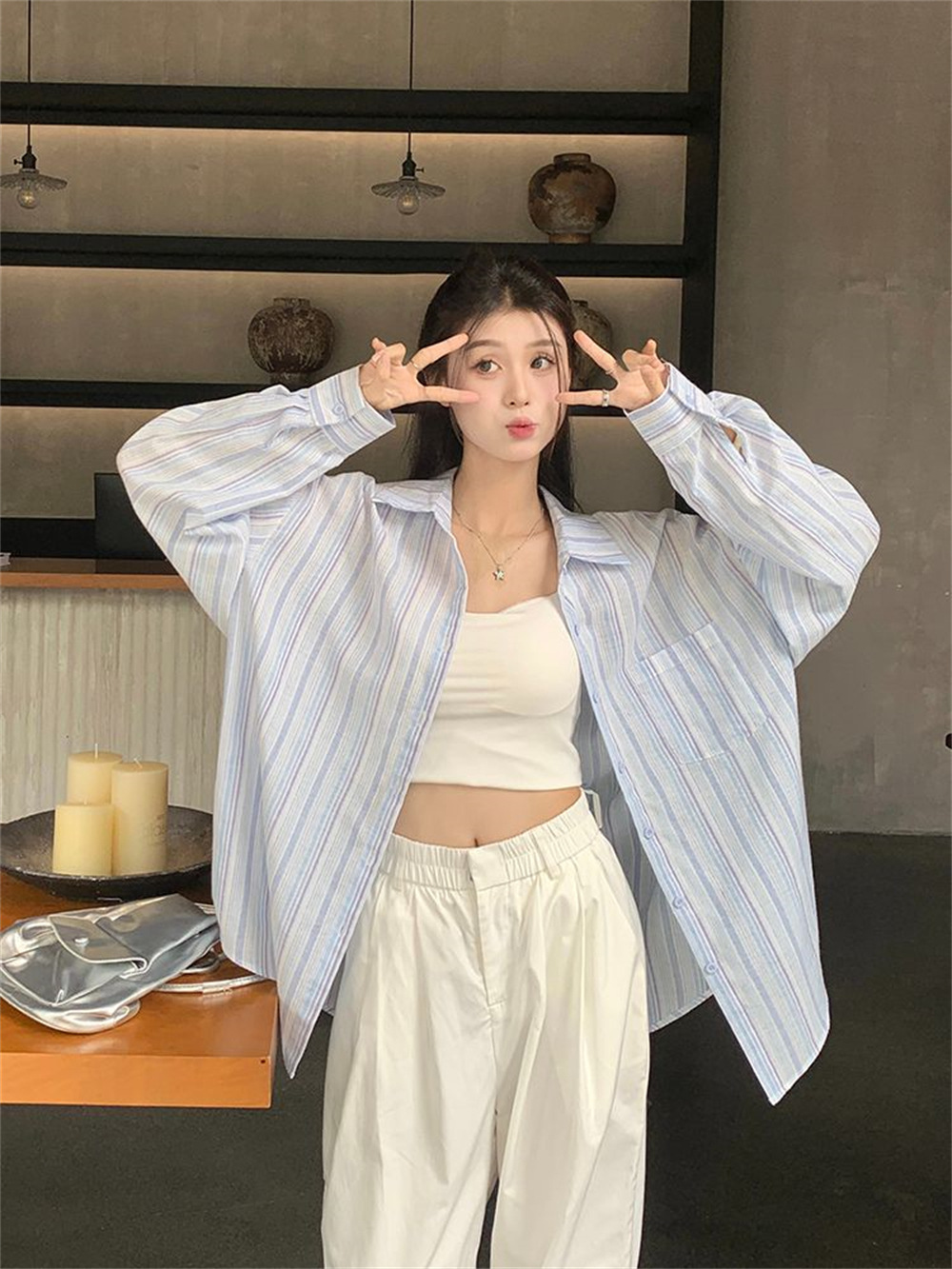 스트라이프 긴 소매 셔츠 여성의 여름 얇은 느슨한 폴로 칼라 선 스크린 셔츠 중간 길이 최고 공장 도매스토어 가기