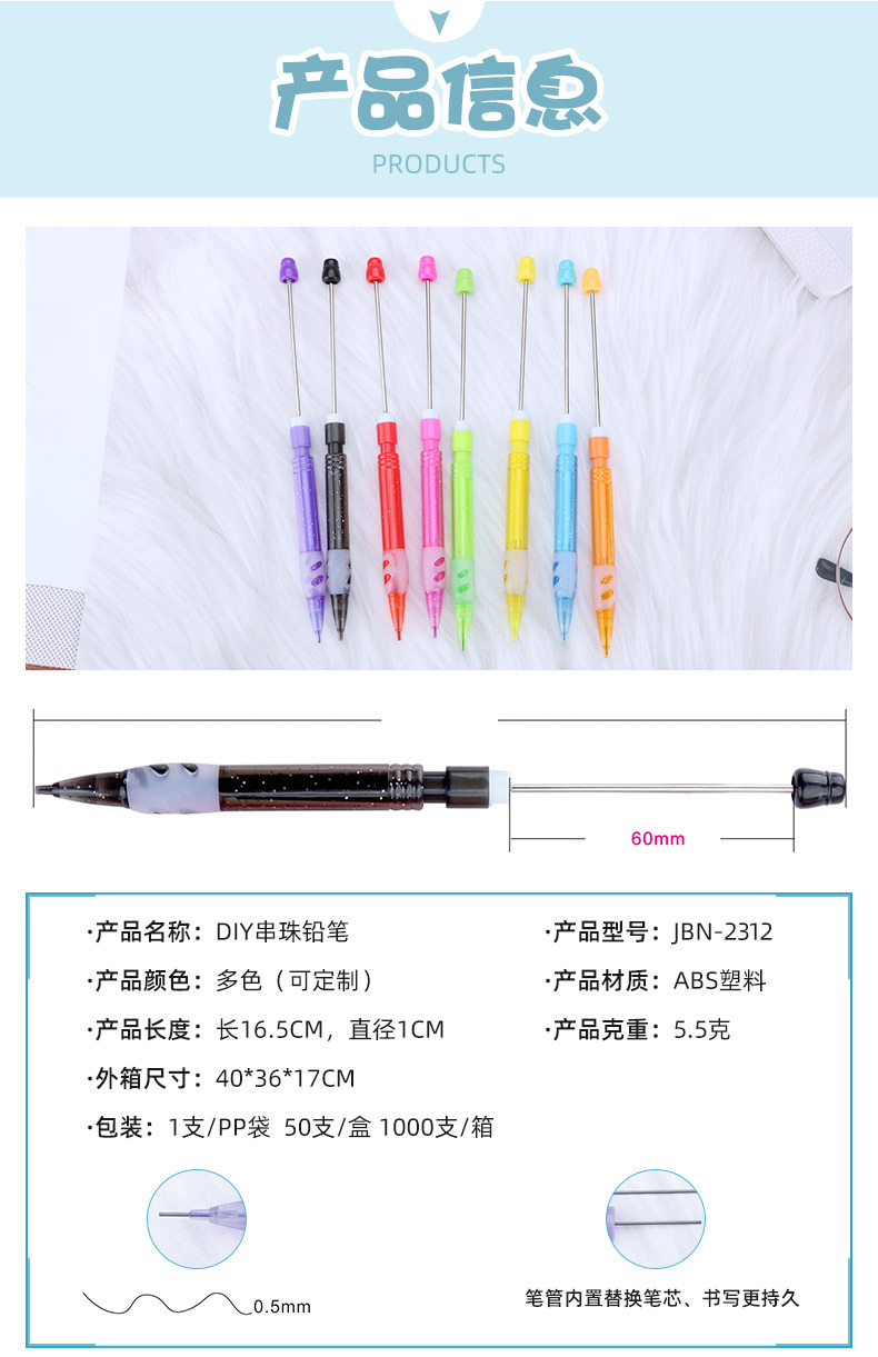 창조적 인 diy 구슬 연필 성격 간단한 0.5mm 연속 코어 자동 연필 학생 필기 연필 도매