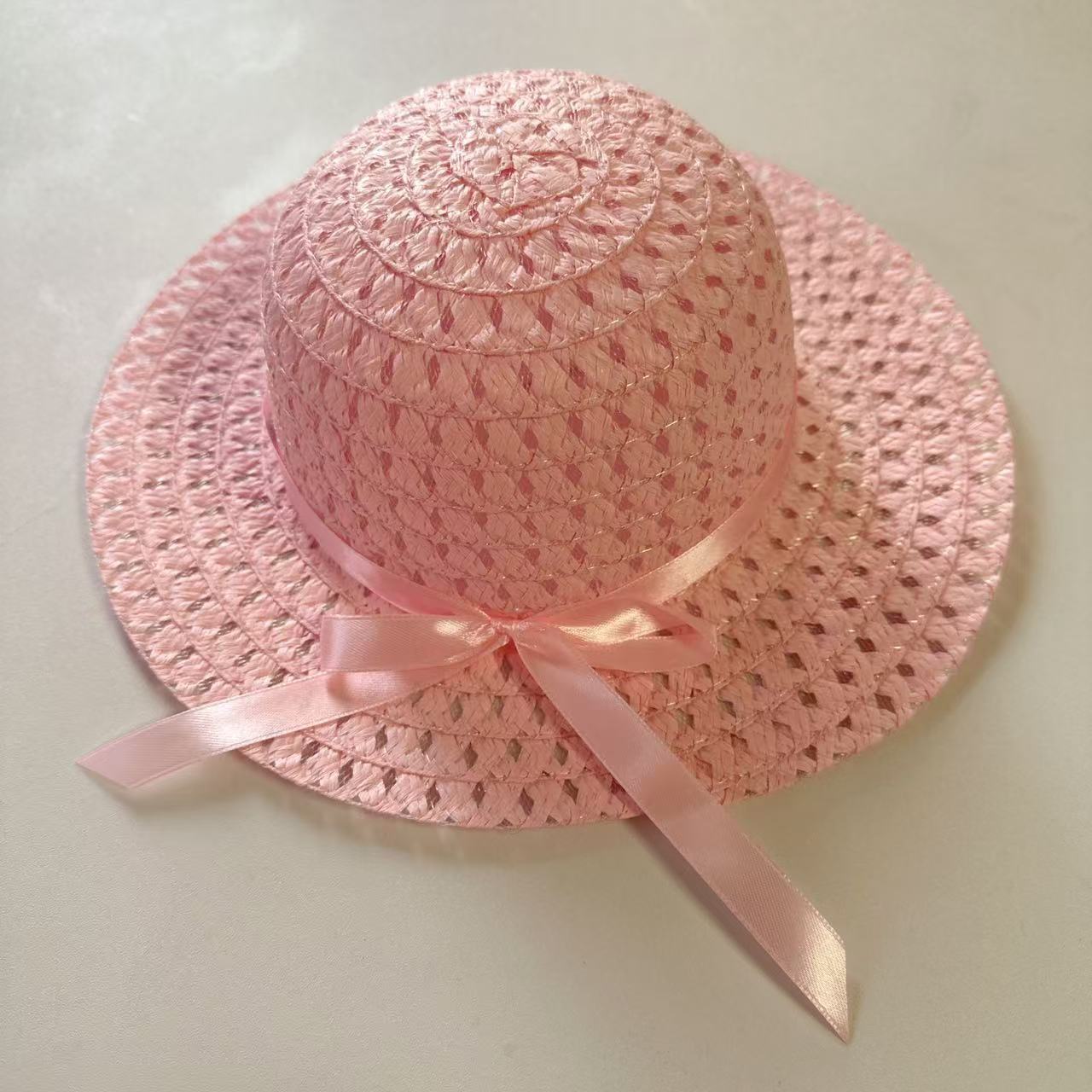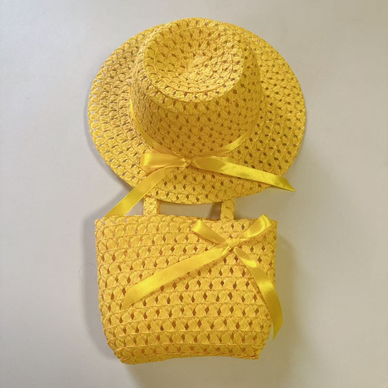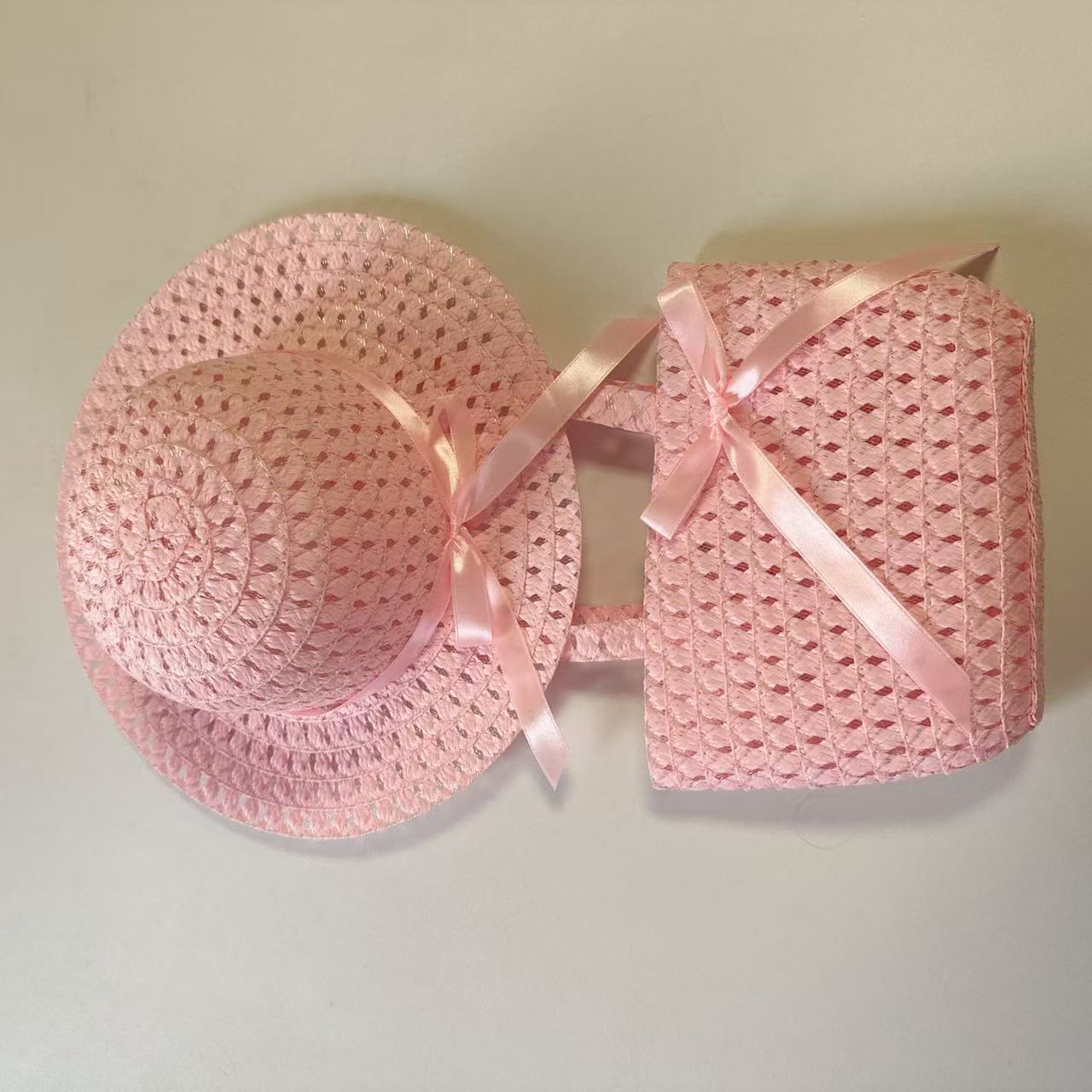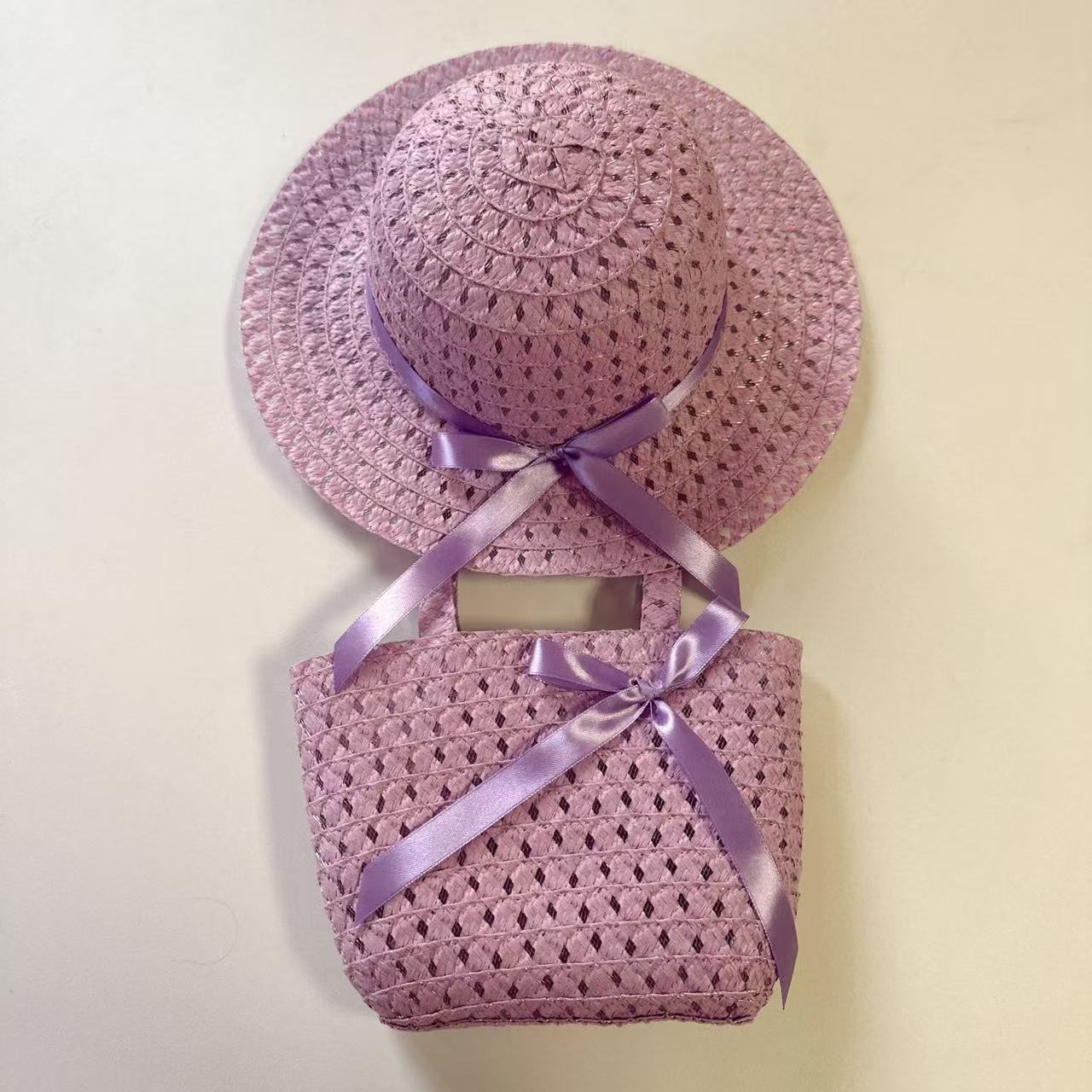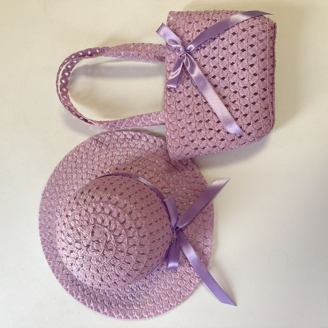 새로운 활 어린이 밀짚 모자 핸드백 세트 소녀 밀짚 태양 모자 해변 모자 도매