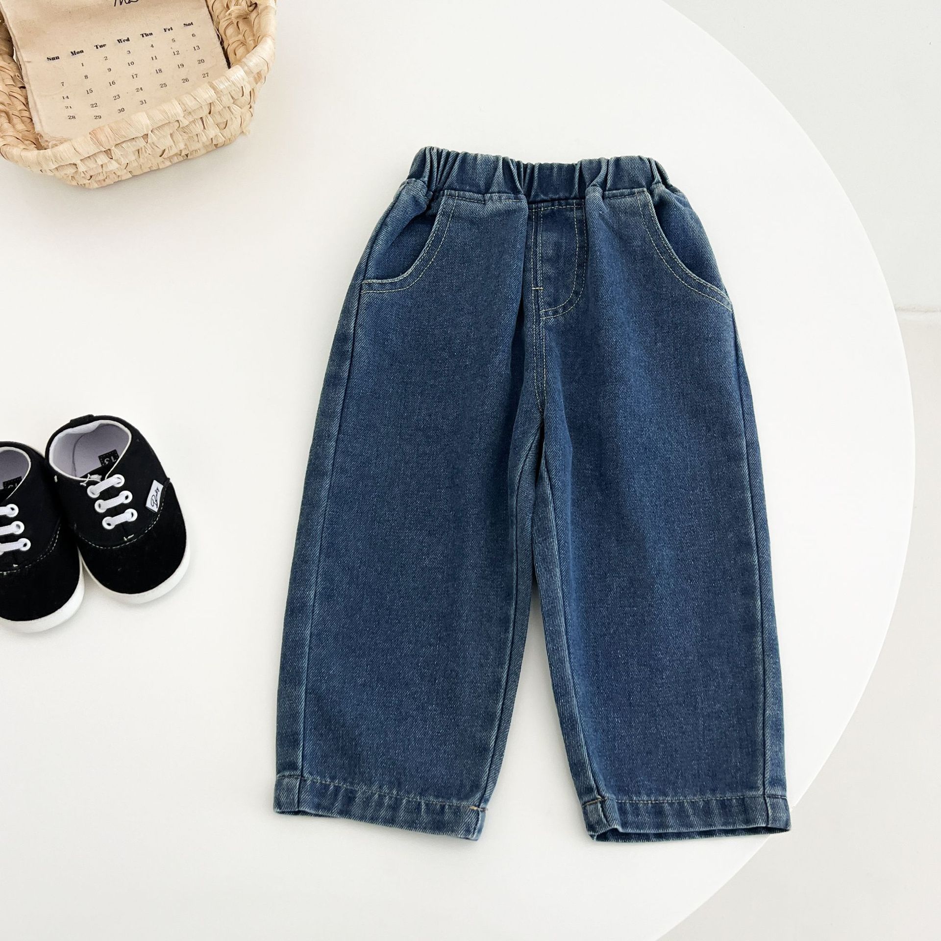 남학생과 여학생용 크로치가없는 한국식 단색 청바지 올매치 퓨어 코튼 바지 중 · 소형 어린이를위한 트렌디 한 봄 · 가을 새 바지