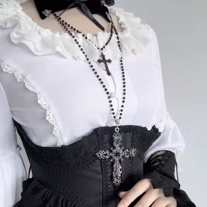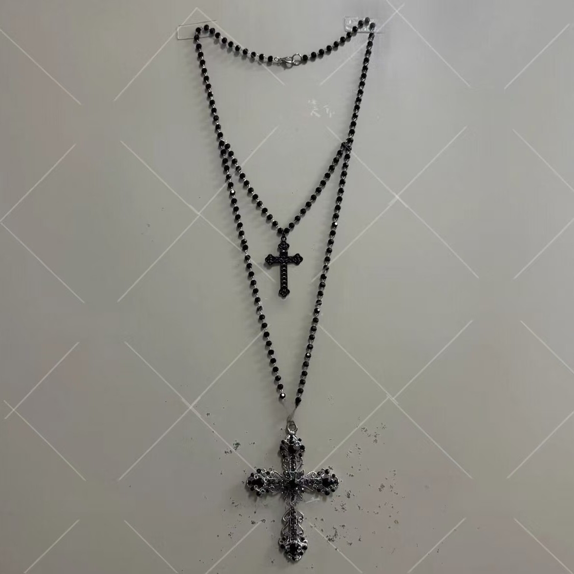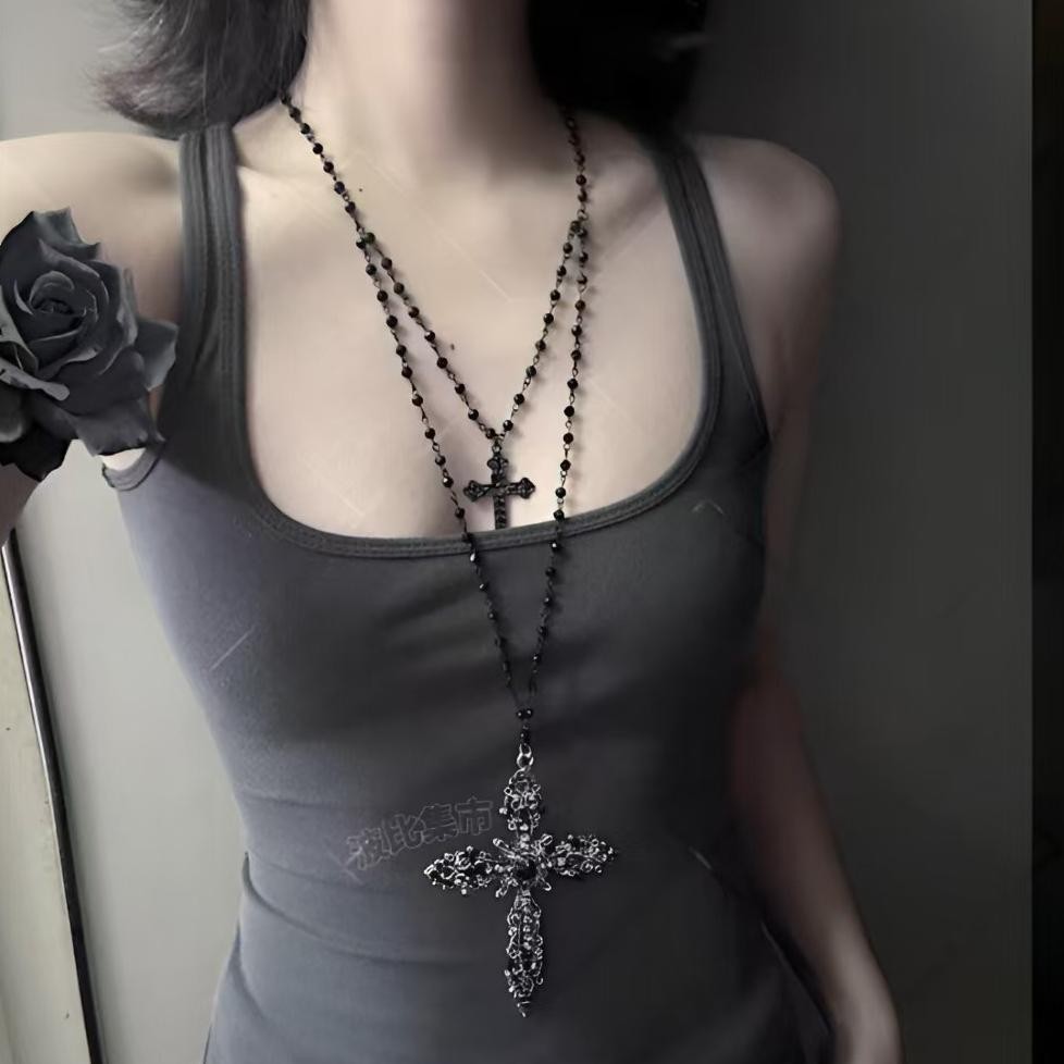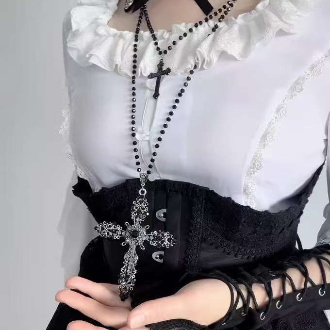 다크 콜드 스타일 고딕 스타일 블랙 로즈 구슬 크로스 긴 목걸이 틈새 빛 럭셔리 스파이스 소녀 모직 체인