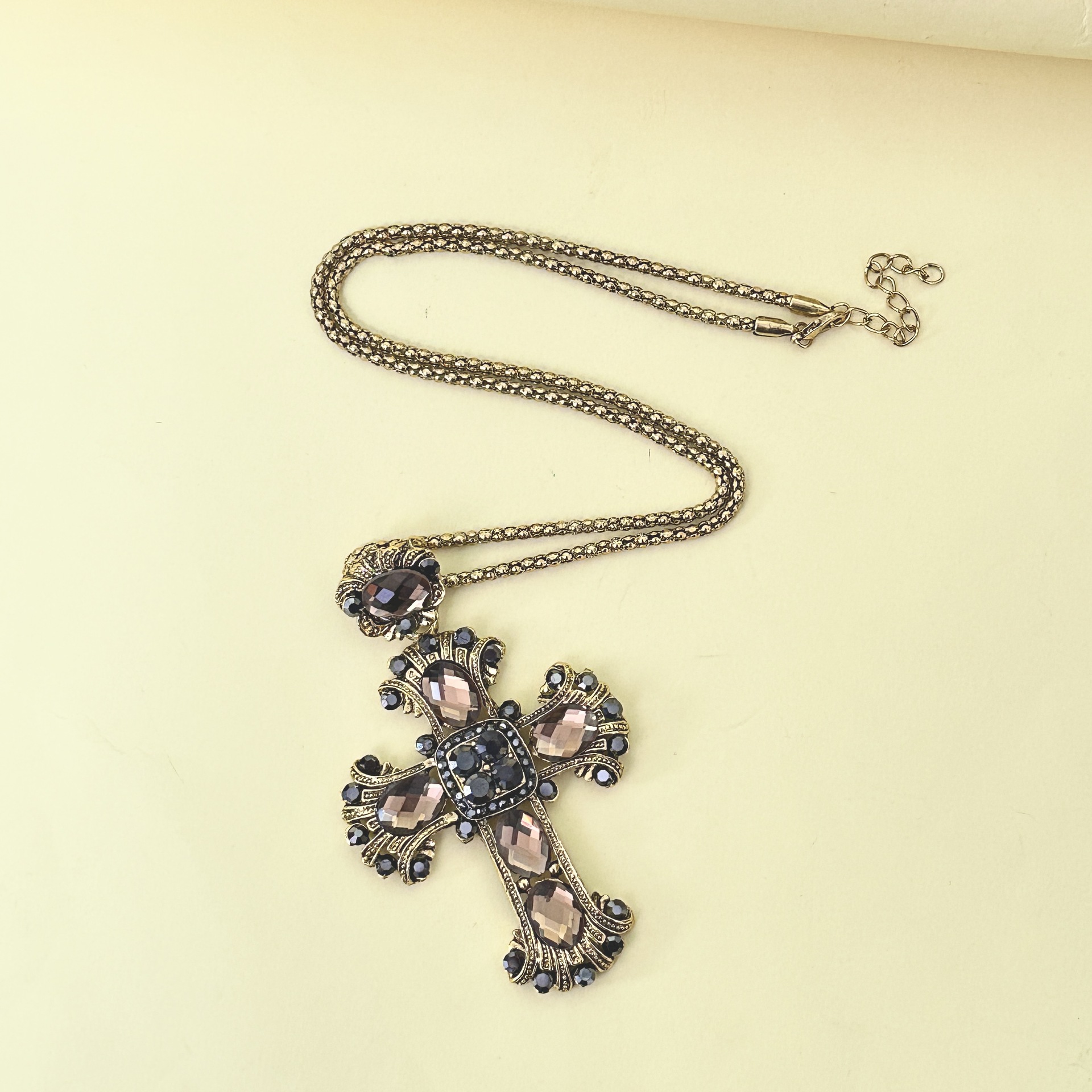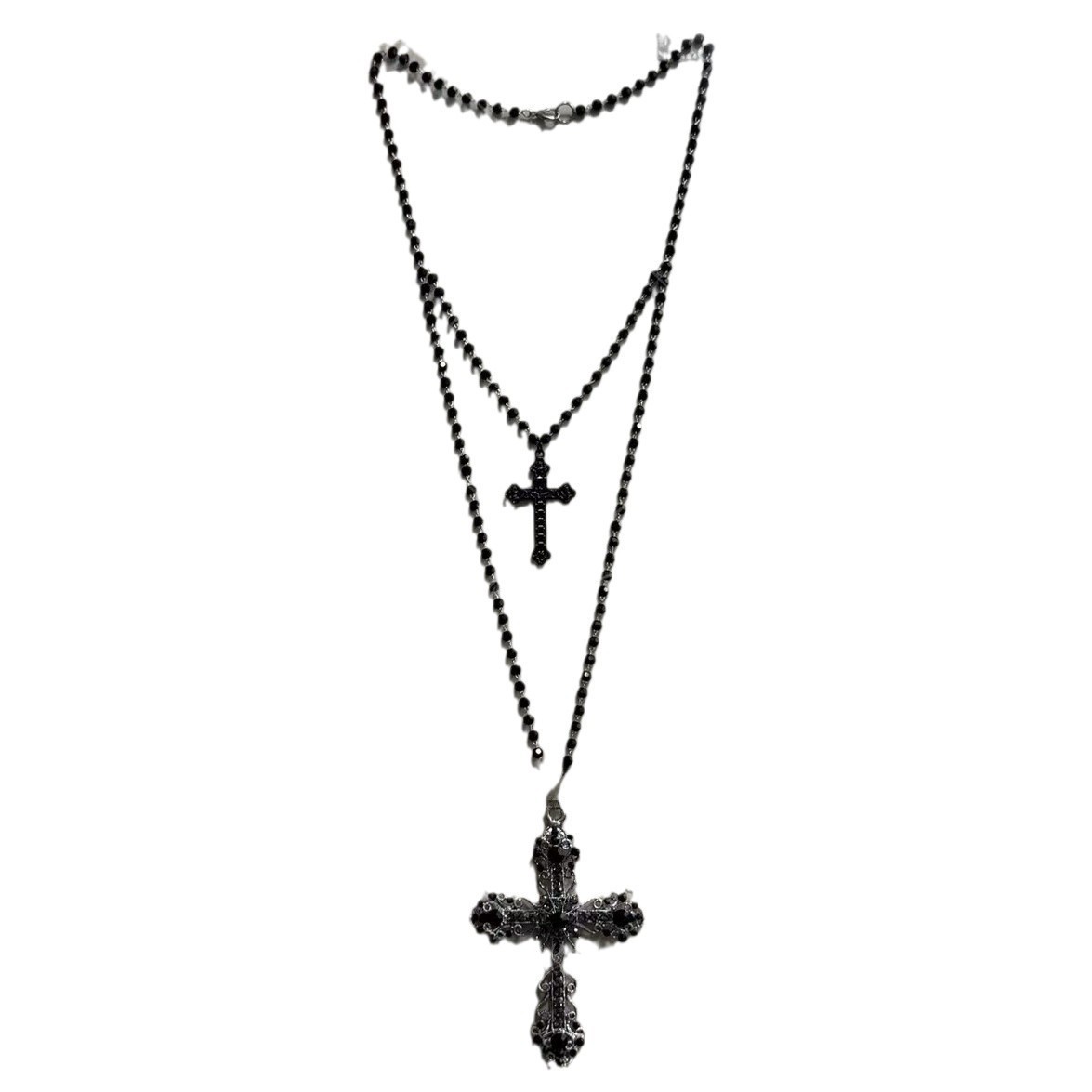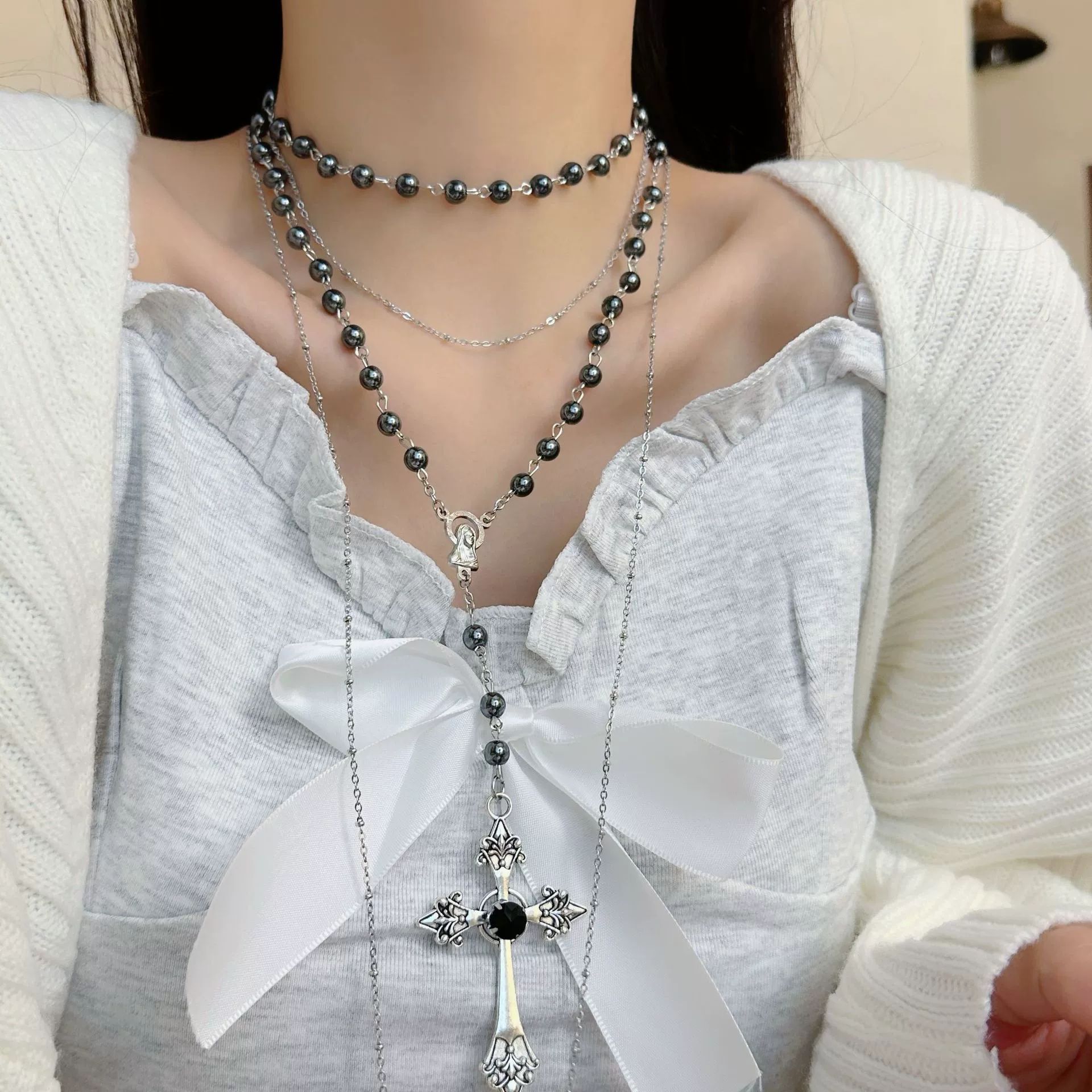 다크 콜드 스타일 고딕 스타일 블랙 로즈 구슬 크로스 긴 목걸이 틈새 빛 럭셔리 스파이스 소녀 모직 체인